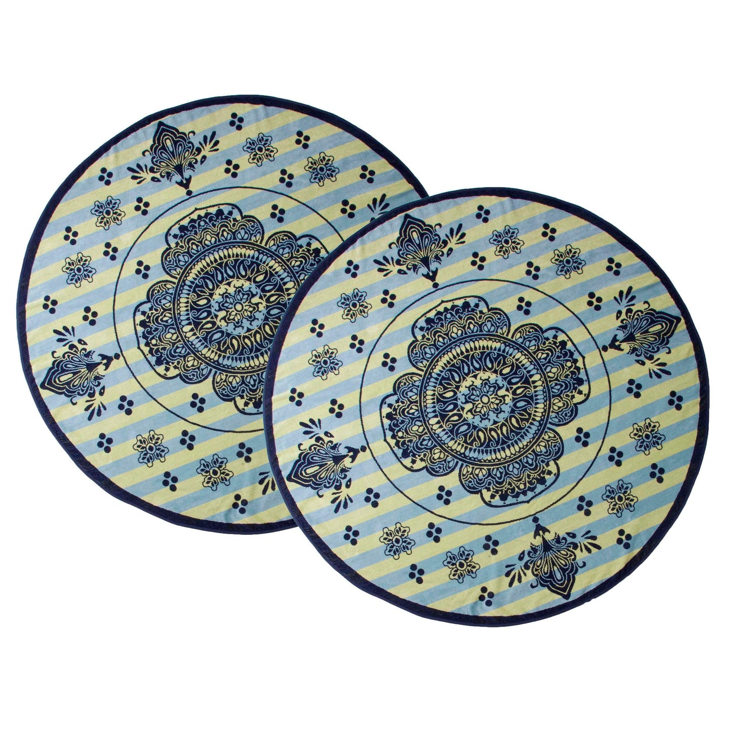Get ready to enjoy some fun in the sun with the 60" Round Beach Towel. Crafted from 100% Cotton, this Indie beach towel features an intricate swirling floral pattern in white resting over a foundation of royal blue. Molinillo beach towel features a bright geometric pattern in bright blue and green. Rangoli beach towel features a medallion and damasks resting atop a striped pattern in light blue and green.This charming towel is a must-have summertime accessory.This charming towel is a must-have summertime accessory. This stylish and functional design gets softer after every wash and features an absorbent 2-ply construction. Get ready to head to the pool, the ocean, or vacation with this gorgeous and unique beach towel.