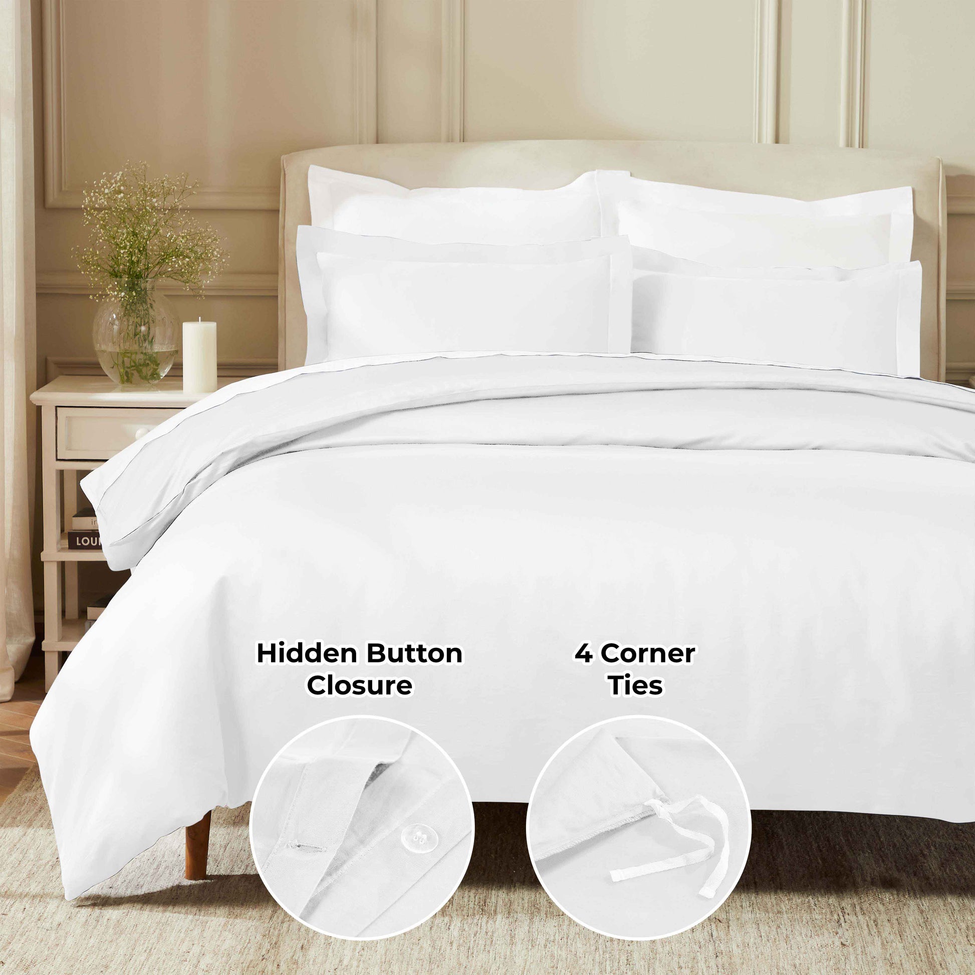Give your bedroom the perfect finishing touch with our Cotton 850 Thread Count Duvet Cover Set. Crafted from naturally soft Cotton, this duvet set has a buttery-smooth feel and a luminous sheen from the sateen weave finish. The extra-long fibers of Cotton are spun into fine, strong yarns making this material more breathable, plush and durable. This duvet cover fastens with clear, hidden buttons and inner corner ties to keep your duvet insert or comforter from shifting. Featuring an elegant solid pattern, this set of bedding essentials is available in a variety of sizes and color options for the perfect fit for your bedroom style.