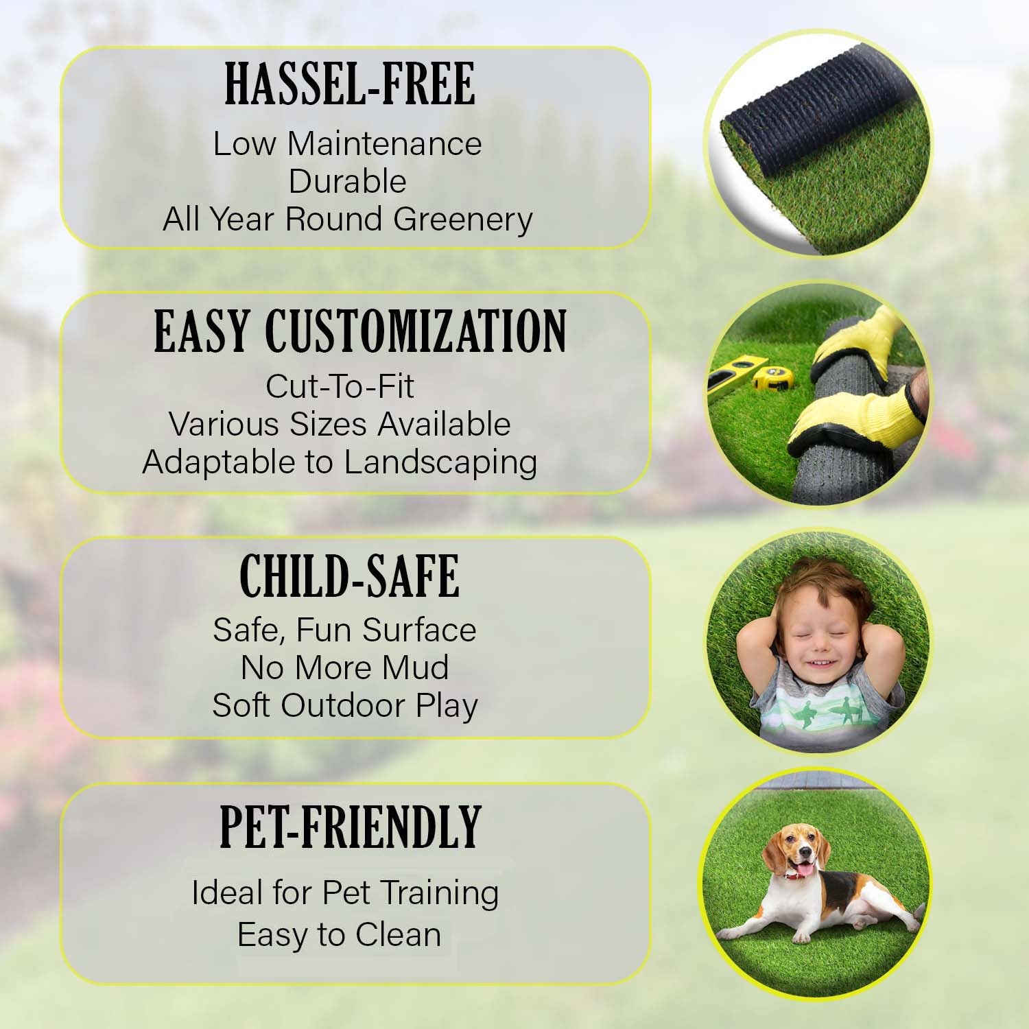Introduce a beautiful grassy foundation into your favorite space with our Artificial Grass Synthetic Lawn Indoor/ Outdoor Area Rug. Crafted from a highly durable polypropylene material, this artificial grass area rug can withstand outdoor weather and high foot traffic. Featuring holes in the backing, this piece is expertly crafted to drain excess water or potty training mess from pets. This rug is ideal for pet training or simply to add a vibrant splash of nature to your favorite space.
