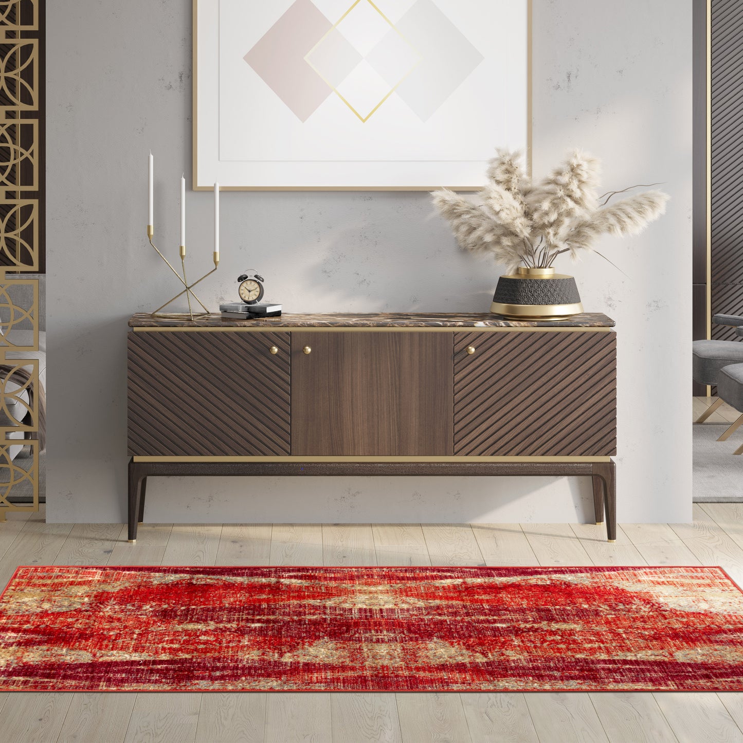 Refresh the style in your home with the modern and eye-catching design of the Brayton Indoor Area Rug. Made with 100% Nylon fibers and a soft 0.18 inch pile height, this rug can handle the busiest rooms of your home while remaining cozy underfoot. Featuring vibrant shades of reds and oranges across a soothing backdrop, the bold appearance of this rug will give your home an artistic foundation. This rug has non-slip backing making it the perfect addition for your bedroom, living room, entryway or office. For your convenience, this rug is easy to care for and machine washable.