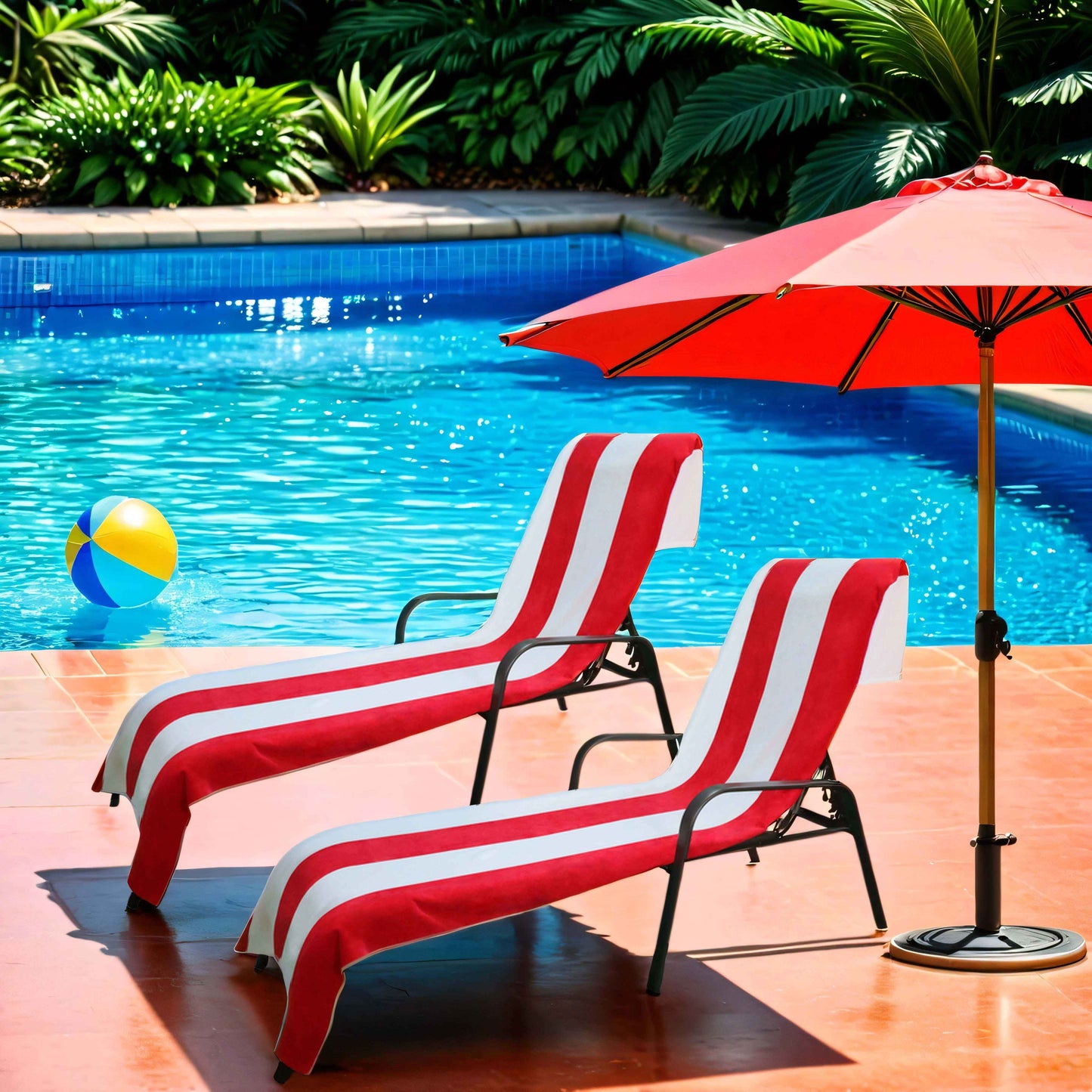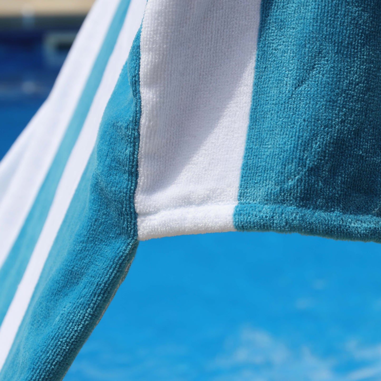 Protect your beach chairs and lay out in the sun comfortably with our Cabana Striped Lounge Chair Cover Set. Crafted from Cotton, the textured terry loop design of these covers helps get you dry quickly after a dip in the pool and helps shield your chair cushions from sunscreen, saltwater, or chlorine. These chair covers have an extra back flap to protect the top of the seat, so you can have total peace of mind while you enjoy fun in the sun. Any extra length can be draped or tucked under to fit snuggly. For added durability, this chair cover doubles as a towel and features lock-stitched hems for a clean, streamlined finish. This bold cabana striped pattern is available in a variety of vibrant color options to add a touch of playful charm to your chairs.