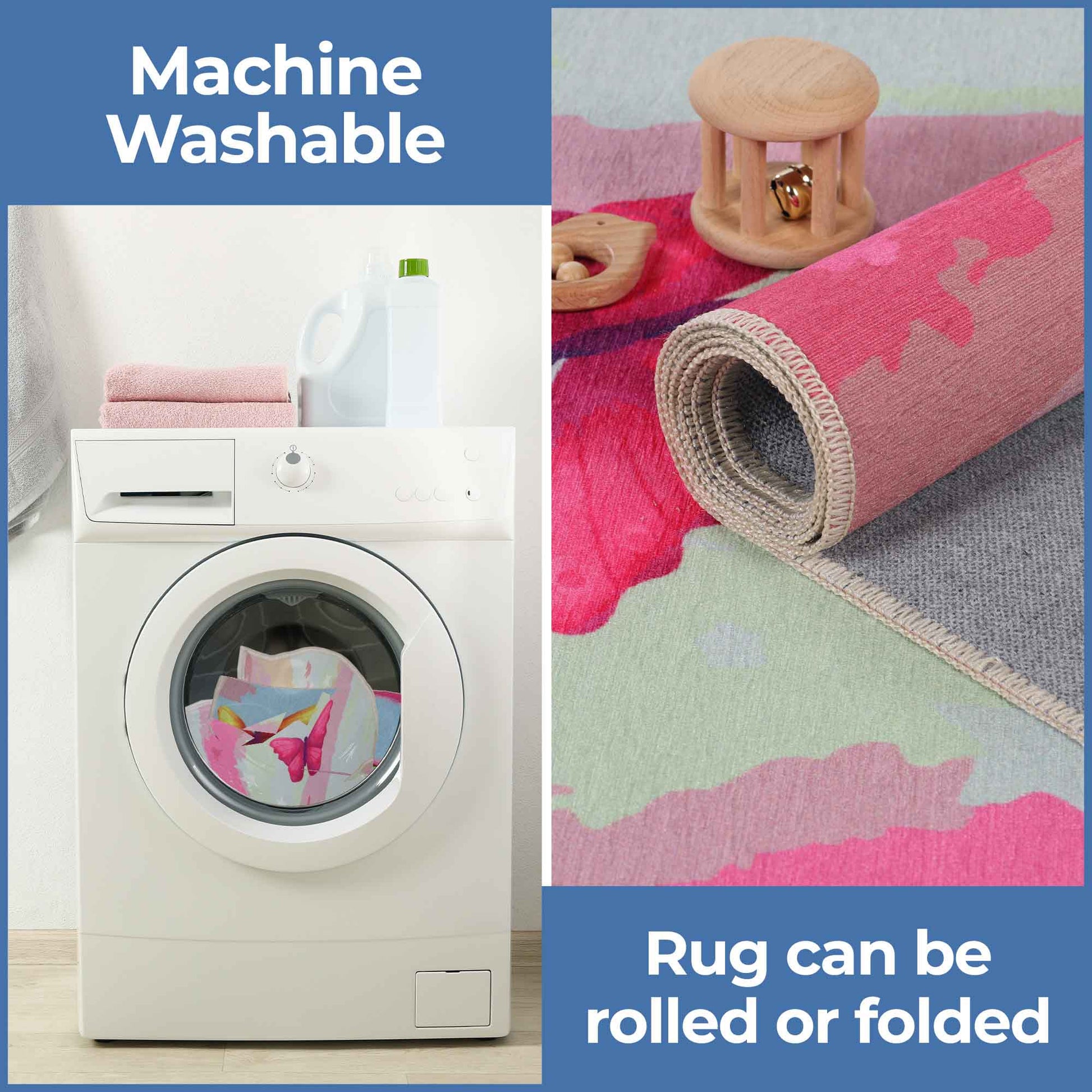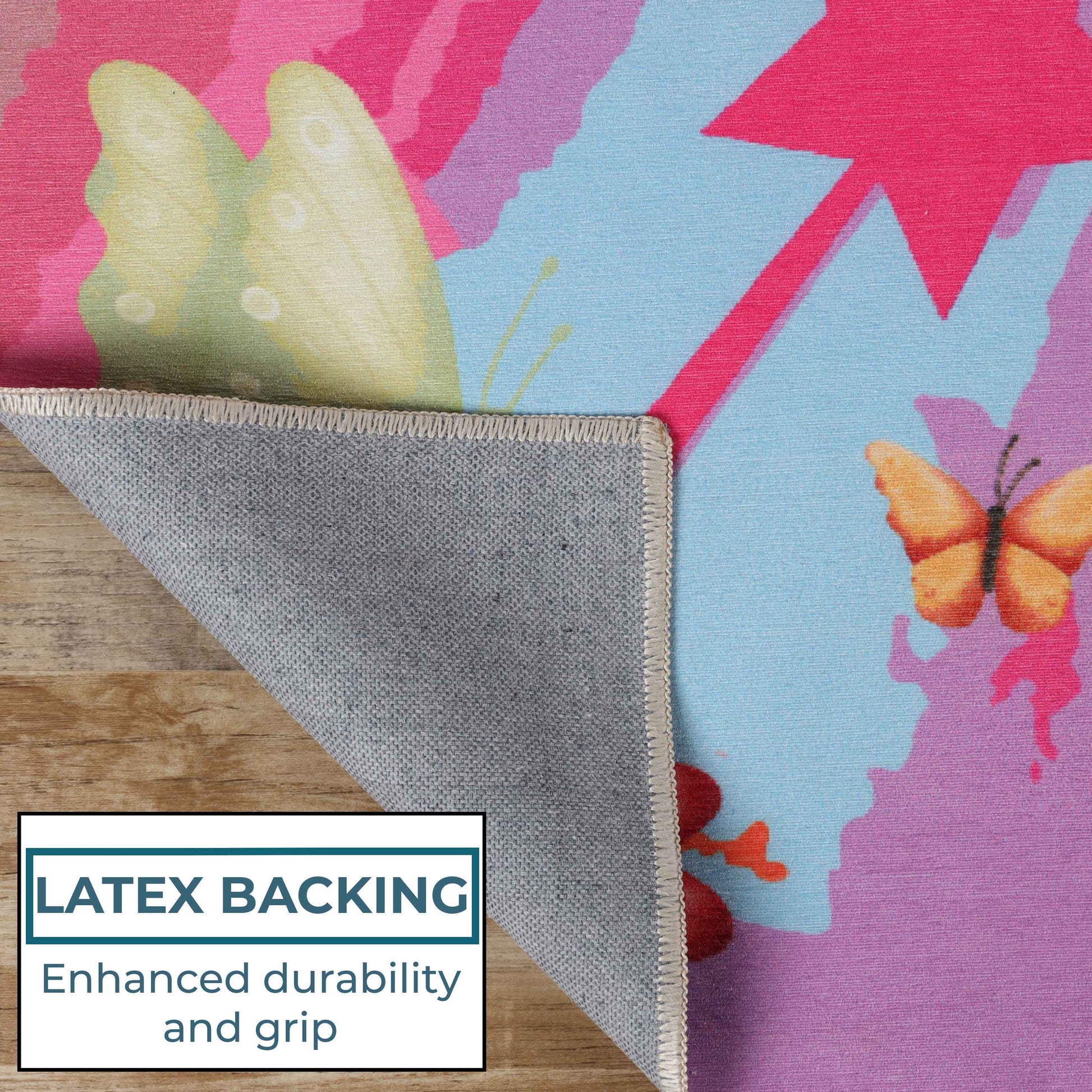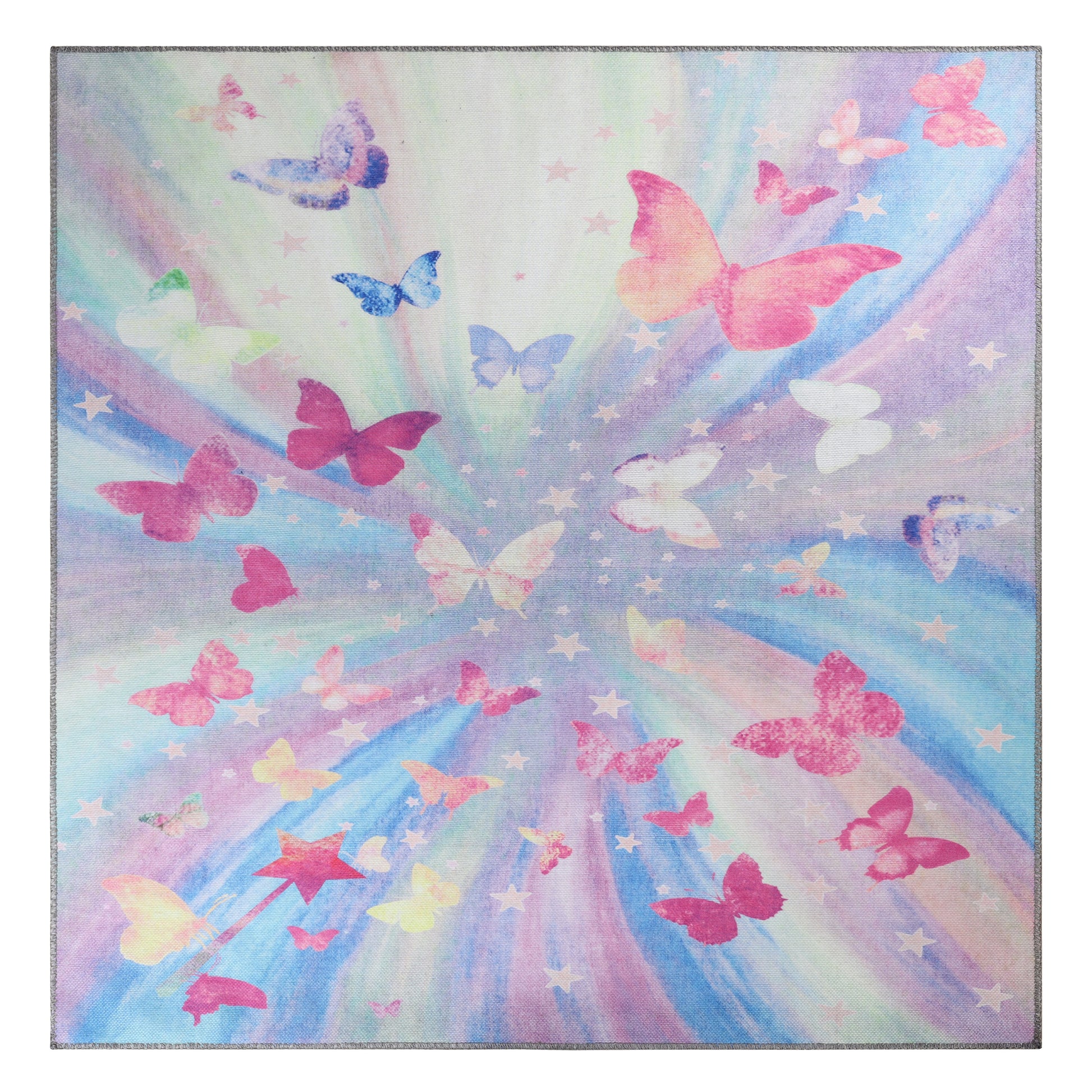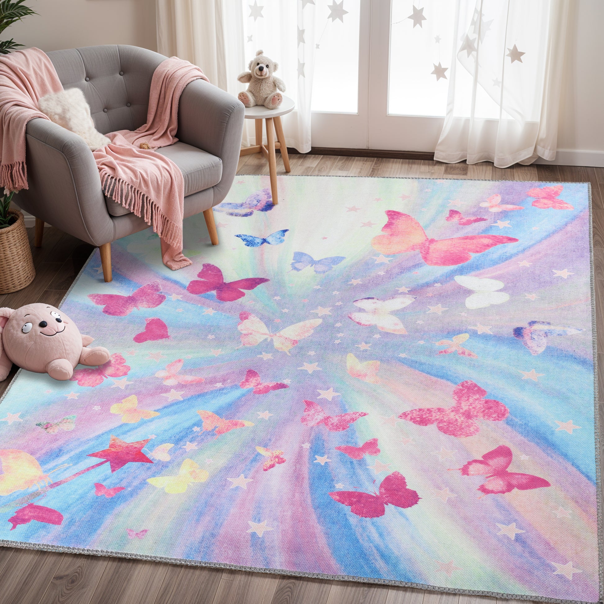 Let your child's imagination take flight with this enchanting Butterfly Non-Slip Kids Rug! A vibrant explosion of colorful butterflies dance across a canvas of swirling pinks and blues, creating a whimsical world of wonder. Crafted from the softest polyester, this rug invites little ones to fly like butterflies, count twinkling stars, and embark on countless adventures along its colorful paths. With its non-slip backing and machine-washable convenience, this rug is as practical as it is playful, making it the perfect addition to any child's room or play space.