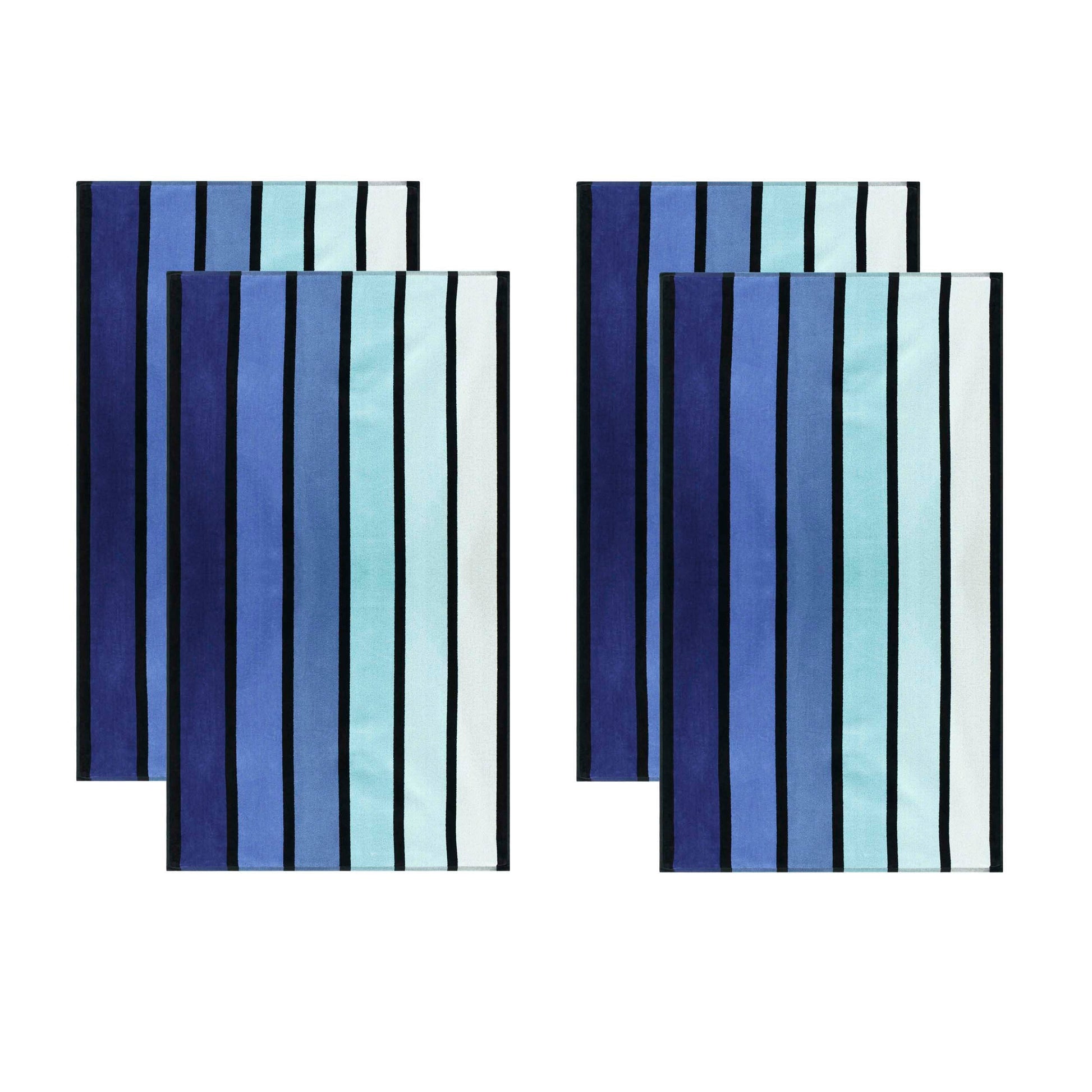 Lounge in luxury with the Superior 4-Piece Coastal Blues Cotton Beach Towel Set. The striped design displays varying shades of blue reminding your of the ocean. This set features 2 towels with inverted colors for a unique yet matching duo. Expertly crafted from Cotton, these towels help wick out moisture quickly. On one side, a soft velour material repels water and sand at the beach and on the reverse side, a woven terry loop features plenty of absorbency that allows you to completely dry off and wrap yourself in utmost comfort. Perfect for families, this set is easy to carry to the beach, keep poolside, or decorate your bathroom.