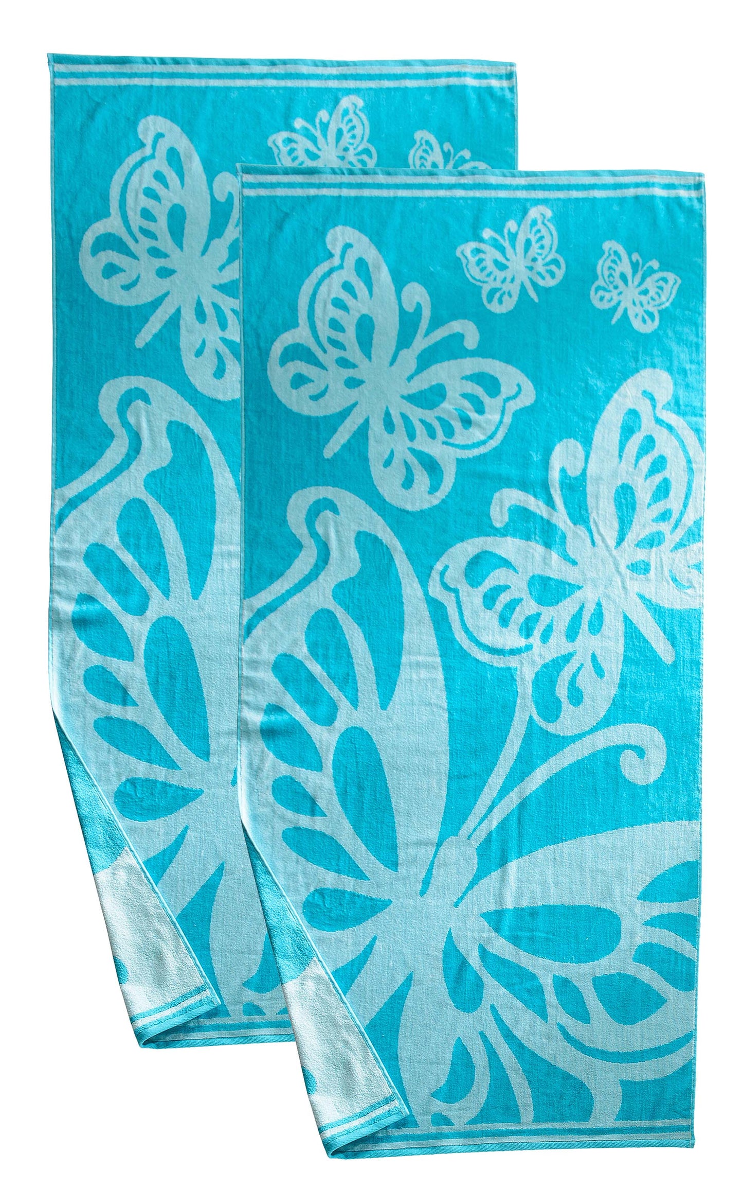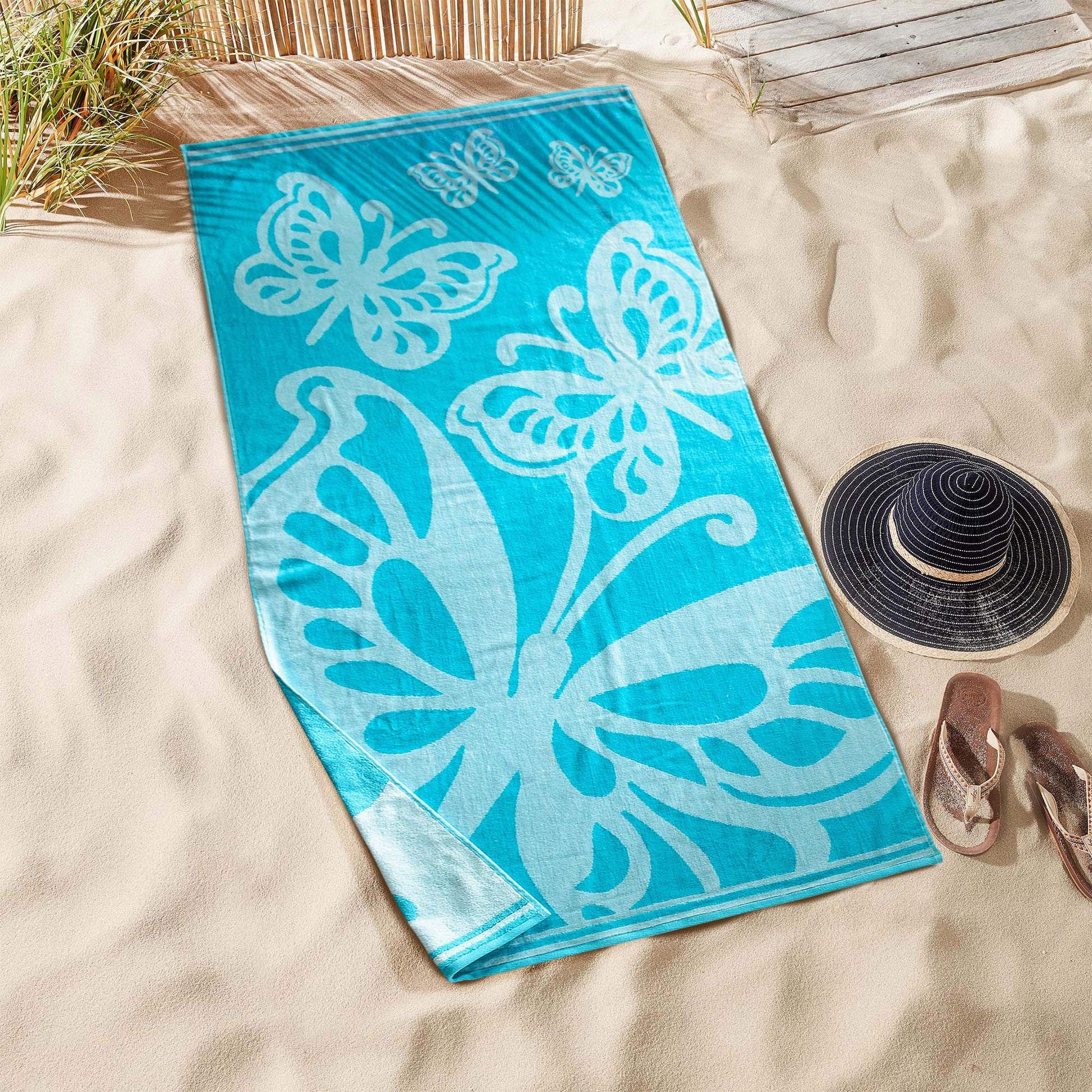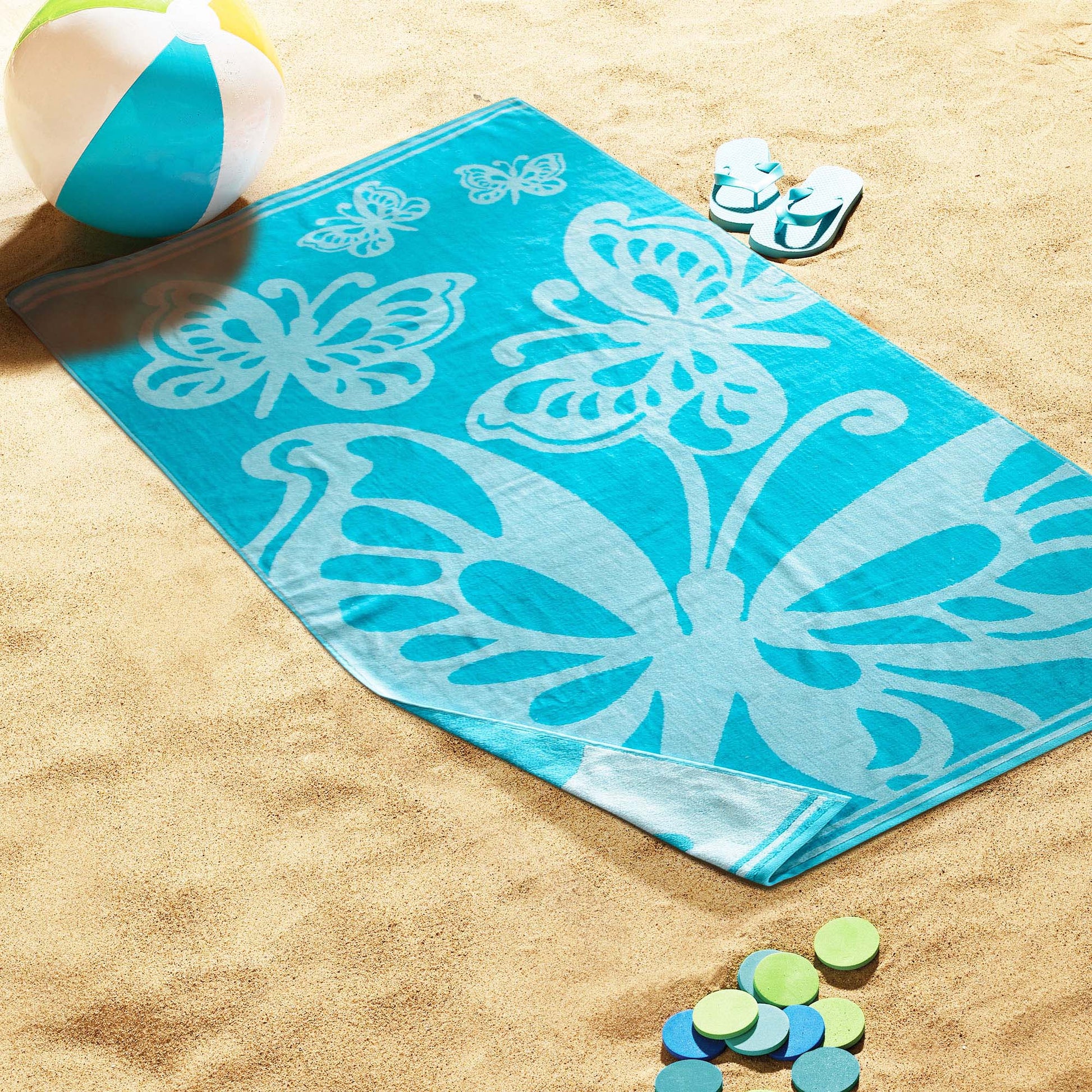 Get ready to enjoy some fun in the sun with the Cotton Oversized Butterflies Beach Towel. Crafted from premium Cotton, this ultra-soft construction offers a smooth, comfy surface for lounging. This towel features a soft velour on one side and a highly absorbent terry loop texture on the other to get you dry quickly. Perfect for all your aquatic activities, this playful butterfly design is available in an assortment of bright, seasonable color options making it the perfect summer accessory.