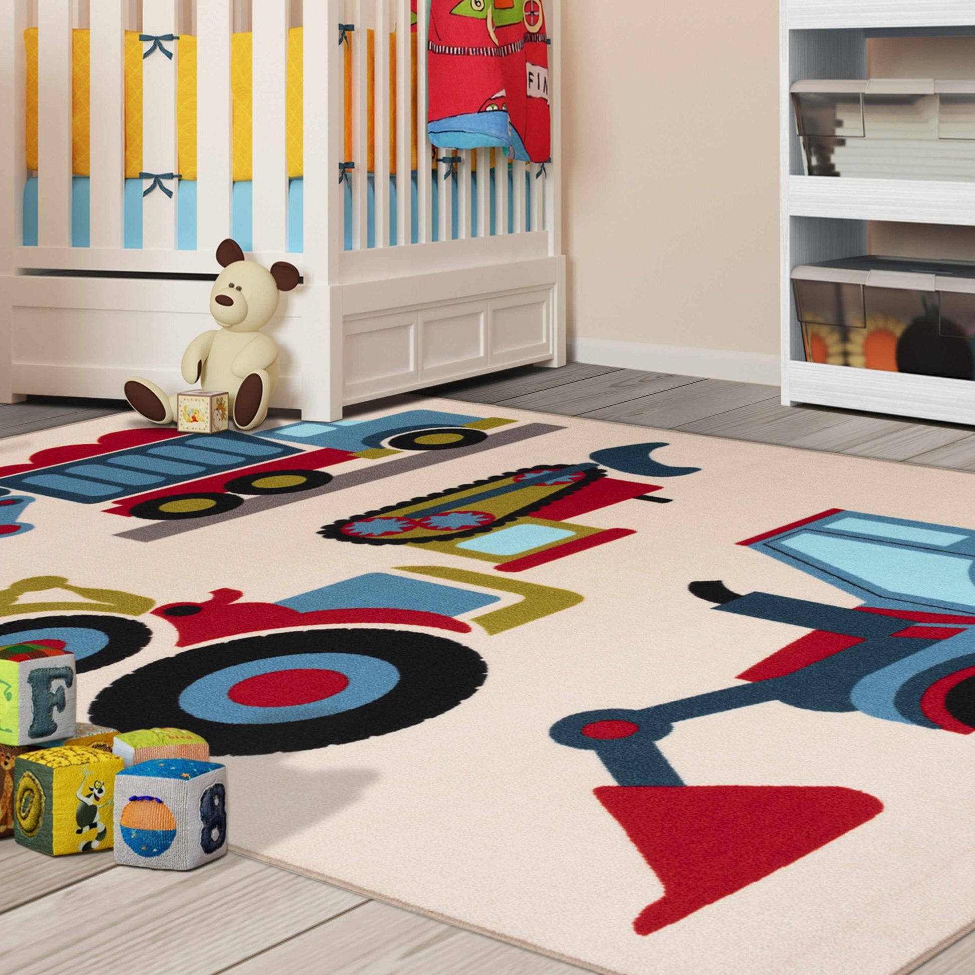 - Design Details: Learning is fun with this playful rug depicting oversized truck images in blue, black, red, and green, over a soft pastel backdrop; engage young minds with this interactive rug in the bedroom, classroom, daycare or playroom