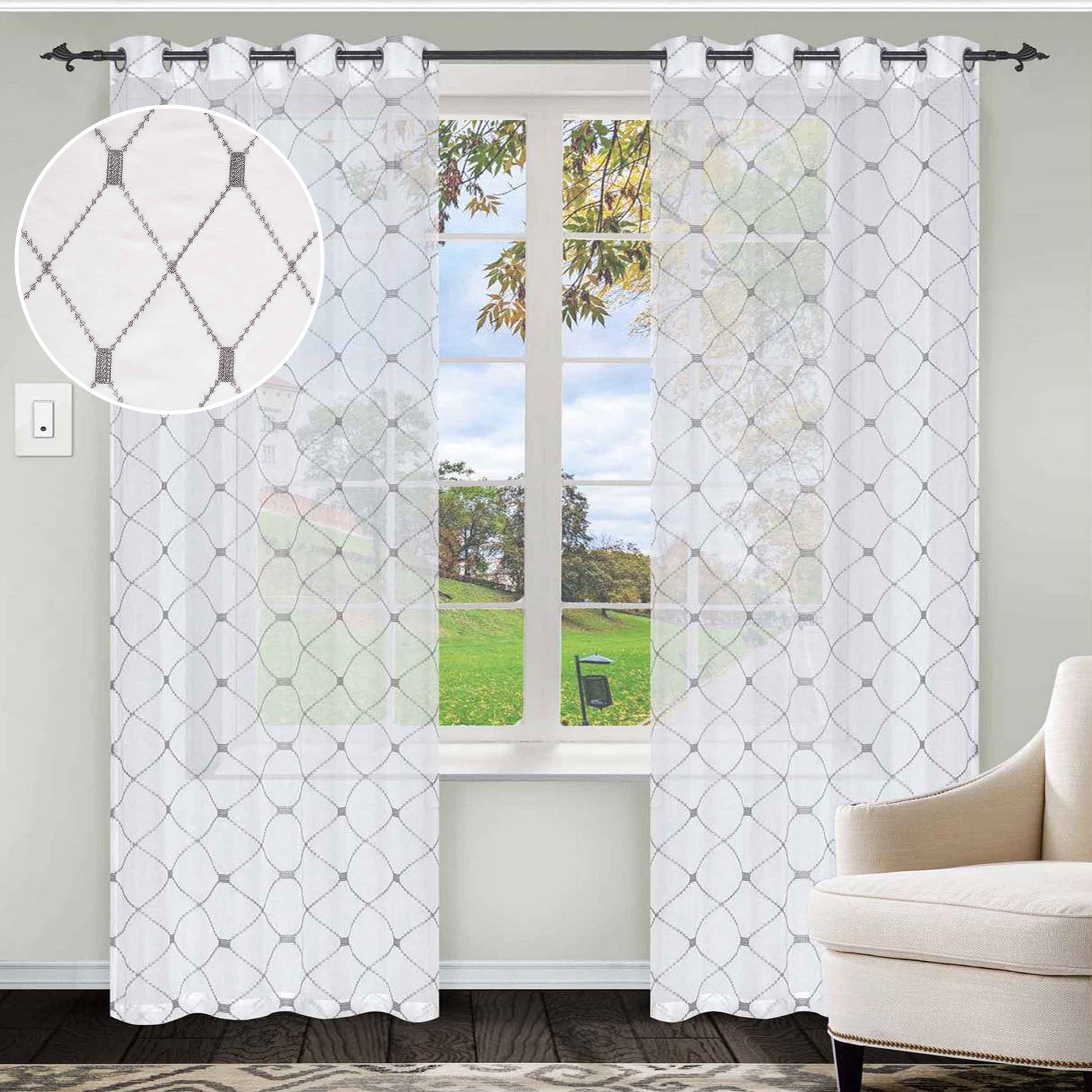 Bring a modern look to your favorite space with the Sheer Modern Diamond Lattice Grommet Curtain Panels (Set of 2). This simple yet elegant diamond lattice pattern brings a charming accent to your space while allowing natural light to stream inside to make your favorite space feel light and airy. These translucent panels are constructed from quality 100-percent Polyester fabric. These woven, textured panels are finished with stainless, polished grommet headers to give sheers a glamorous look while making installation easy.