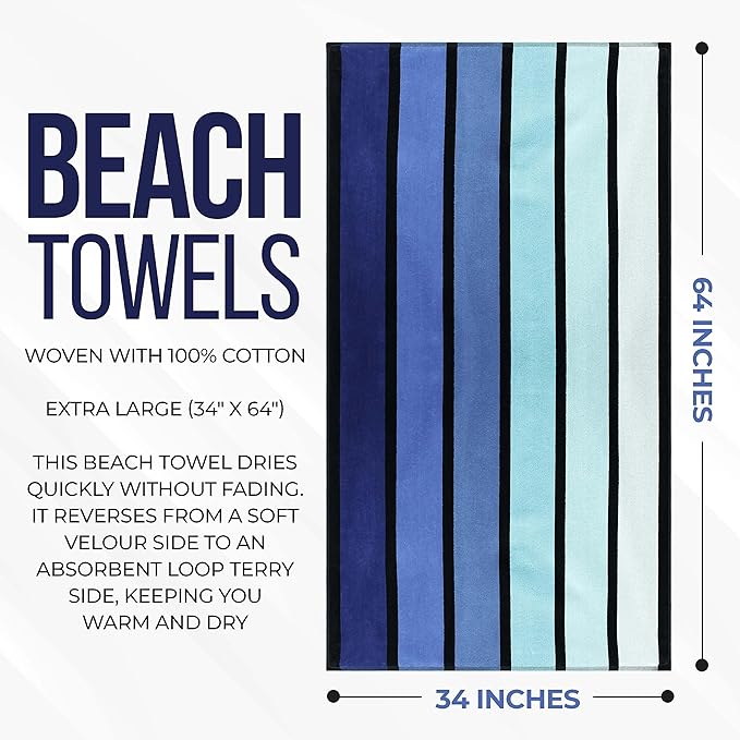 Get ready to hit the beach in style with the vibrant and eye-catching Superior Faded Stripes Beach Towel, designed to bring a pop of color and a touch of elegance to your seaside adventures. An absorbent loop terry on one side and soft velour on the other help keep you warm and dry while you lounge in serenity. Expertly crafted from 100% Cotton, these towels features clean flat weave edging that prevents snags and unraveling, ensuring exceptional longevity for your towels. Perfect for kids and adults alike, the whole family can enjoy this lovely towel!