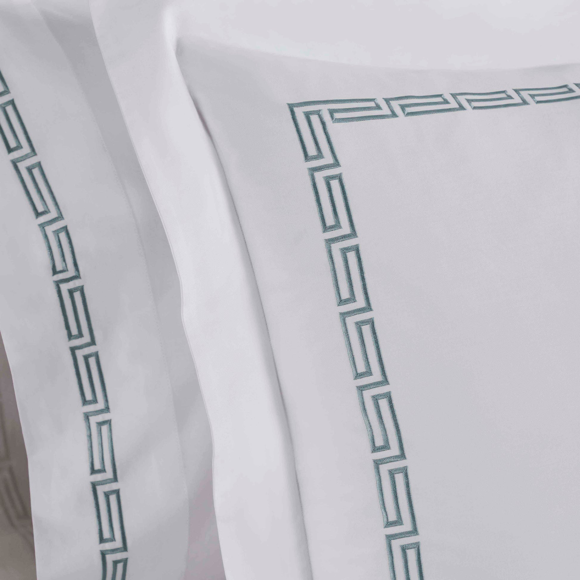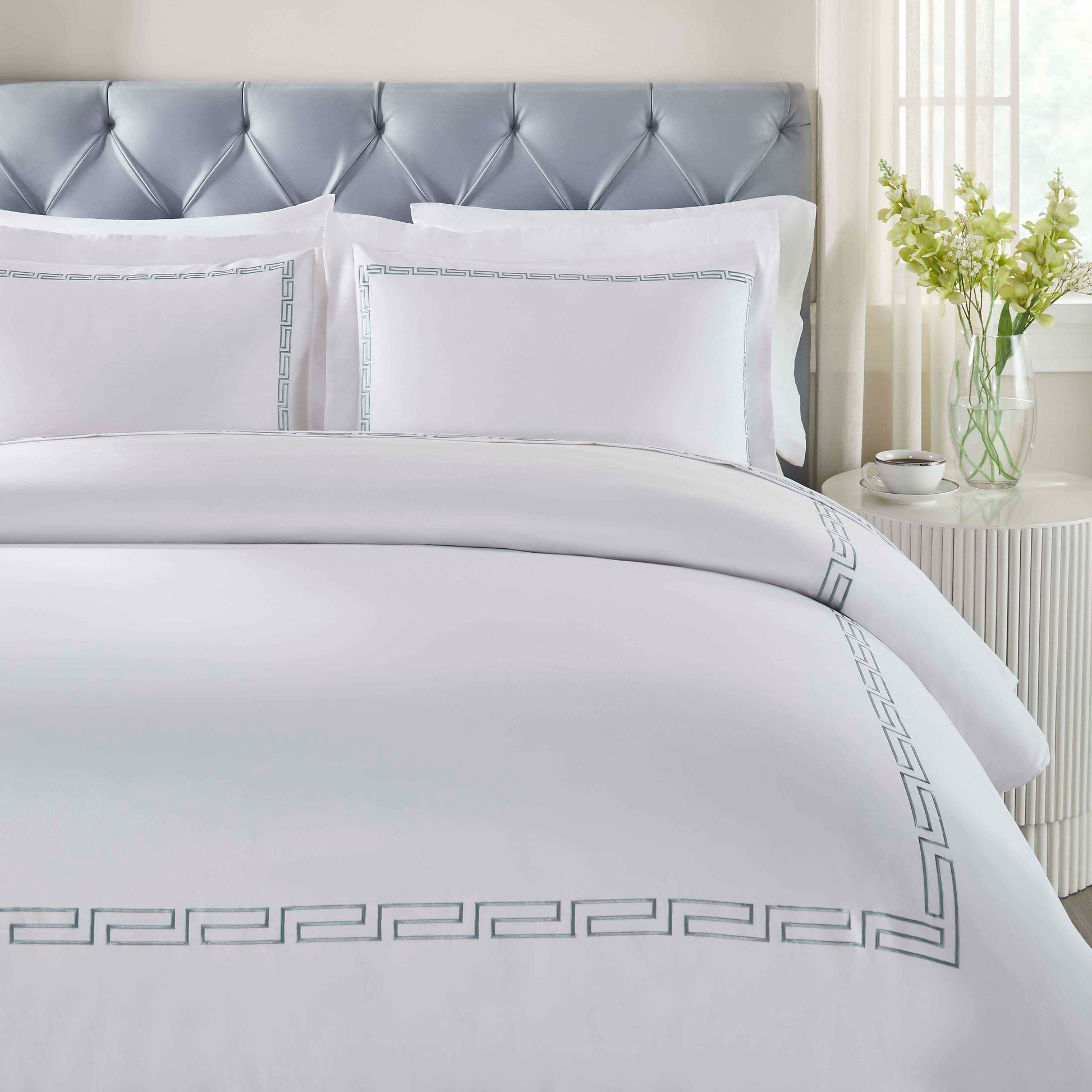 Add a layer of modern style to your bed with our Harrison Cotton Greek Key Embroidered 3 Piece Duvet Cover Set. Crafted from naturally soft and strong cotton, this cozy sheet set is breathable, durable and long-lasting. To securely keep your duvet insert or comforter in place, this duvet cover features hidden buttons for a streamlined look. Displaying an elegant Greek Key embroidery, this bedding set is a practical and luxurious update for your bedroom.