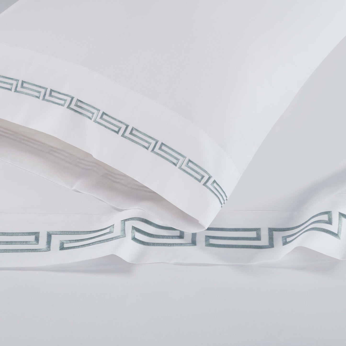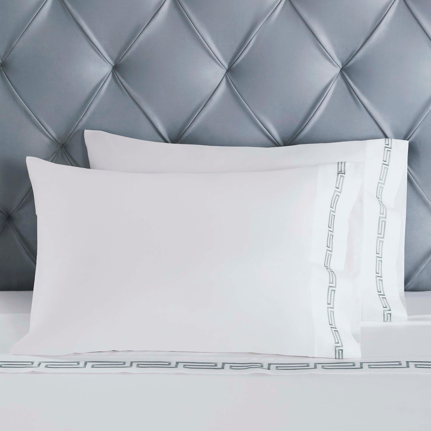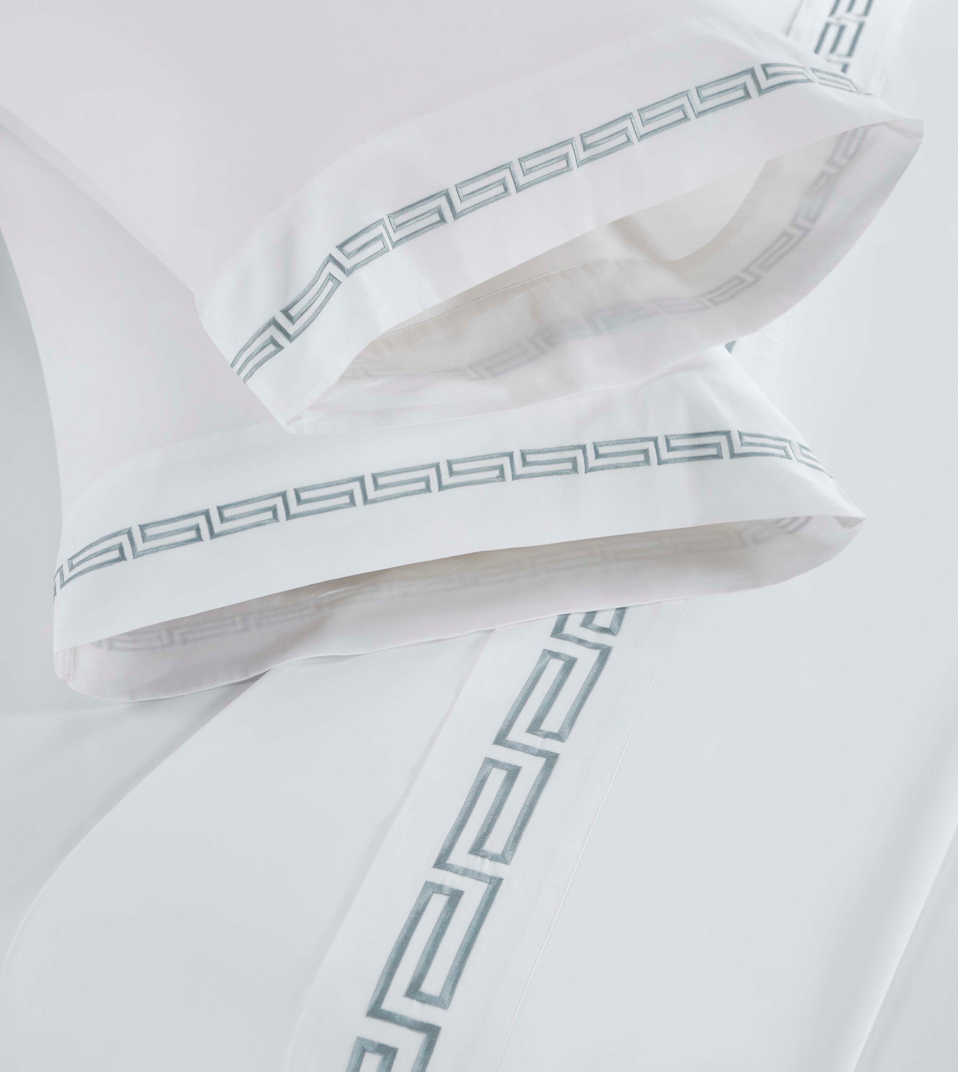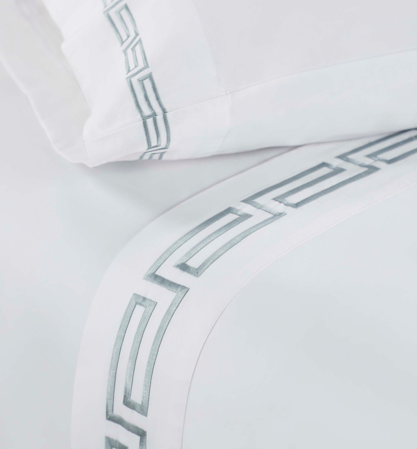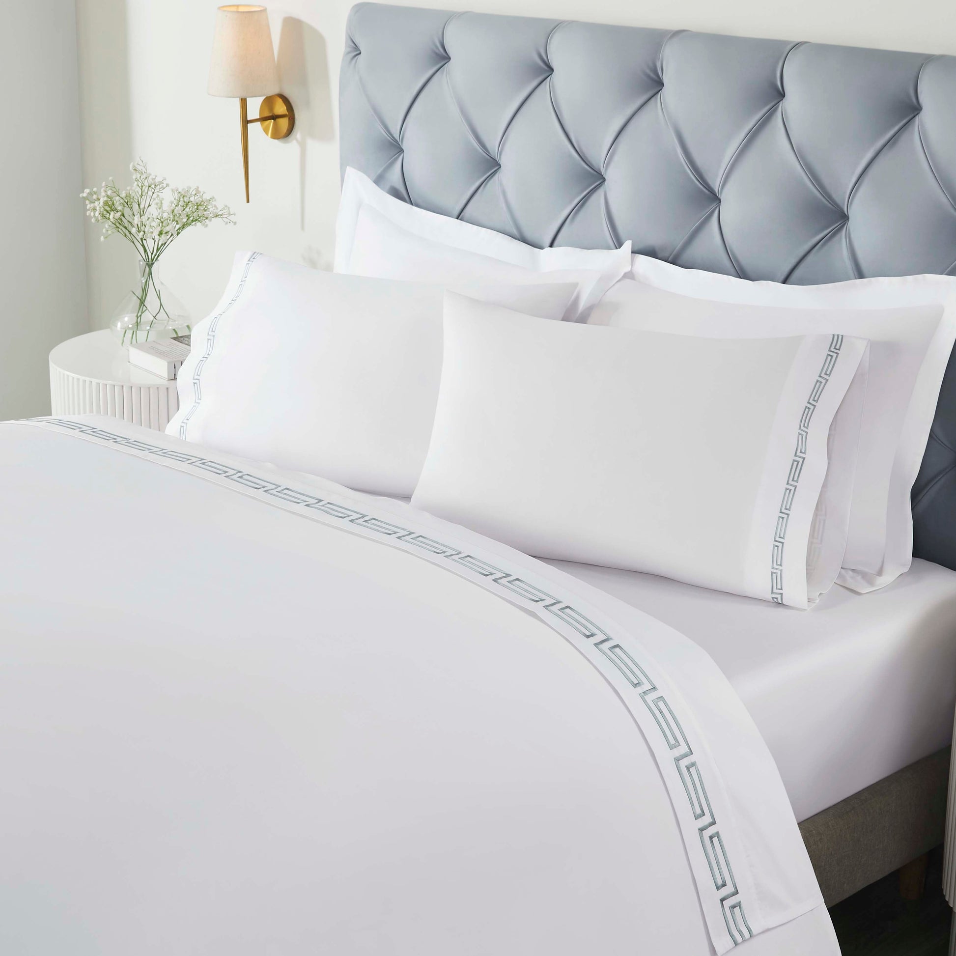• Colors: Solid white with intricate Greek key silver embroidery.