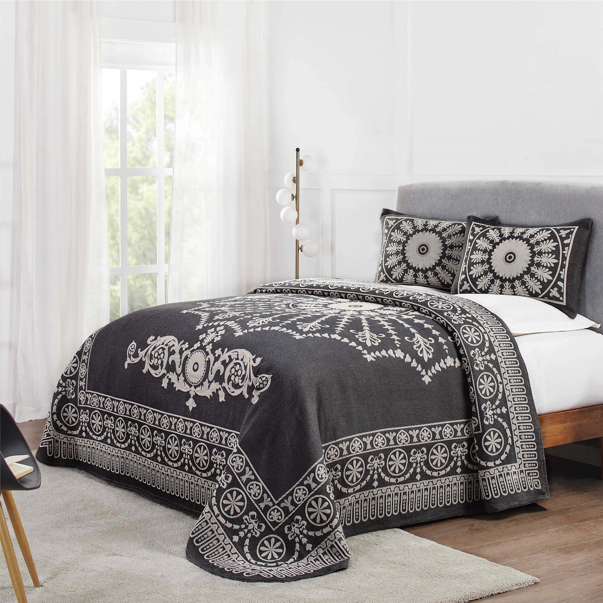 Enjoy comfort and style with the Superior Kymbal Bedspread Set. Crafted from a premium blend of Cotton and Polyester, this versatile set is lightweight and breathable, perfect as an added layer or on its own. This beautifully jacquard woven set boasts a centered medallion to bring relaxed elegance to your modern or transitional bedroom. This gorgeous bundle includes 1 oversized bedspread that hangs to the floor, eliminating the need for a bed skirt, and 2 matching pillow shams (Twin size includes 1 pillow sham). Available in your choice of solid colors and sizes, updating the look of your modern or transitional space has never been easier.