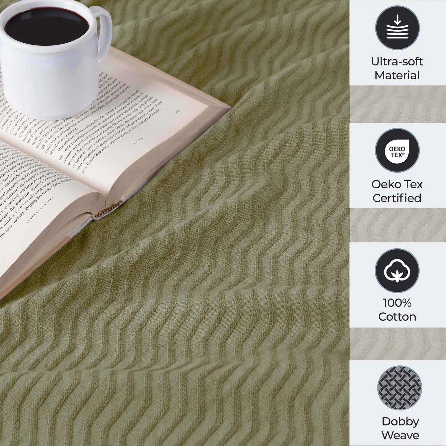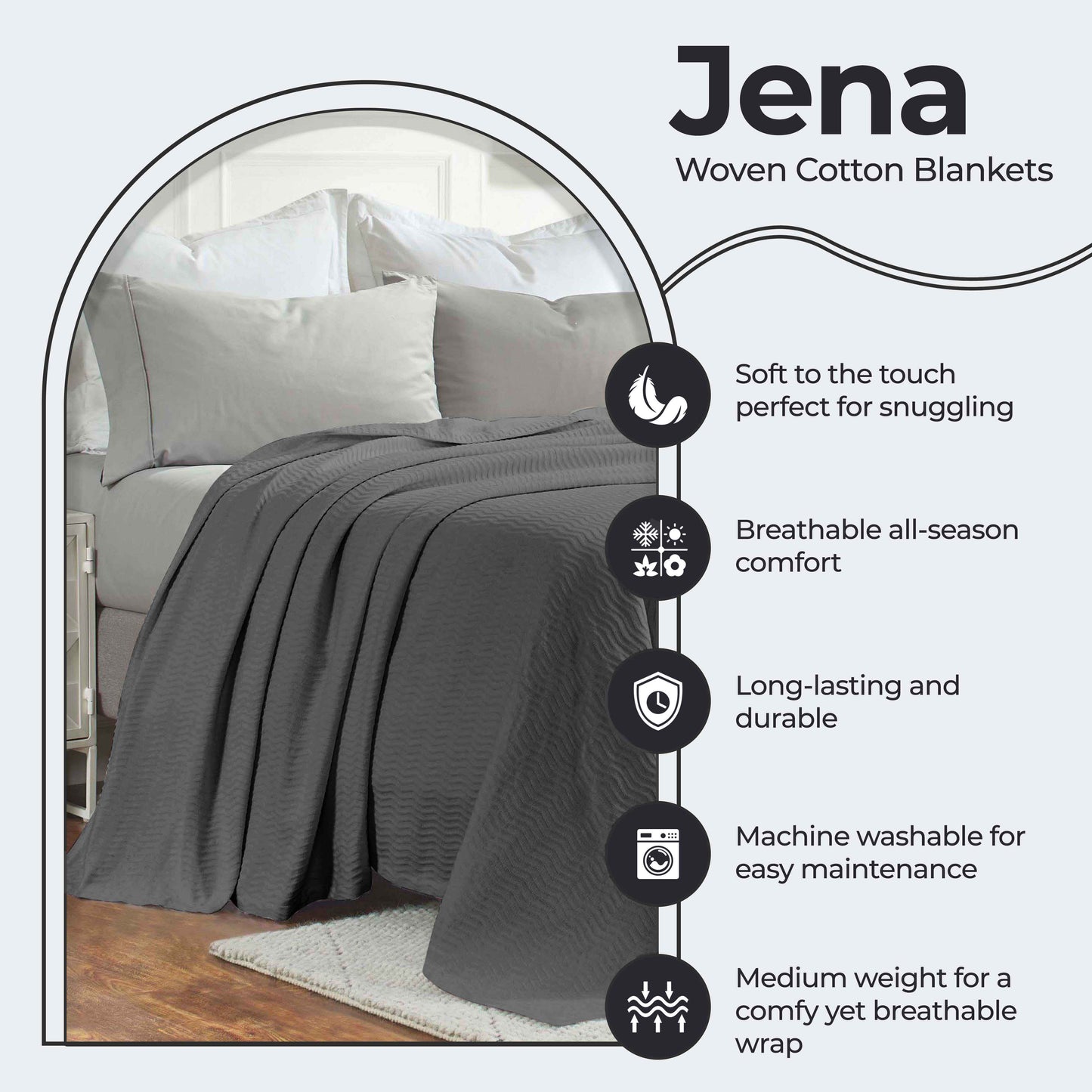 Subtle and alluring, the unique design and irresistible comfort of our Jena Cotton Blanket will keep you cozy when you need it the most. Crafted from naturally soft cotton, this blanket has a luxurious feel and comfortable design. Lightweight and breathable, this bedding essential keeps you covered and warm while you sleep or lounge. This blanket is available in solid color options with a raised jacquard weave design and vertical chevron pattern to instantly update your bedroom or living room. Change the look of your favorite space with this modern style cotton blanket.