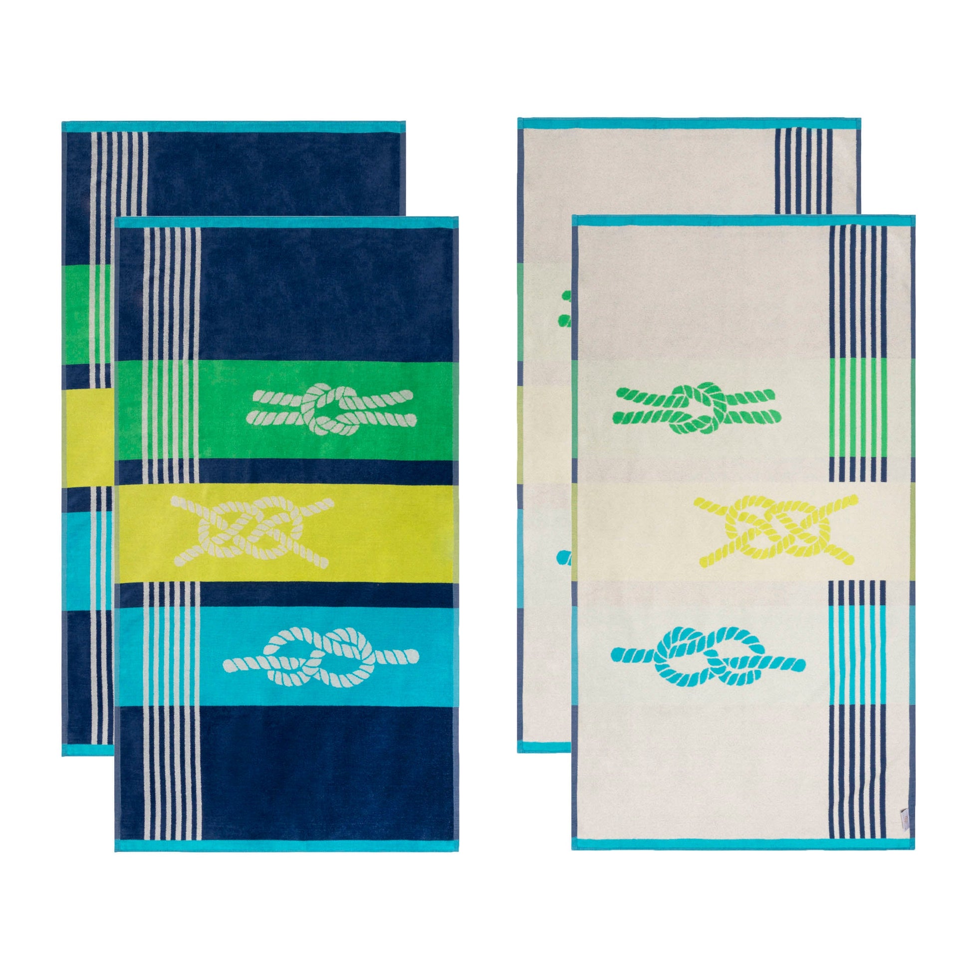 Make a splash with the Marine Knots Oversized Towel. Crafted from Cotton, this generously sized towel can survive any beach, lake, or poolside adventure while still being plush enough to relax and sunbathe. This nautical design showcases a sailors knot motif in a colorful palette of Royal Blue, Green, and Yellow. One side features a highly absorbent terry material while the other side showcases ultra-soft velour with a reversed color combination for relaxing in optimal comfort.