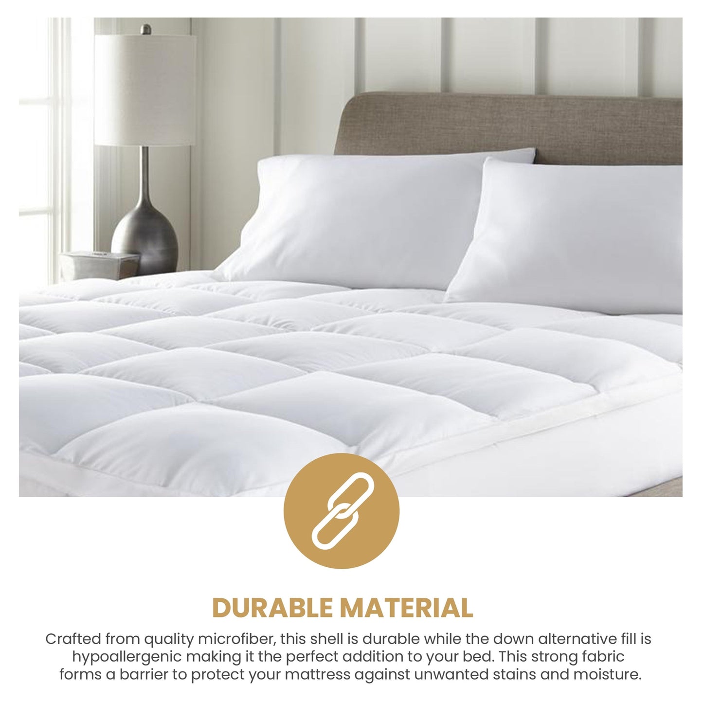 Enjoy a more comfortable and refreshing night of sleep with the Superior Mattress Topper. Crafted from ultra-soft brushed microfiber and down alternative fill, this mattress topper is durable and machine washable. With a cloud-like 2-inch pillow top, this topper adds an extra layer of cushioning and protection to your bed. The super soft down alternative fill allows your body to sink in just enough to relieve pressure, so you can sleep comfortably all night long. Our premium mattress topper is thoughtfully designed to support your body where you need it the most and bring hotel-quality comfort to your bed. Enhance the comfort of your new mattress or prolong the life of an older mattress with this convenient and practical bedding essential.