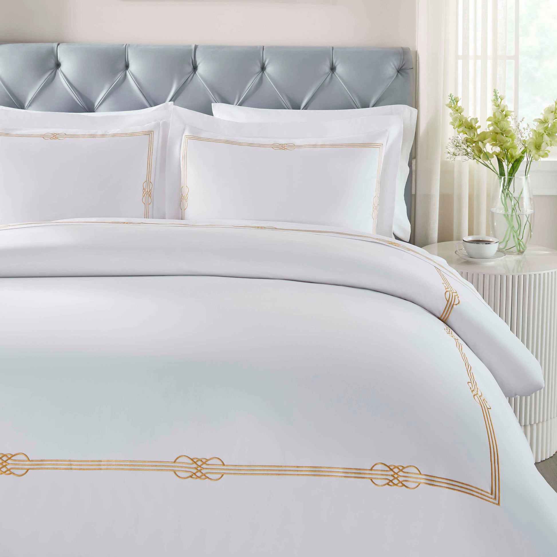 Add a touch of modern elegance to your sleep space with our Moonlawn Cotton Gold Embroidered Duvet Cover Set. Crafted from naturally soft and strong cotton, this cozy sheet set is breathable, durable and long-lasting. To securely keep your duvet insert or comforter in place, this duvet cover features hidden buttons for a streamlined look. Displaying a decorative gold embroidery, this bedding set is a practical and luxurious update for your bedroom.
