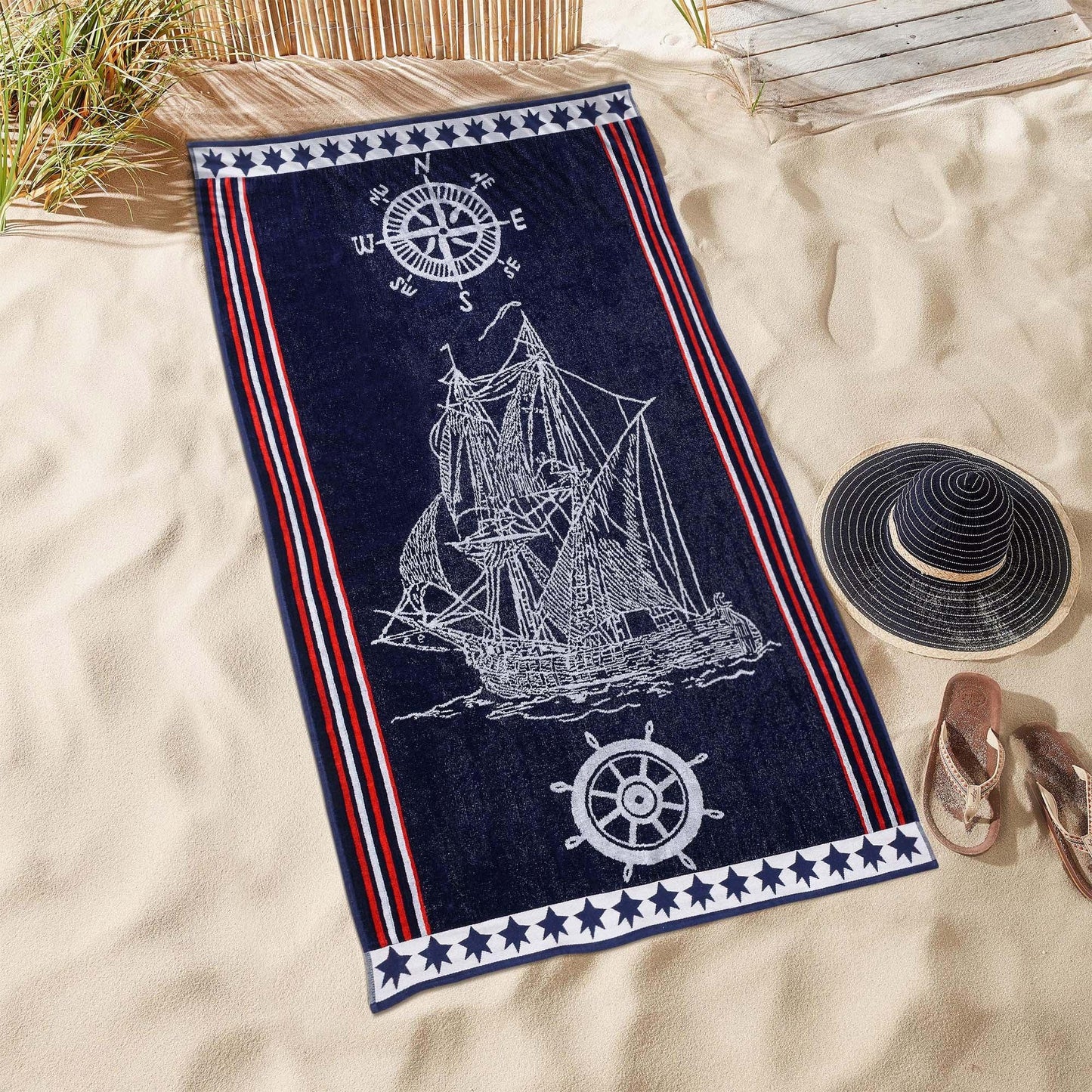 Be prepared for fun and adventure on the high seas with our Ship Cotton Beach Towel Set. These premium cotton beach towels feature velvety soft velour on one side and highly-absorbent terry on the other. The naturally soft and quick drying material of these towels are cozy, durable and perfect for daily use. Reinforced edges and a generous size makes each towel ideal for lounging by the pool, at the beach or anywhere you want to relax and have fun. Displaying a great white ship with sails, atop a navy blue foundation with stars, a ship's wheel and compass accents, relax in the sun in style with this beach towel set.