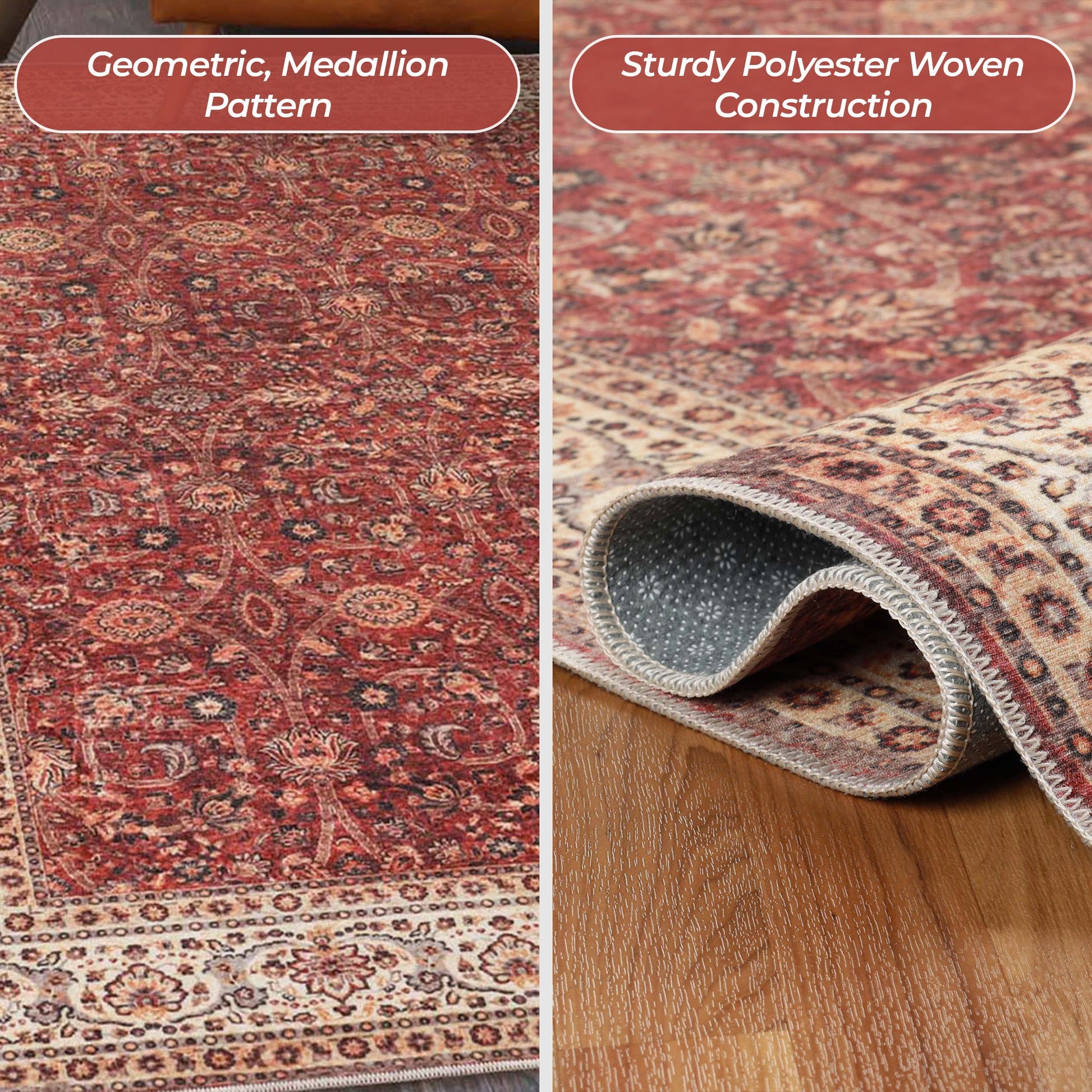 Add a touch of classic flair and polished style to your home with our Toucan Geometric Medallion Non-Slip Washable Indoor Area Rug. This beautifully vintage rug is crafted from durable polyester with a cozy rug thickness that is sturdy enough to handle the most hectic areas of your home. Finished with a felt dot non-slip backing, this rug is a long-lasting and durable option for homes with children and pets. The geometric medallion pattern comes together with a traditional border design that will coordinate seamlessly with your home decor.