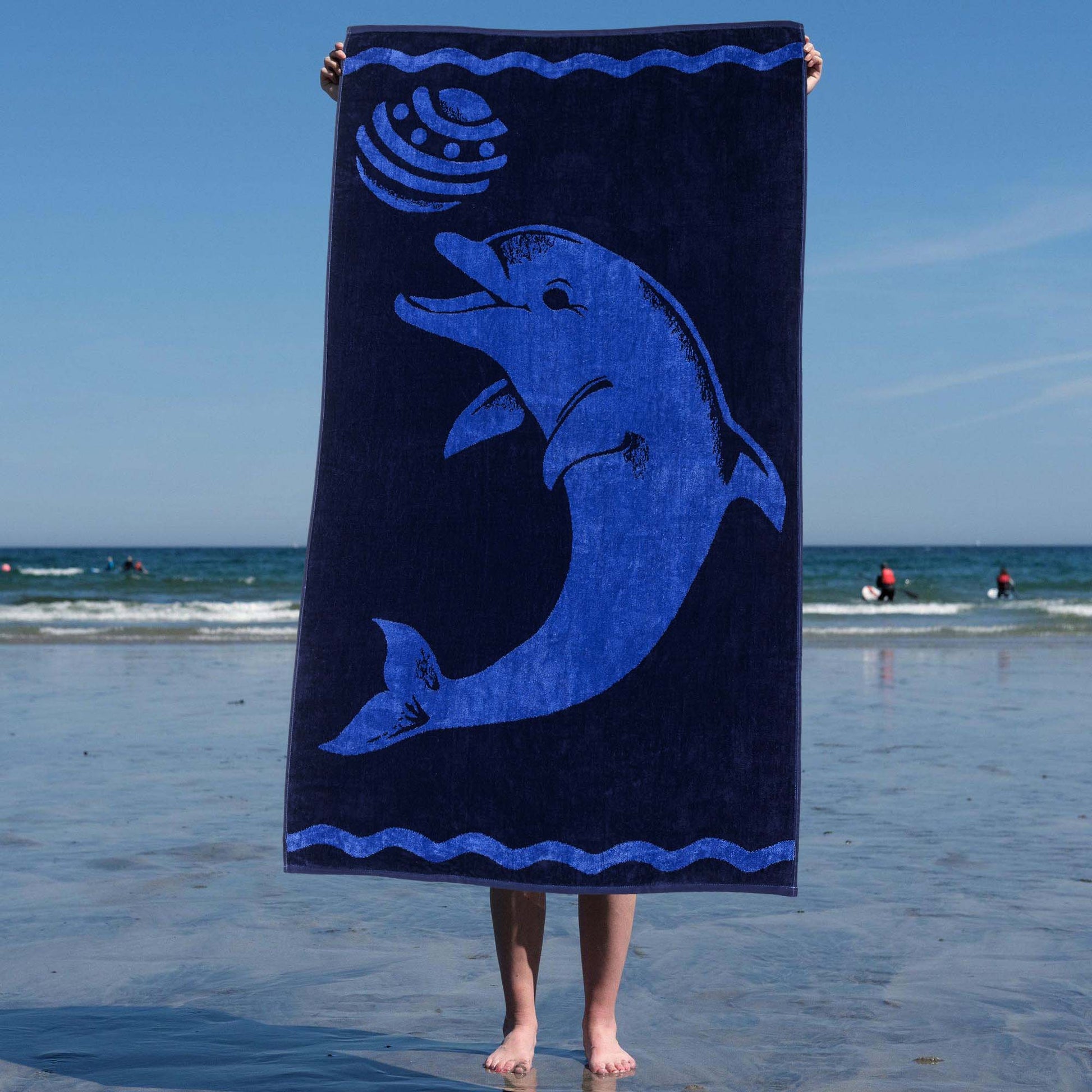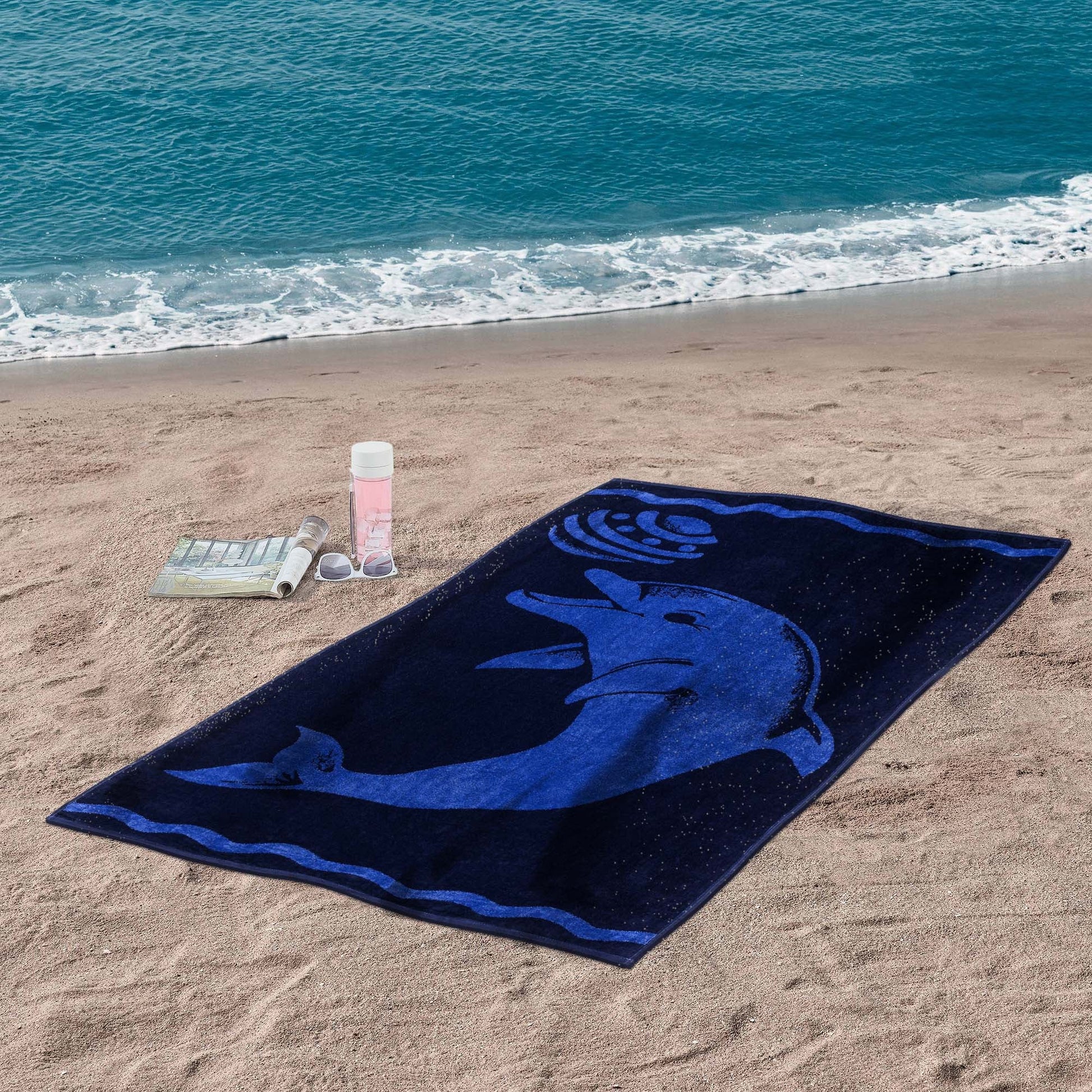 The Play Dolphin Beach Towel is the perfect summer accessory. This gorgeous summer time towel features a soft velour on one side and an absorbent terry on the other. The large 34" x 64" size keeps you cozy and warm after a swim and the colorfast material means the colors won't fade. This towel features a 100-percent premium cotton construction and displays a cheerful dolphin in royal blue tossing a ball while resting atop a solid navy blue backdrop. Perfect for adults and kids alike, these lovely towels are colorfast and machine washable.