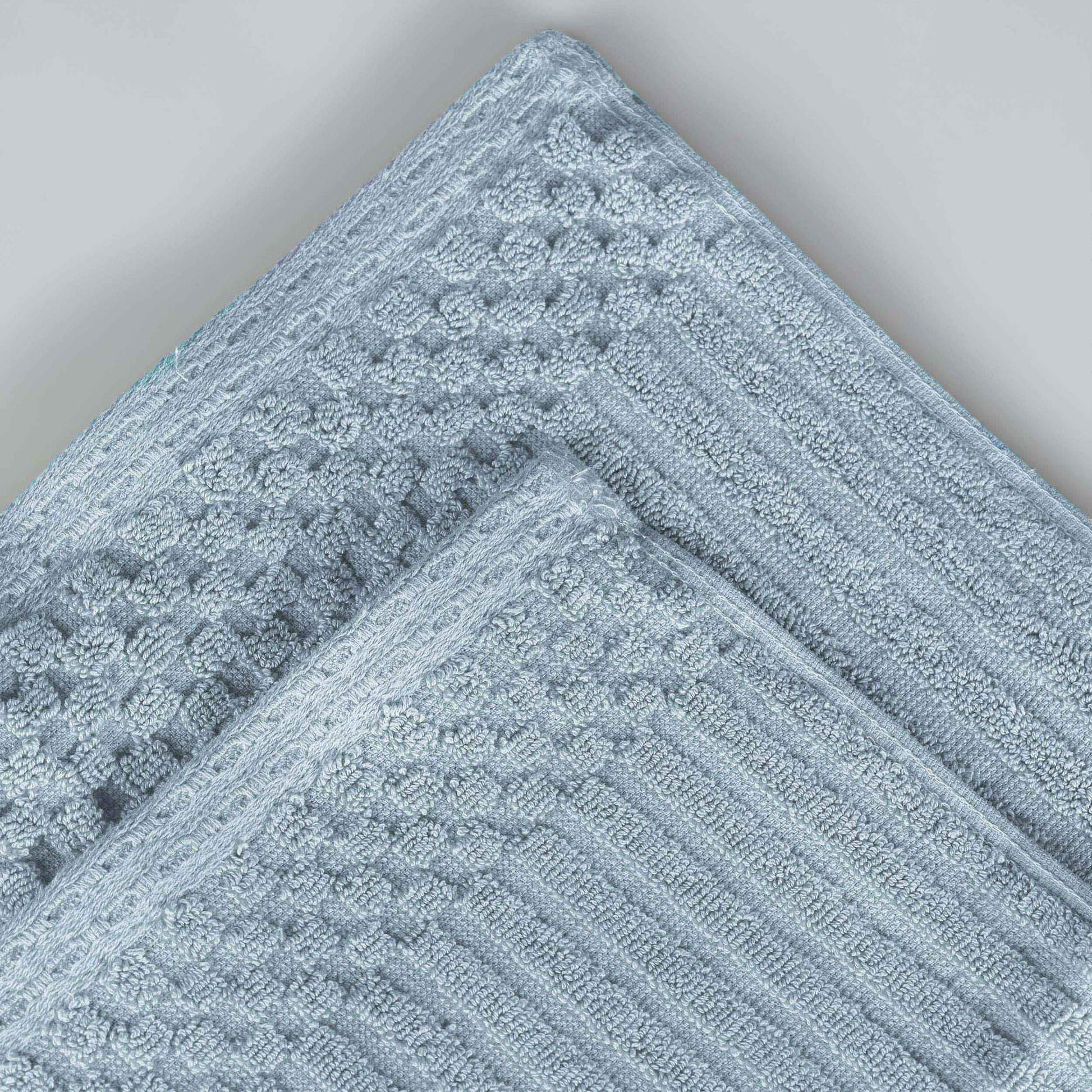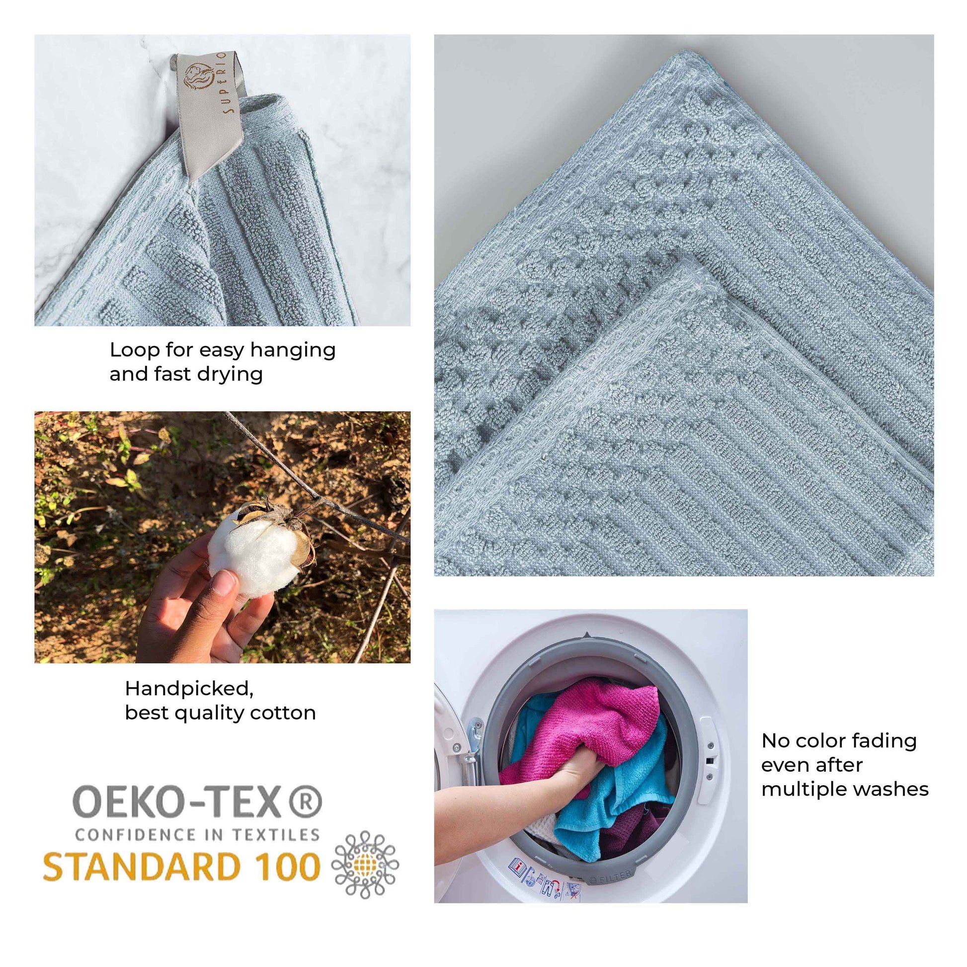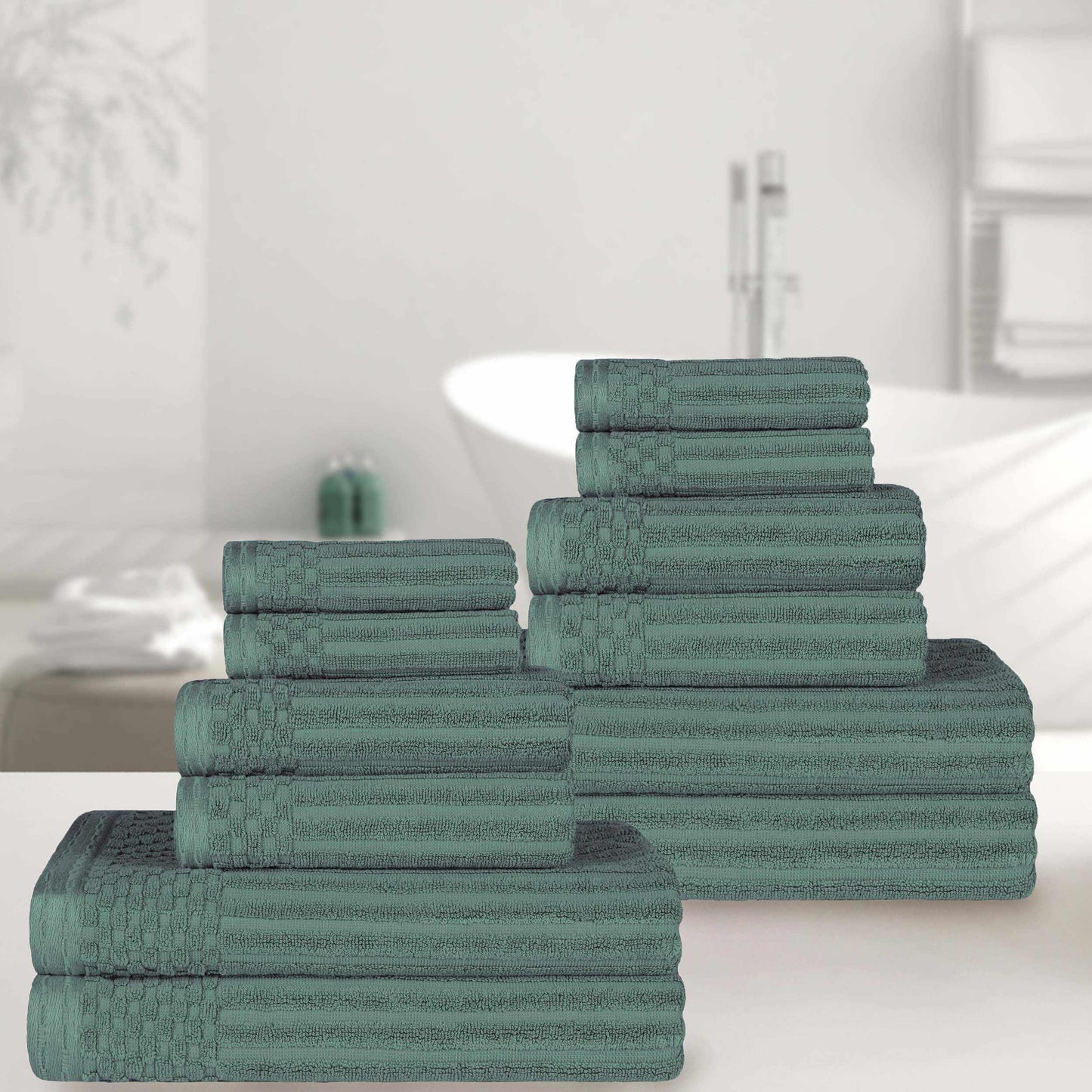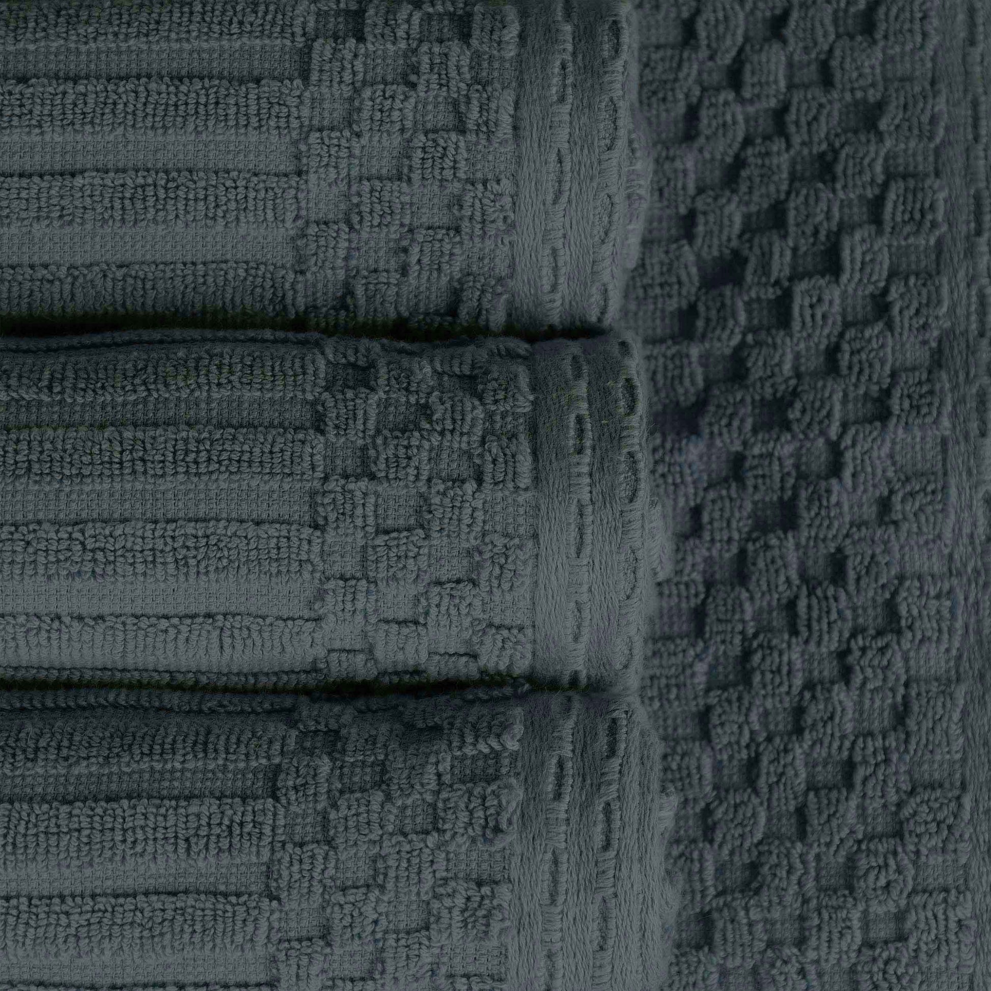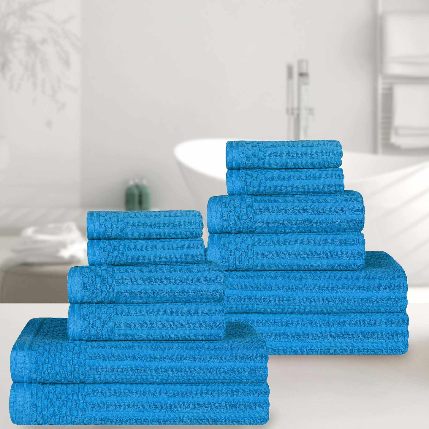 Bring your bathroom back to life with the Ribbed Textured Cotton Ultra-Absorbent Towel Set. The ribbed texture features a checkered pattern along the border of the towel that will effortlessly make a stylish statement and wow your guests. Each towel is made with a singly-ply construction to ensure that you will get dried quickly and comfortably after each use. The towel is crafted with premium quality Cotton which will withstand many washes. This incredibly soft towel set includes four bath towels, four hand towels, and four face towels in an assortment of solid colors to match any modern or transitional style.