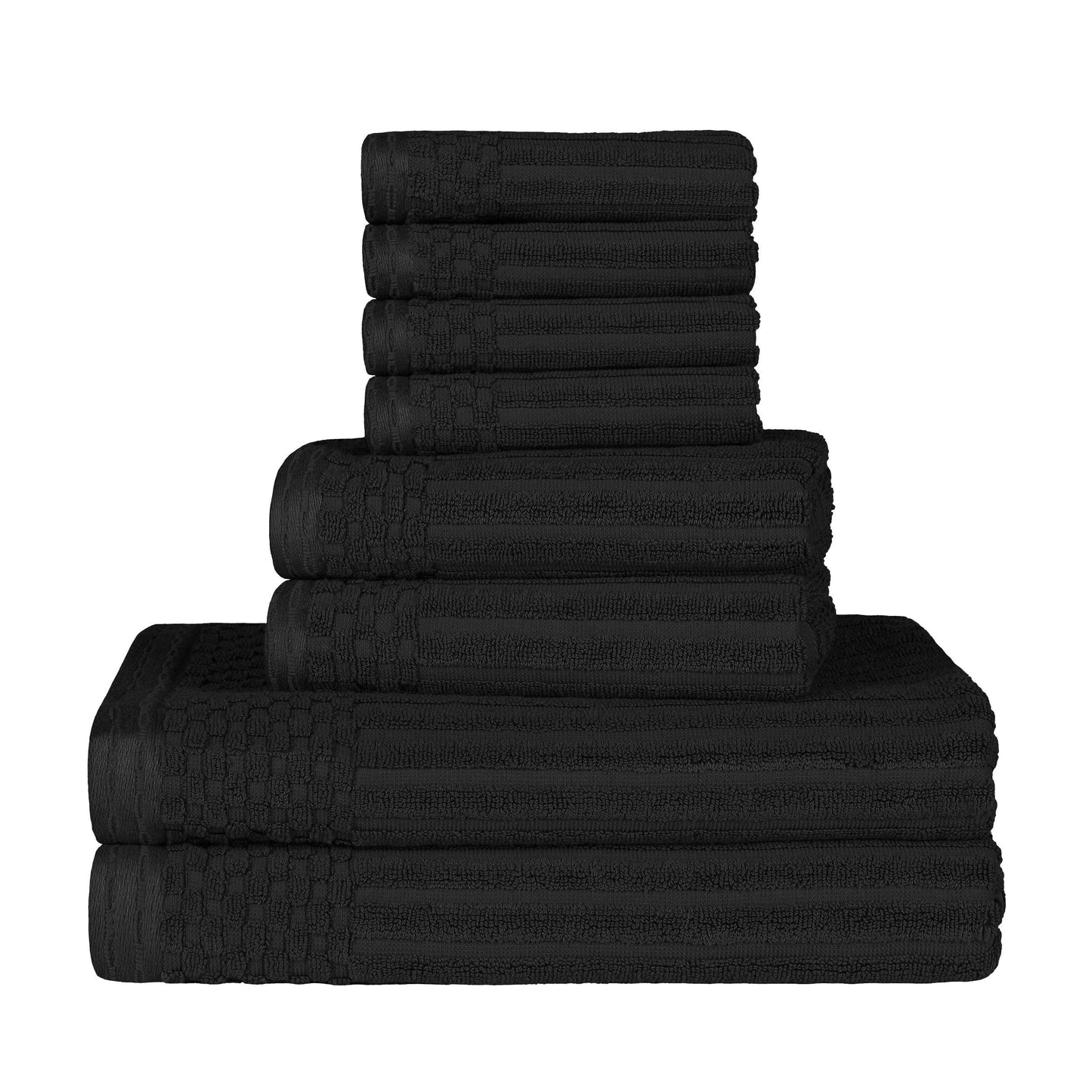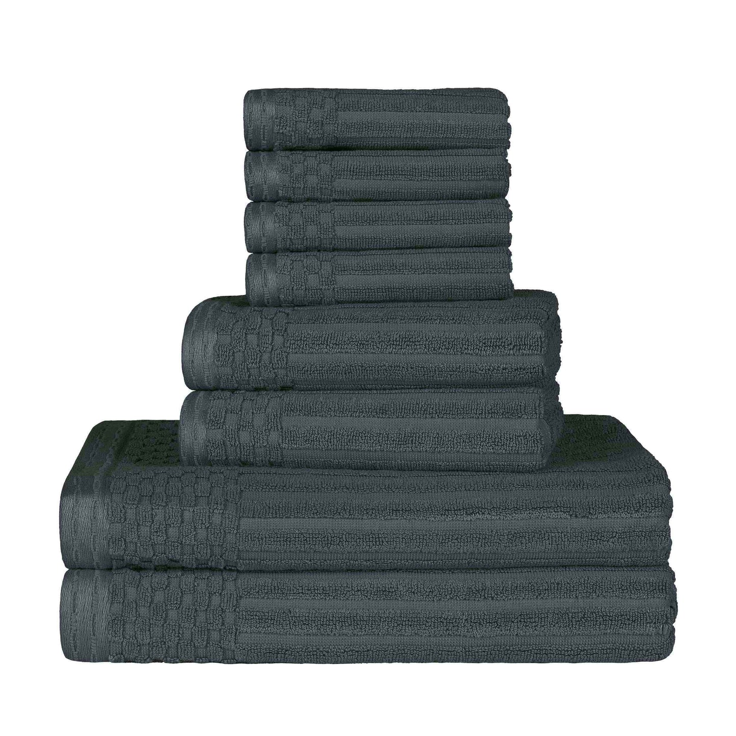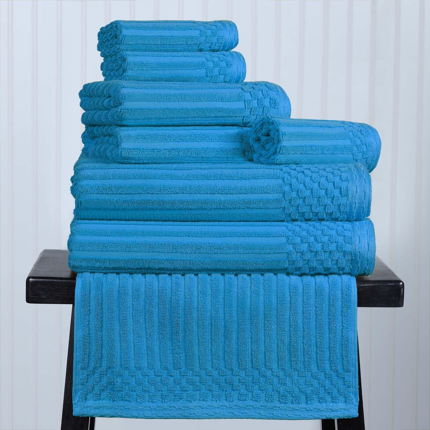 Bring your bathroom back to life with the Ribbed Textured Cotton 8-Piece Ultra-Absorbent Towel Set. The ribbed texture features a checkered pattern along the border of the towel that will effortlessly make a stylish statement and wow your guests. Each towel is made with a singly-ply construction to ensure that you will get dried quickly and comfortably after each use. The towel is crafted with premium quality Cotton which will withstand many washes. This incredibly soft towel set includes two bath towels, two hand towels, and four face towels/washcloths in an assortment of solid colors to match any modern or transitional style.