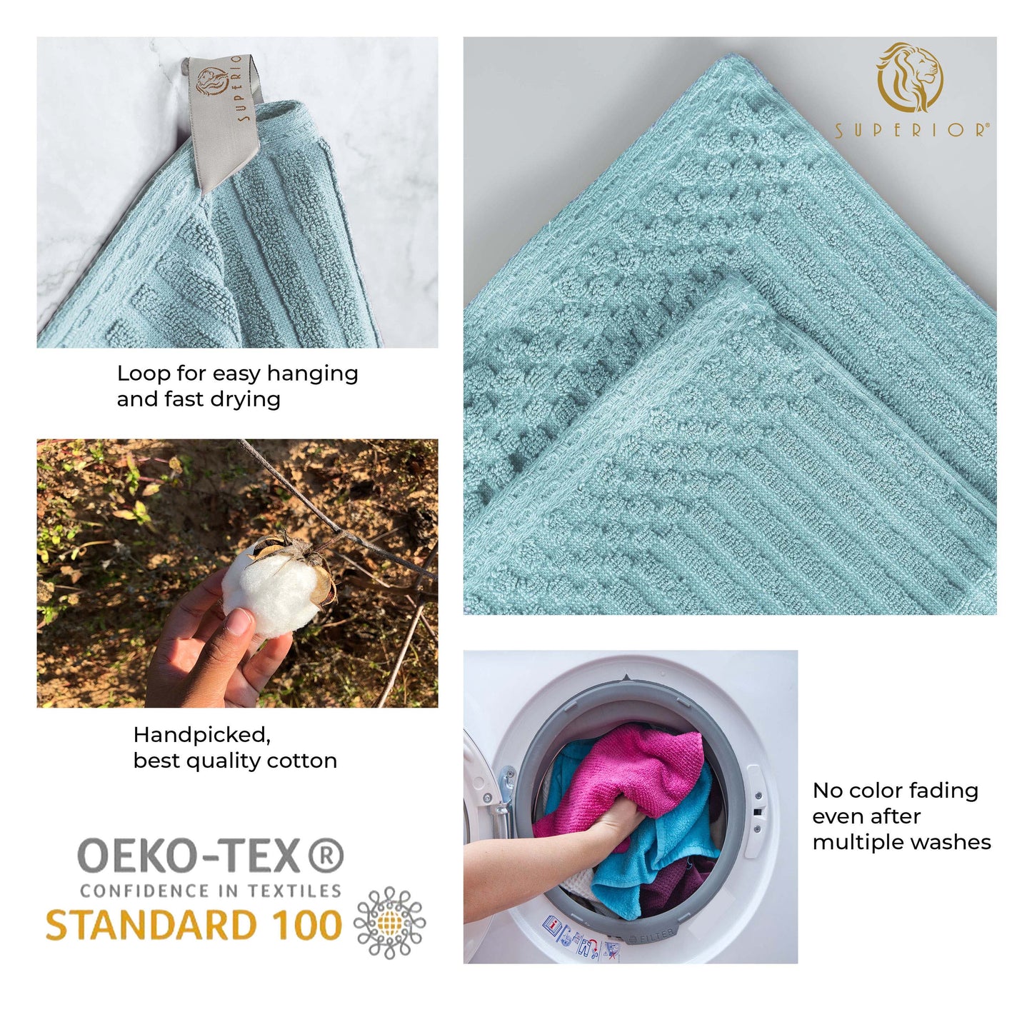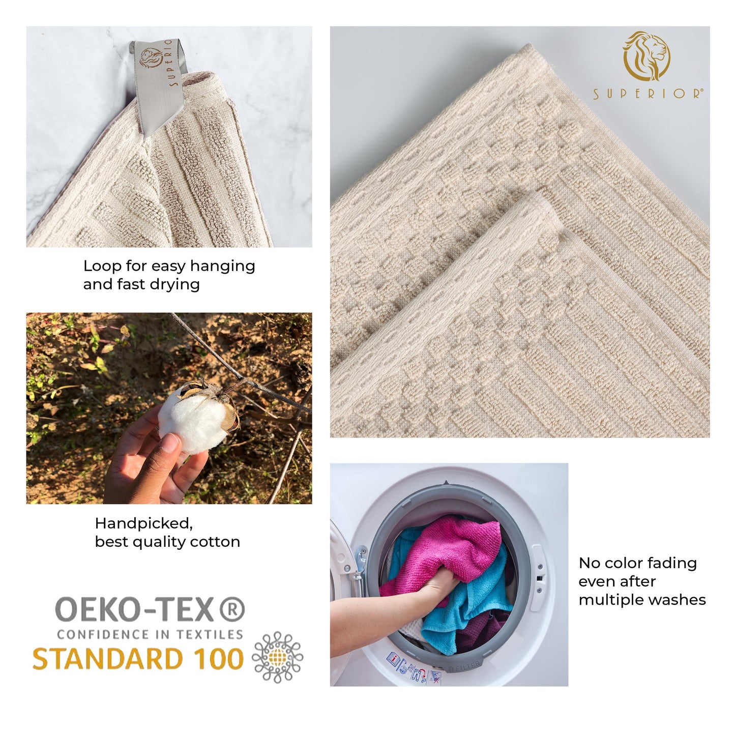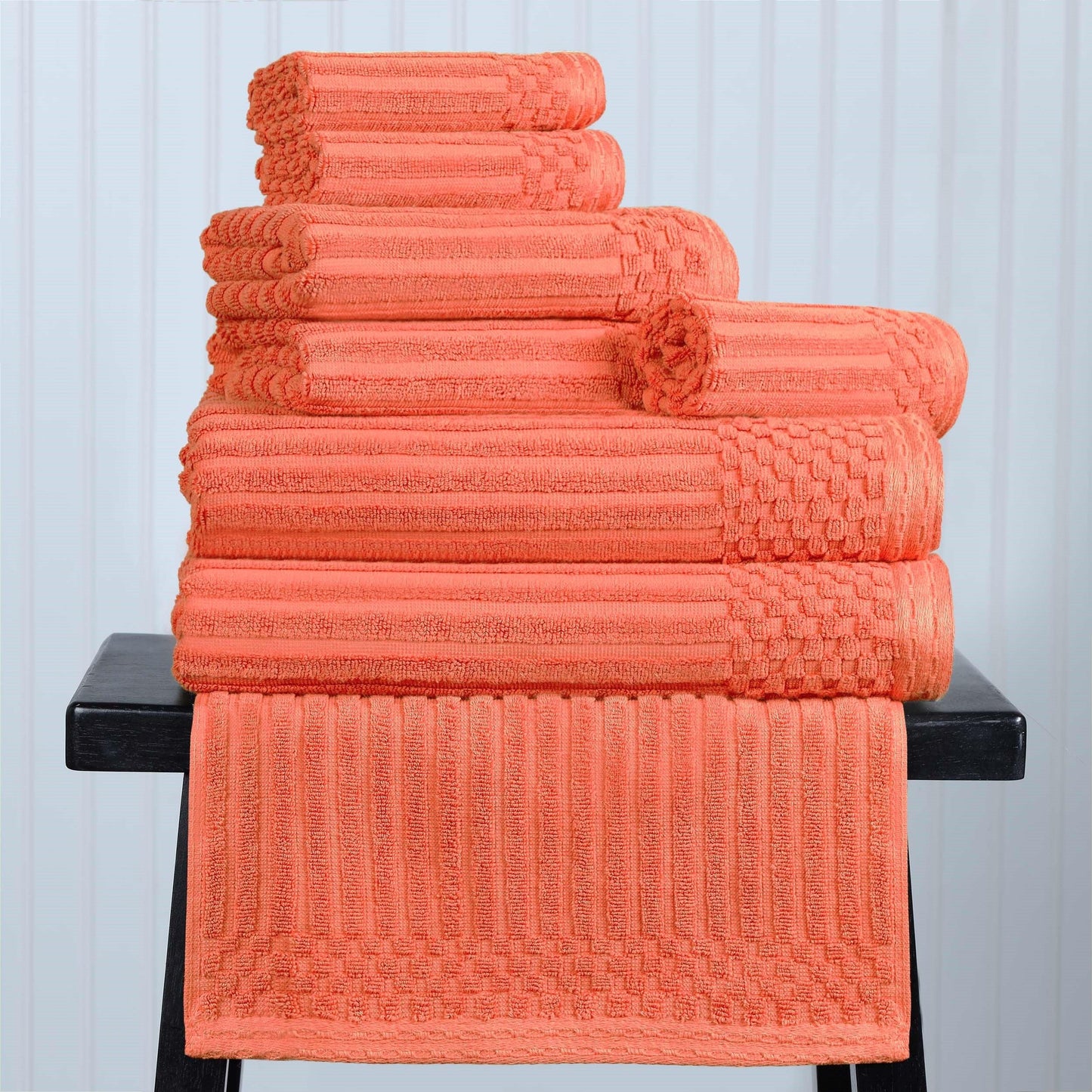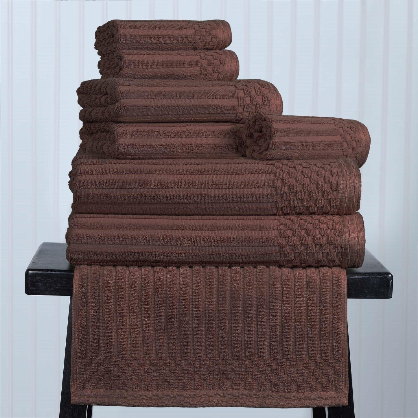 Bring your bathroom back to life with the Ribbed Textured Cotton 8-Piece Ultra-Absorbent Towel Set. The ribbed texture features a checkered pattern along the border of the towel that will effortlessly make a stylish statement and wow your guests. Each towel is made with a singly-ply construction to ensure that you will get dried quickly and comfortably after each use. The towel is crafted with premium quality Cotton which will withstand many washes. This incredibly soft towel set includes two bath towels, two hand towels, and four face towels/washcloths in an assortment of solid colors to match any modern or transitional style.