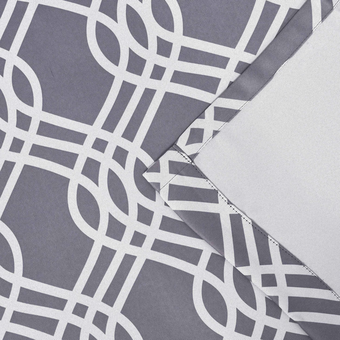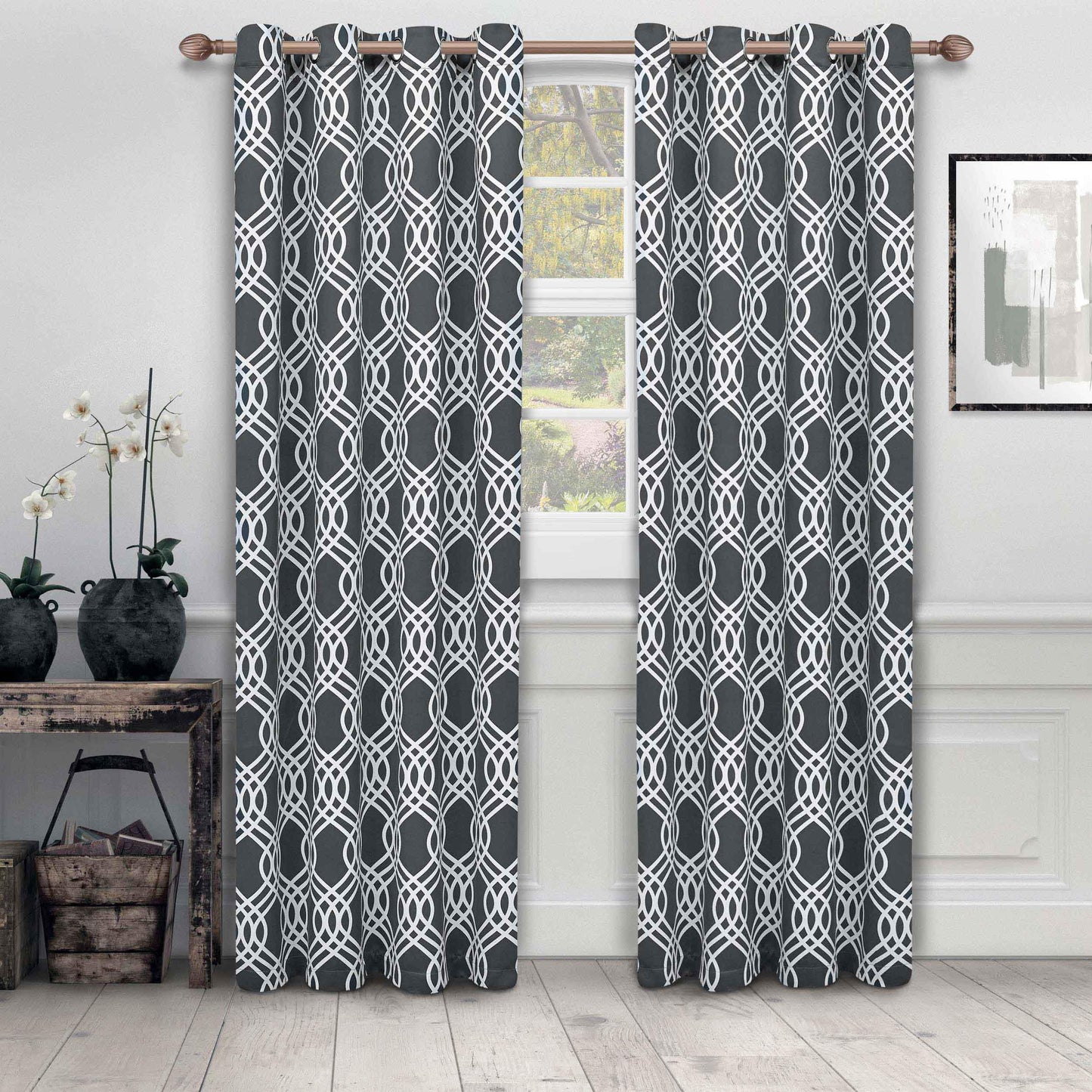 Accent your windows with the eye-catching modern style of the Ribbon Room Darkening Blackout Curtains by Superior. Crafted from 100% polyester with a rod pocket or rust-free grommet header (depending on size), this panel set is durable and modern in design. Our blackout curtains block out 70-80% unwanted sunlight and UV rays, so you can feel cozy in your home. Perfect thermal insulators, each panel in this set reduces room heat and cold loss through your windows to help you save energy and maintain the ideal temperature. These curtain panels display a classic all-over trellis design giving you an elegant window accent with the comfort and convenience of sun blocking features.