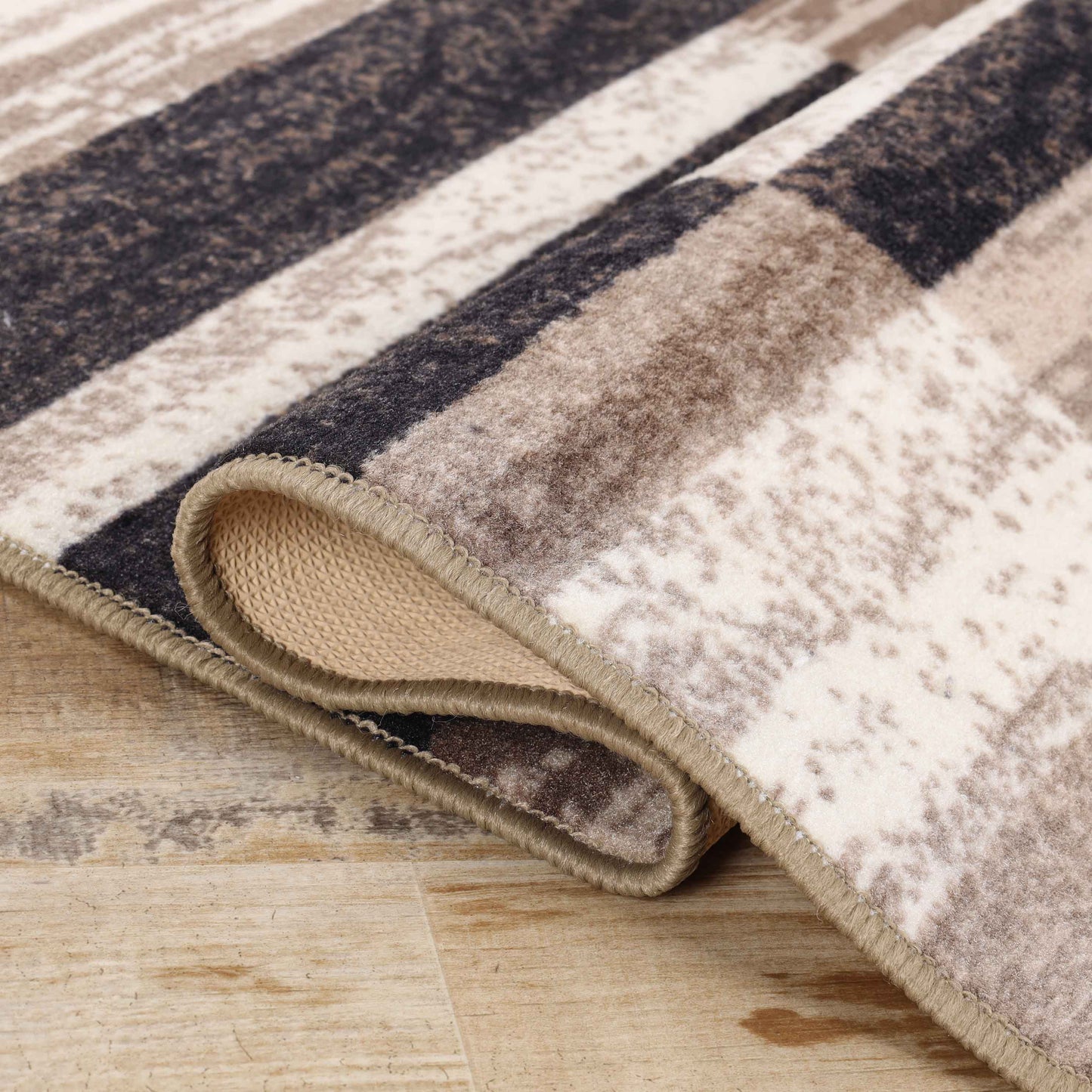 Combine comfort and functionality in your living space with the Rockwood Area Rug. Rockwood's well-balanced, screen-printed design features crisp lines to create a contemporary patchwork pattern in shades of cream, beige, brown, and chocolate that coordinate effortlessly with transitional, modern, and mid-century decors. Ideal for high-traffic areas like living rooms, dining rooms, and hallways, the 100-percent Nylon fiber construction and 0.18€ rug thickness eliminate the need for a rug pad making this piece perfect for homes with children and pets. These items are machine washable & rug-able. This area rug is a desirable option if you are looking for outstanding value at an affordable price, which can only be found at Superior.