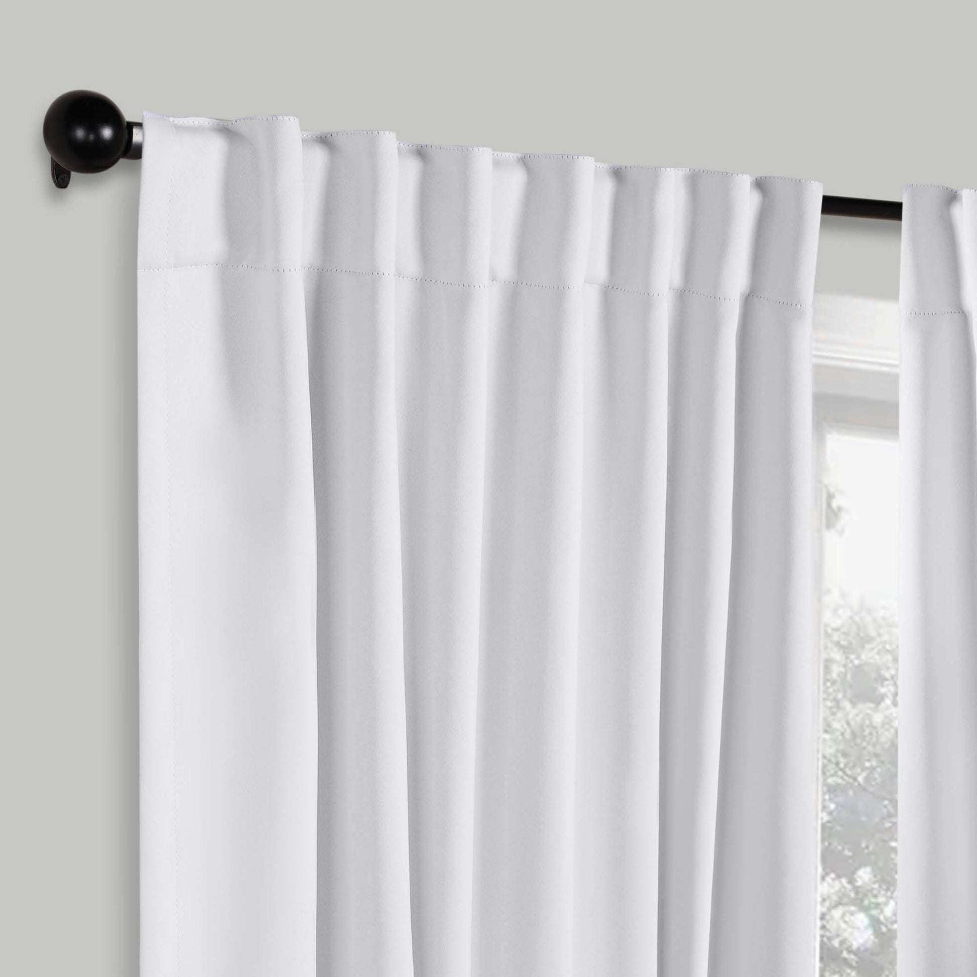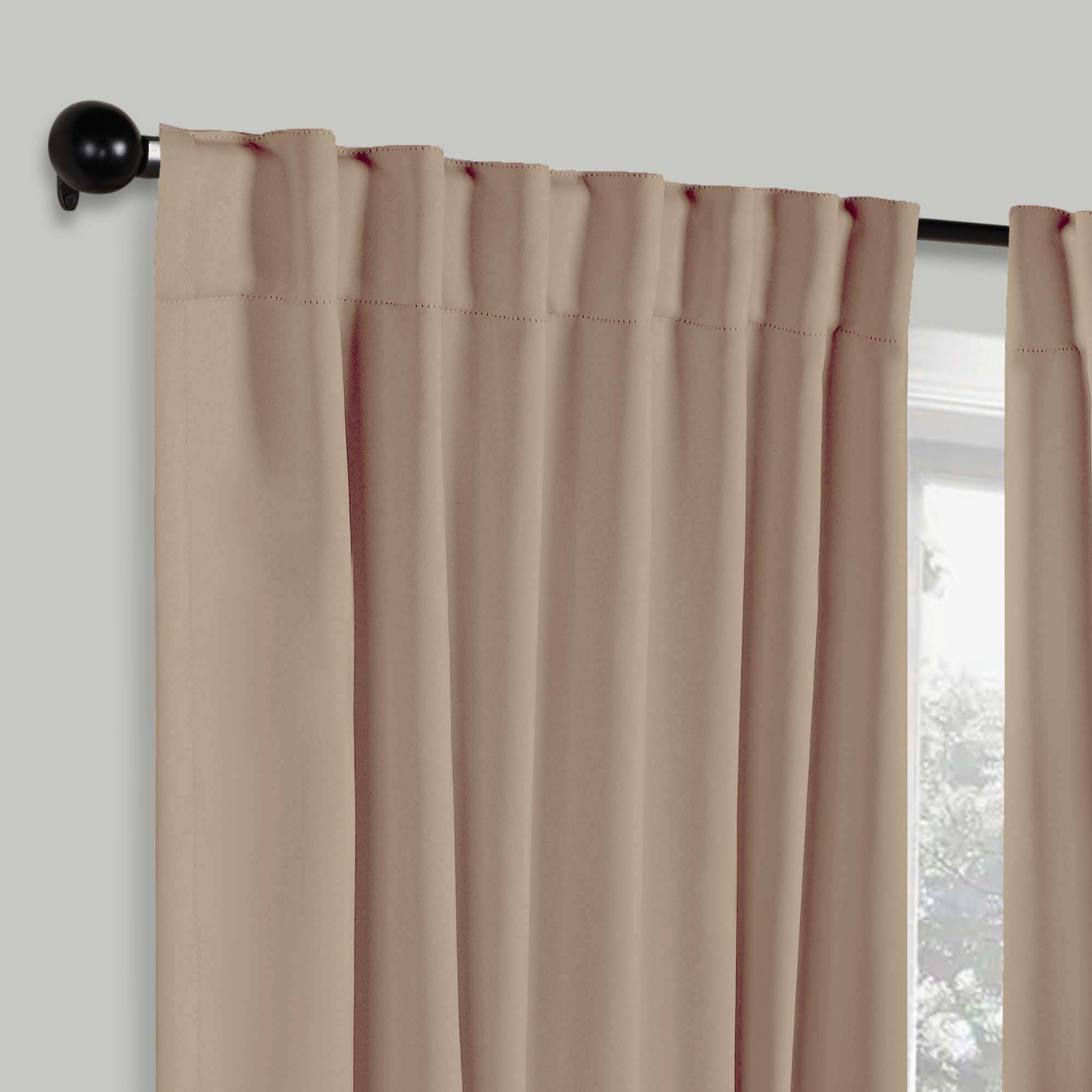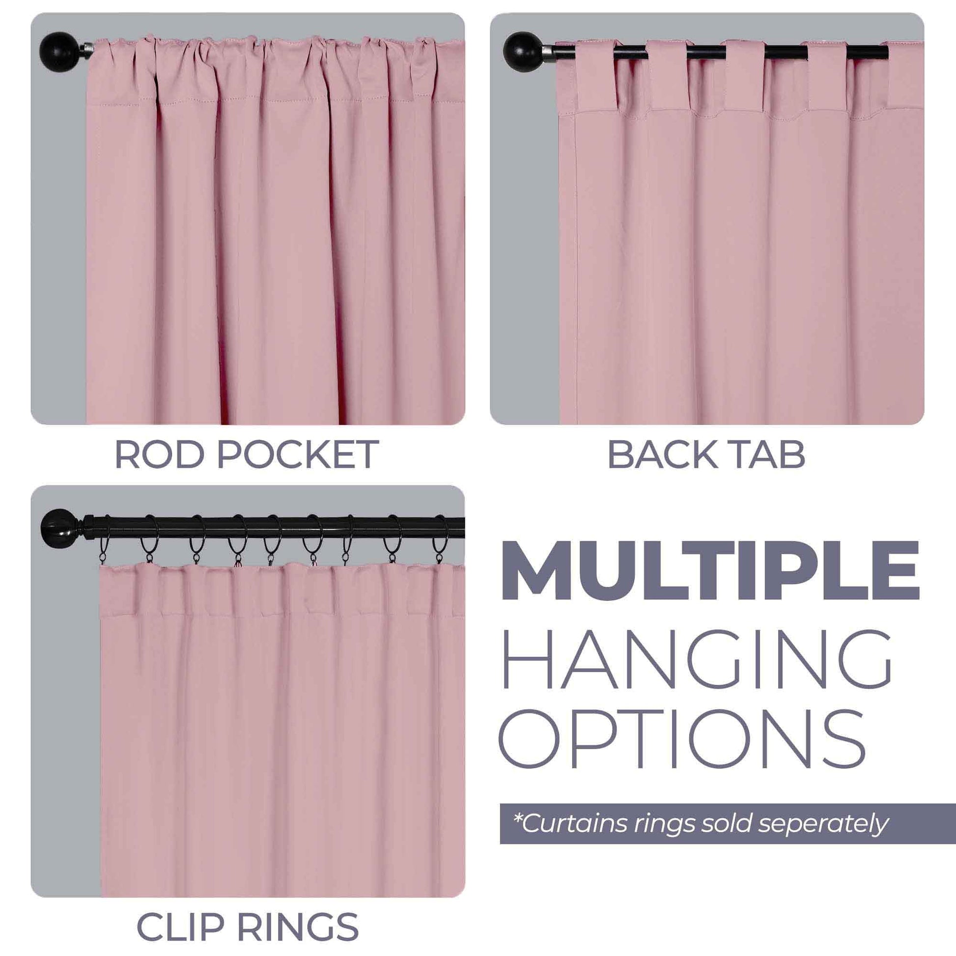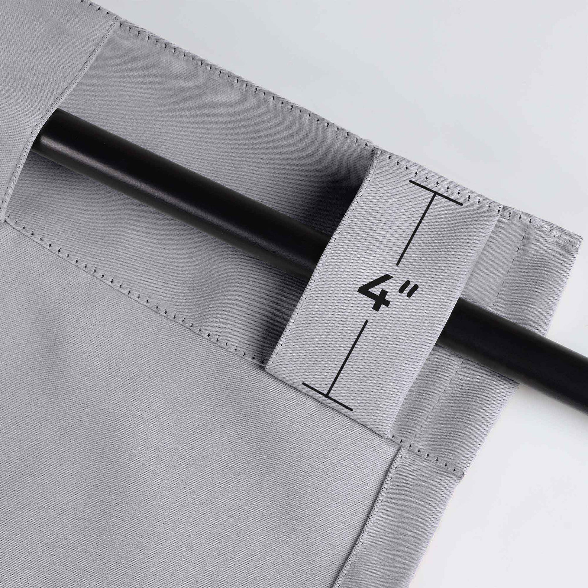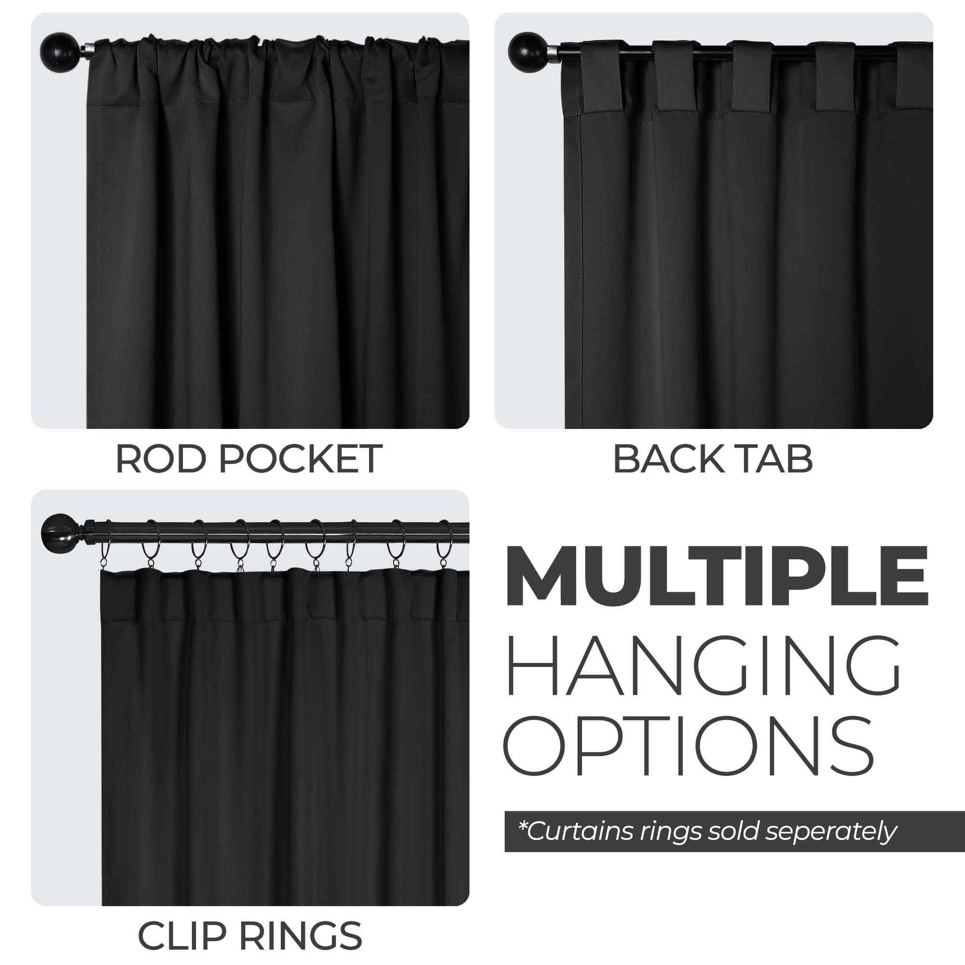 - Additional Features: 4” back tab header offers three stylish installation options: neat and streamlined back tabs, a rod pocket, or the ability to attach clip rings (sold separately). Blocks up to 70-80% sunlight and UV rays, helps reduce noise, and provides optimal privacy. Energy efficient and thermal insulating; Reduces room heat and cold loss through window to maintain cozy room temperature.