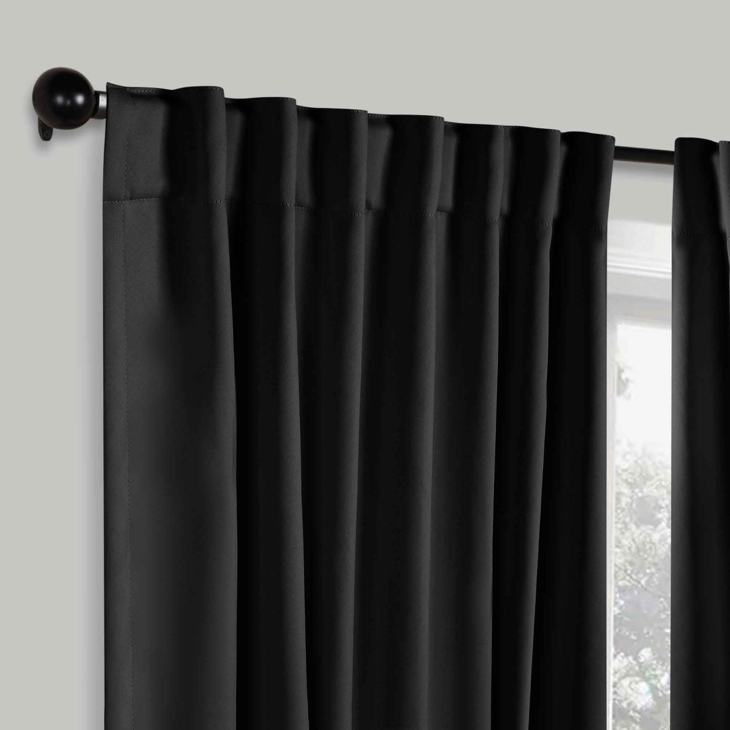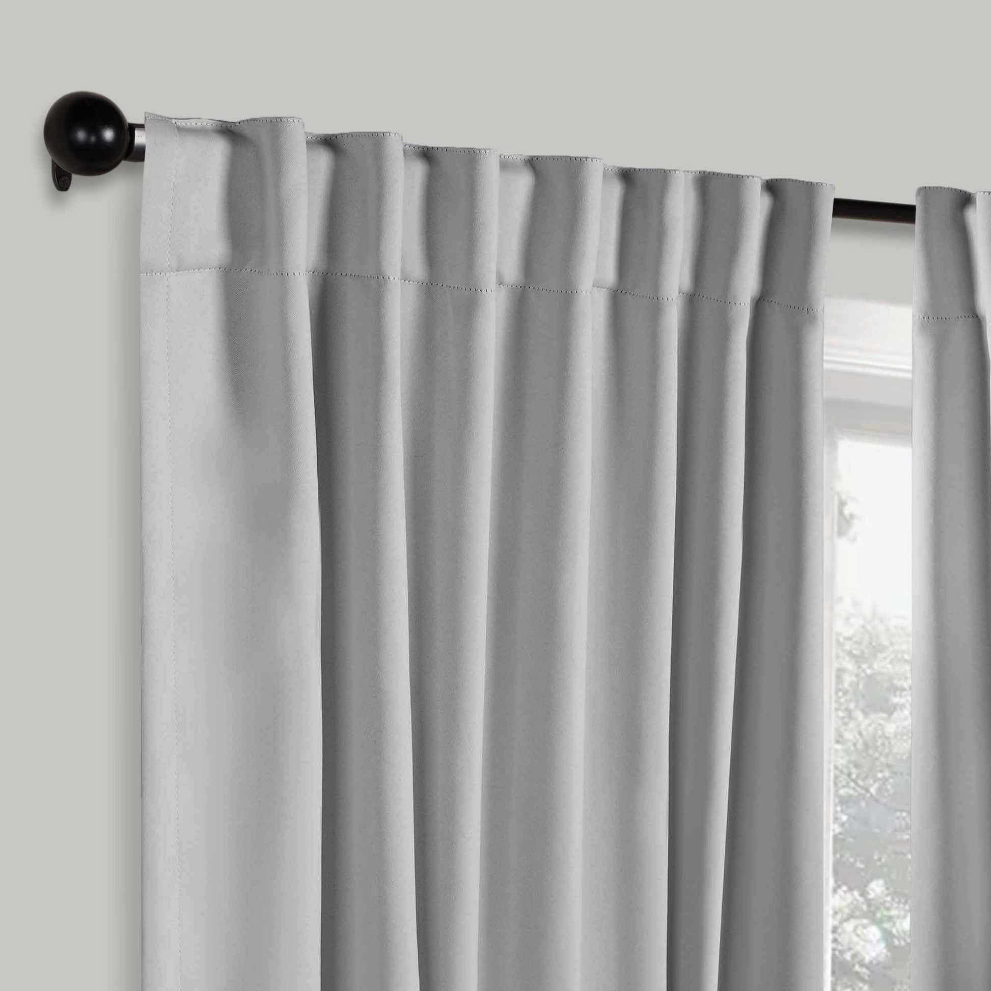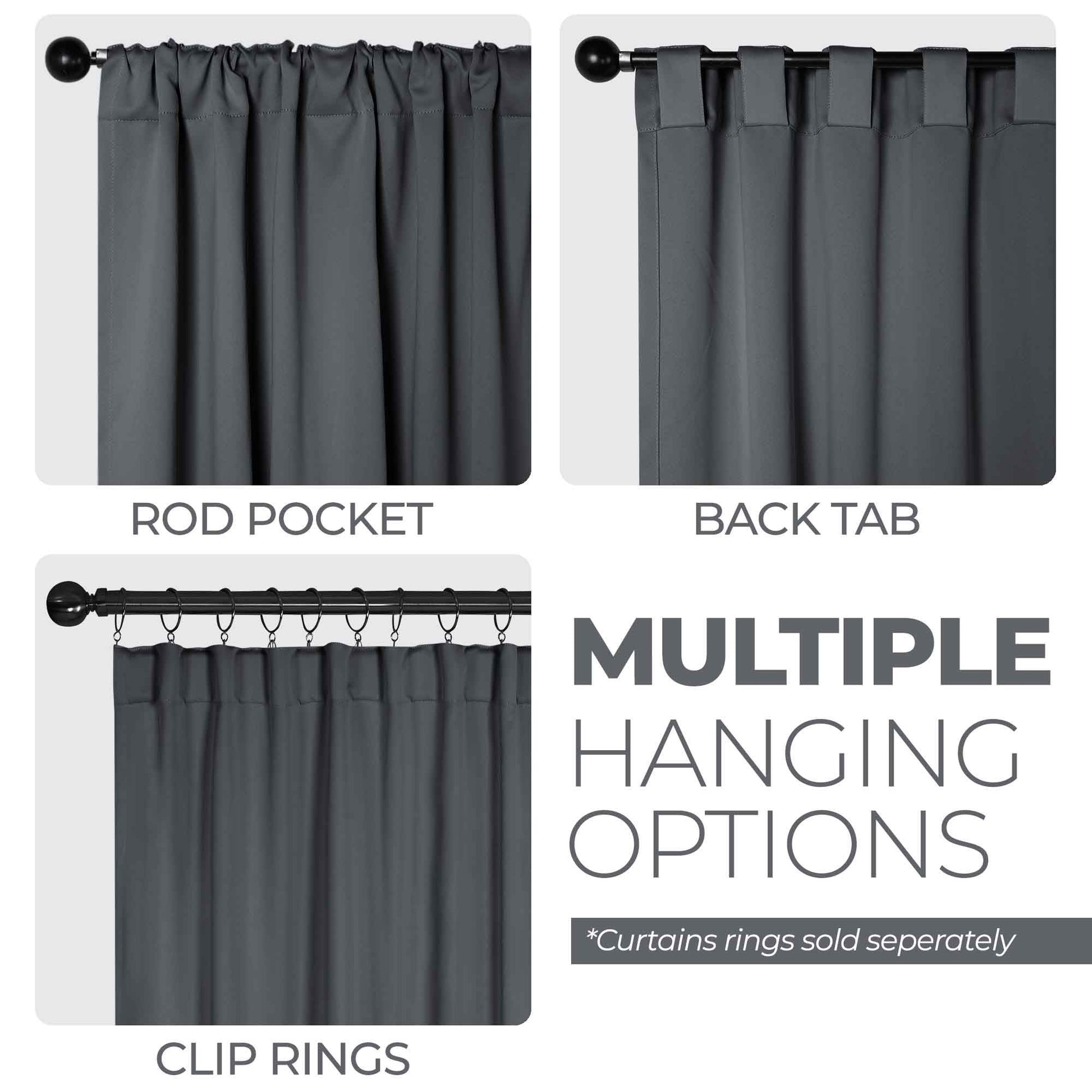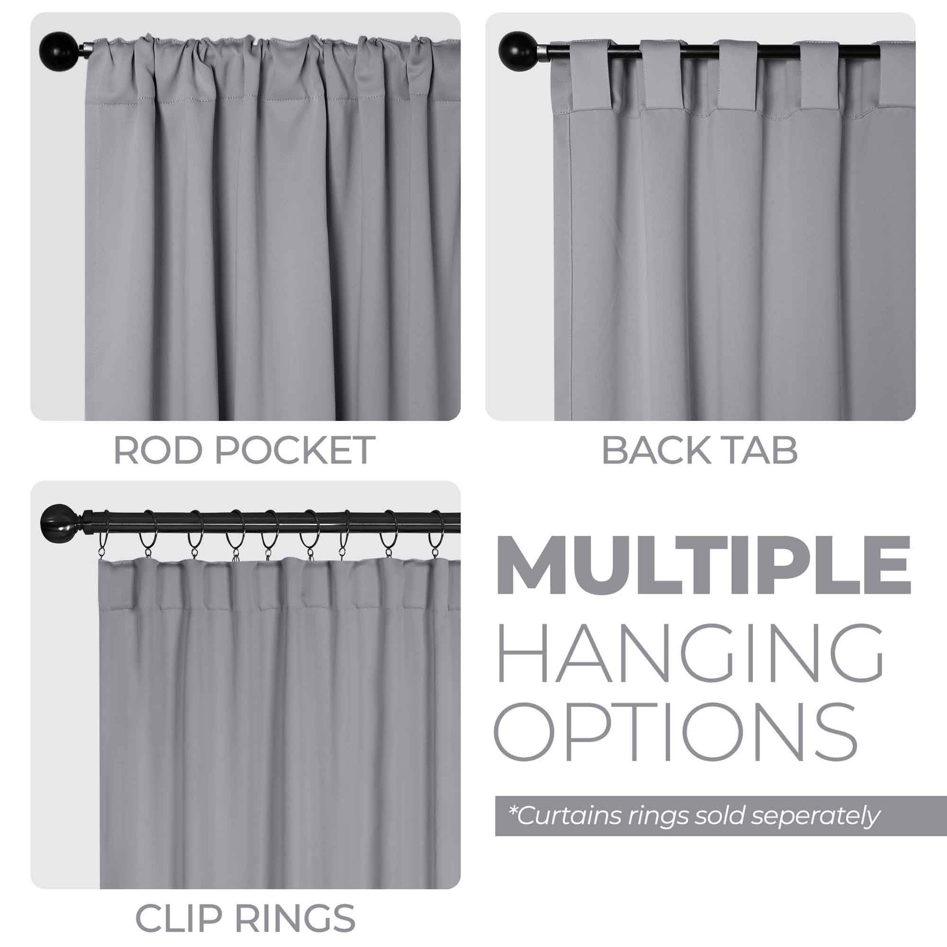 - Additional Features: 4” back tab header offers three stylish installation options: neat and streamlined back tabs, a rod pocket, or the ability to attach clip rings (sold separately). Blocks up to 70-80% sunlight and UV rays, helps reduce noise, and provides optimal privacy. Energy efficient and thermal insulating; Reduces room heat and cold loss through window to maintain cozy room temperature.