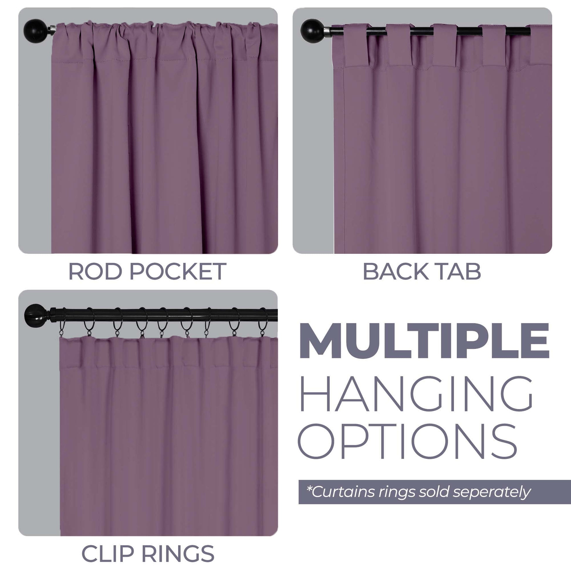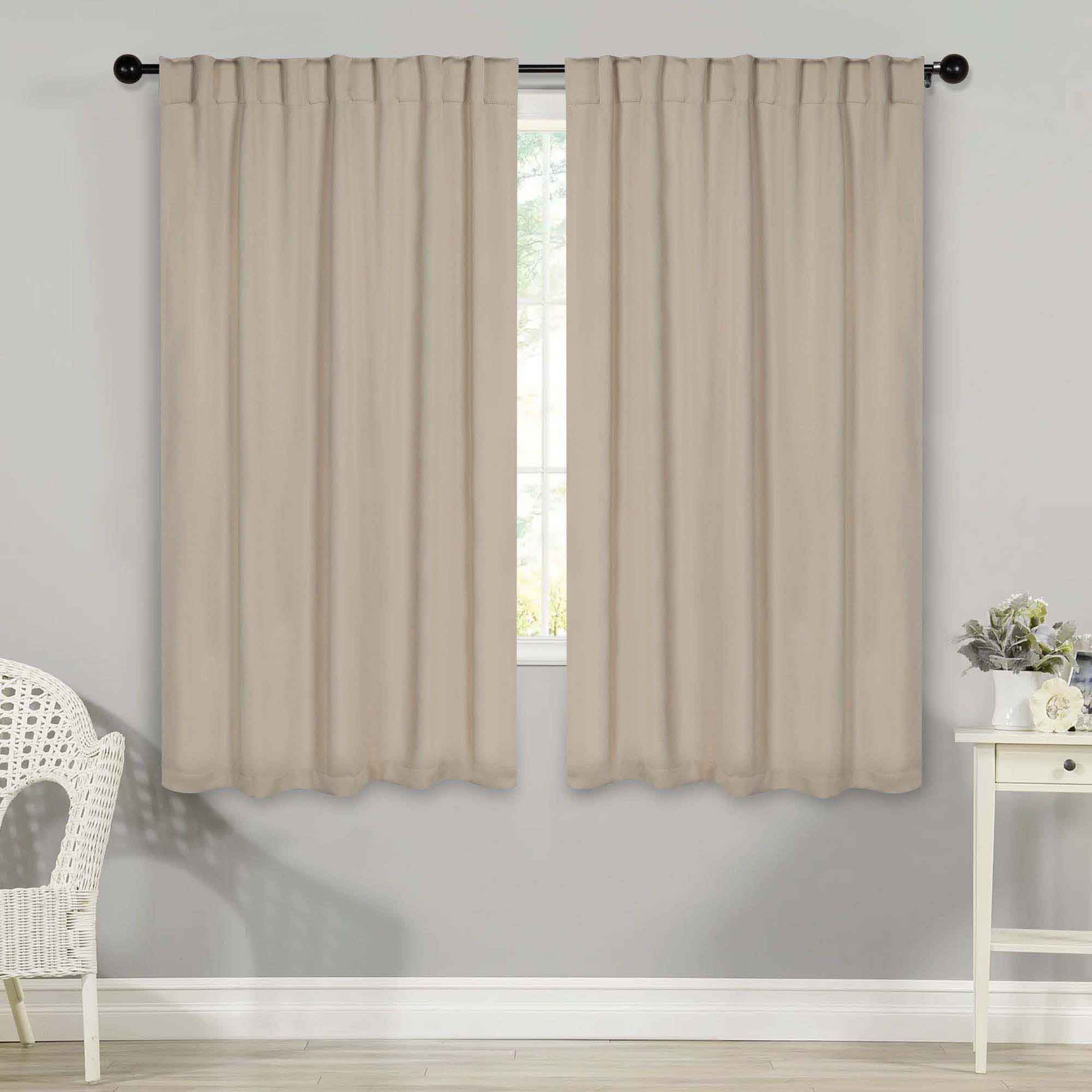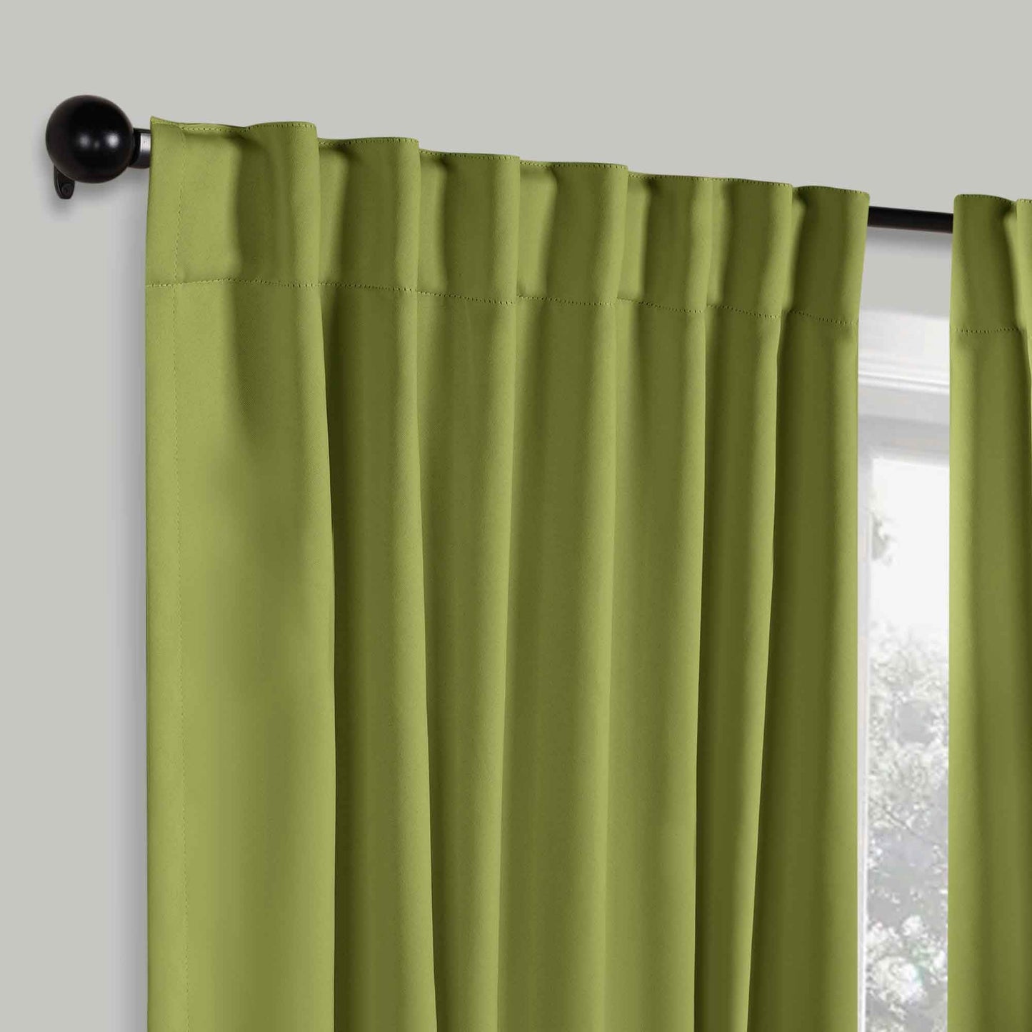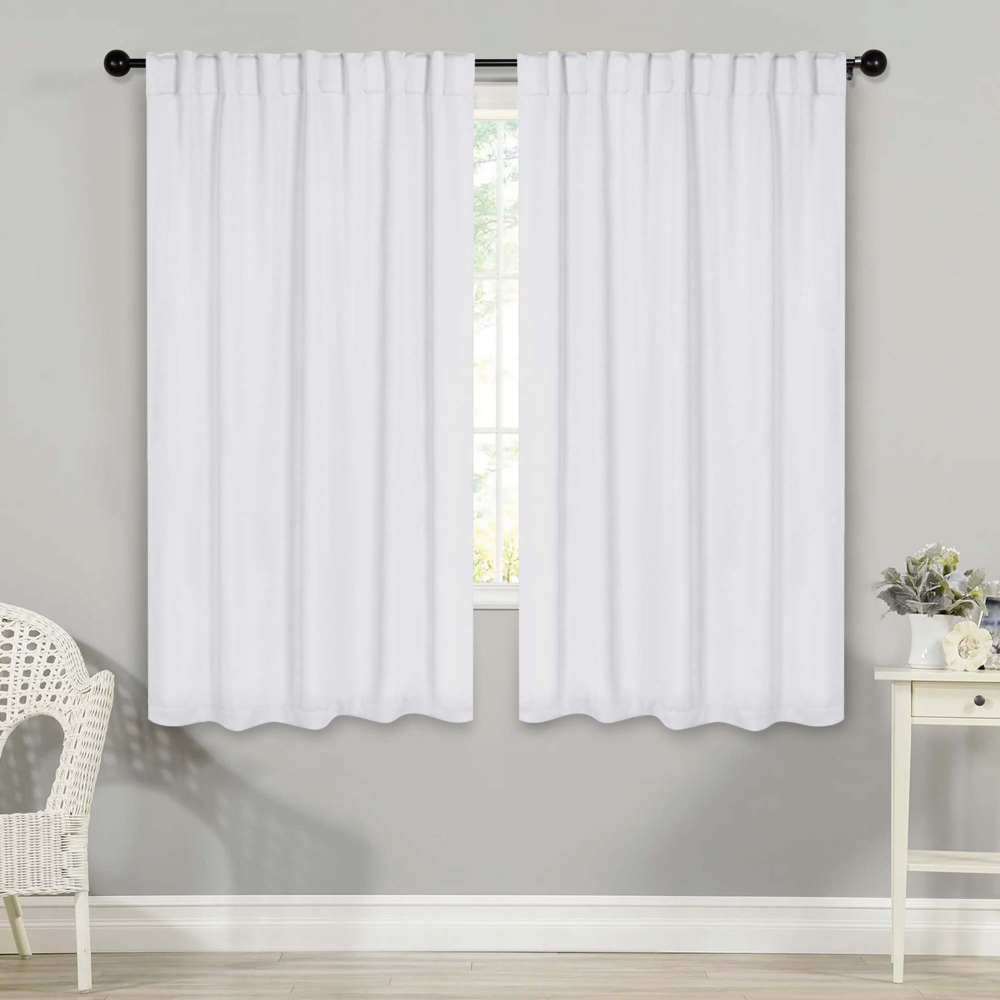 - Additional Features: 4” back tab header offers three stylish installation options: neat and streamlined back tabs, a rod pocket, or the ability to attach clip rings (sold separately). Blocks up to 70-80% sunlight and UV rays, helps reduce noise, and provides optimal privacy. Energy efficient and thermal insulating; Reduces room heat and cold loss through window to maintain cozy room temperature.