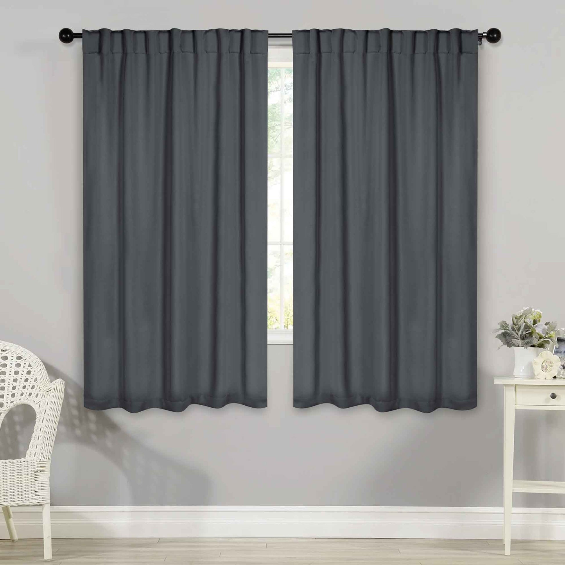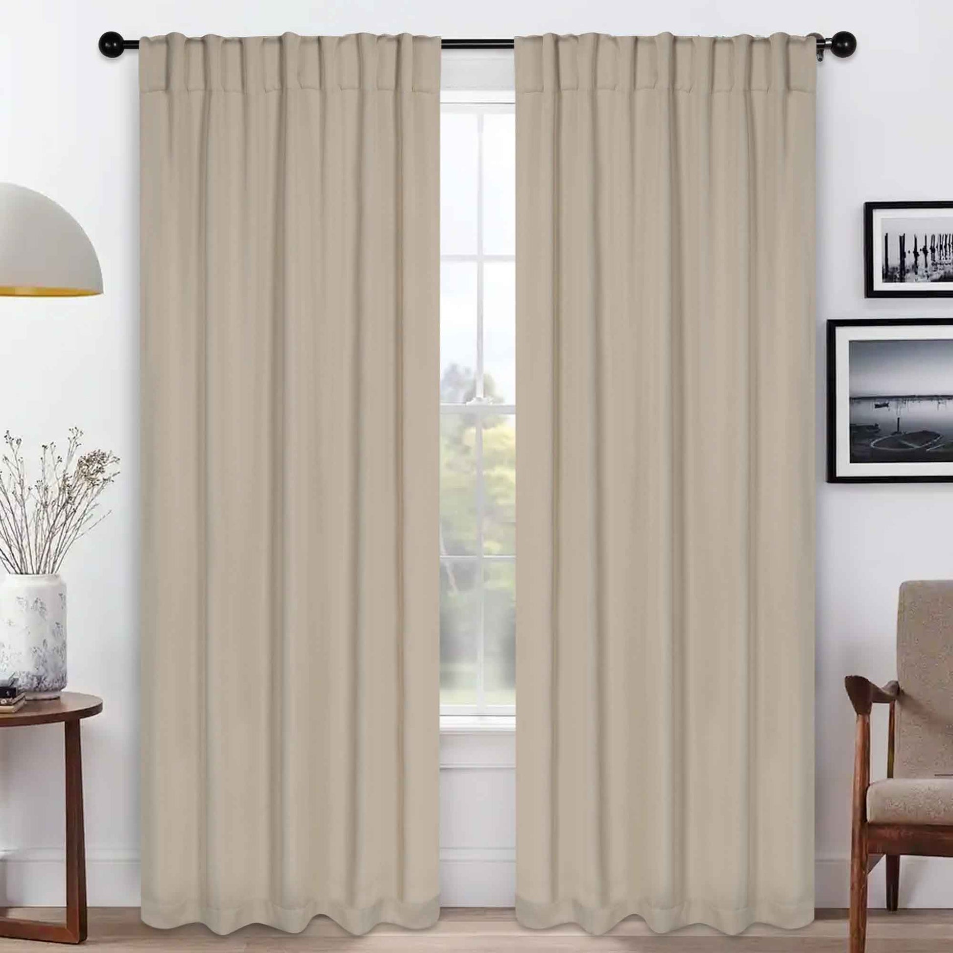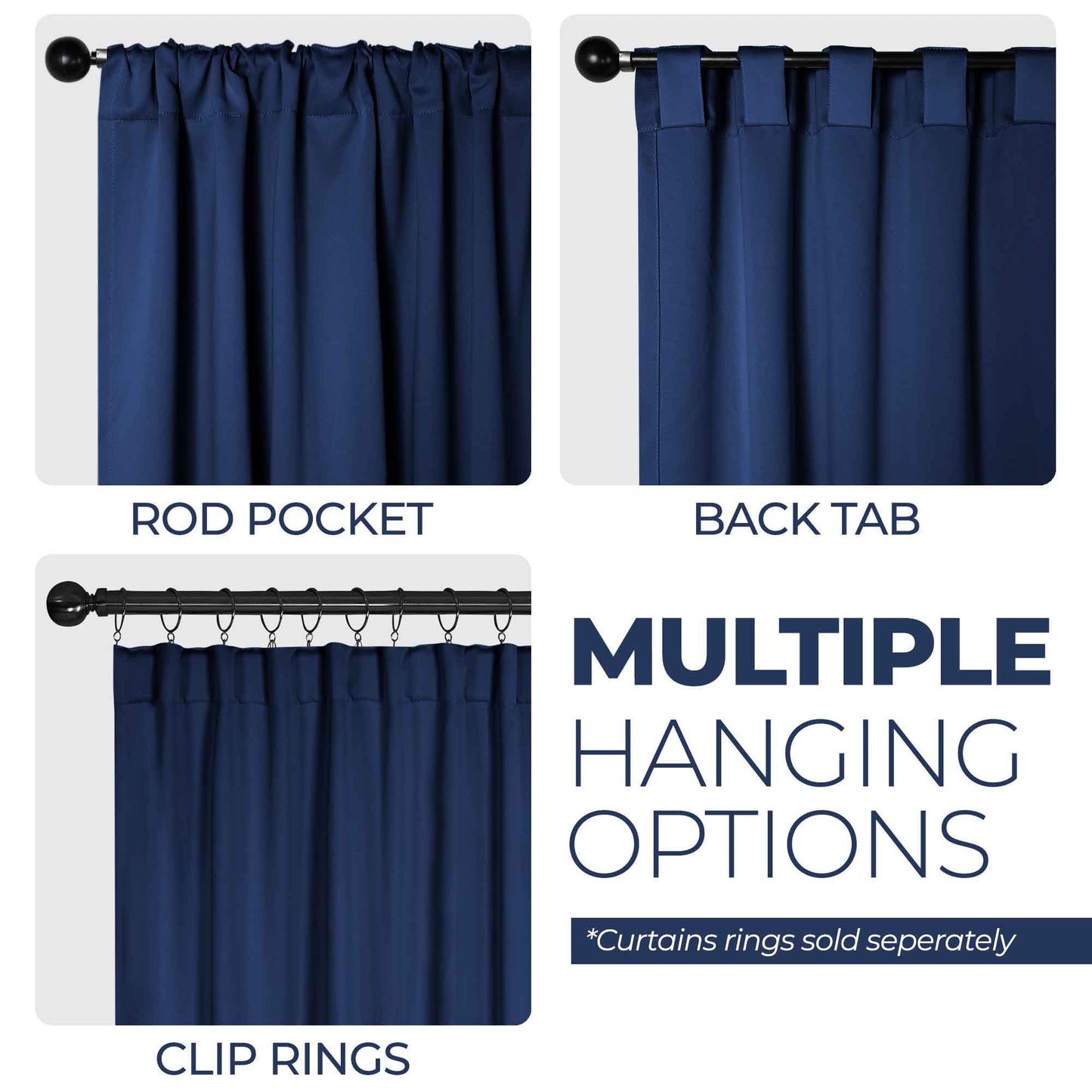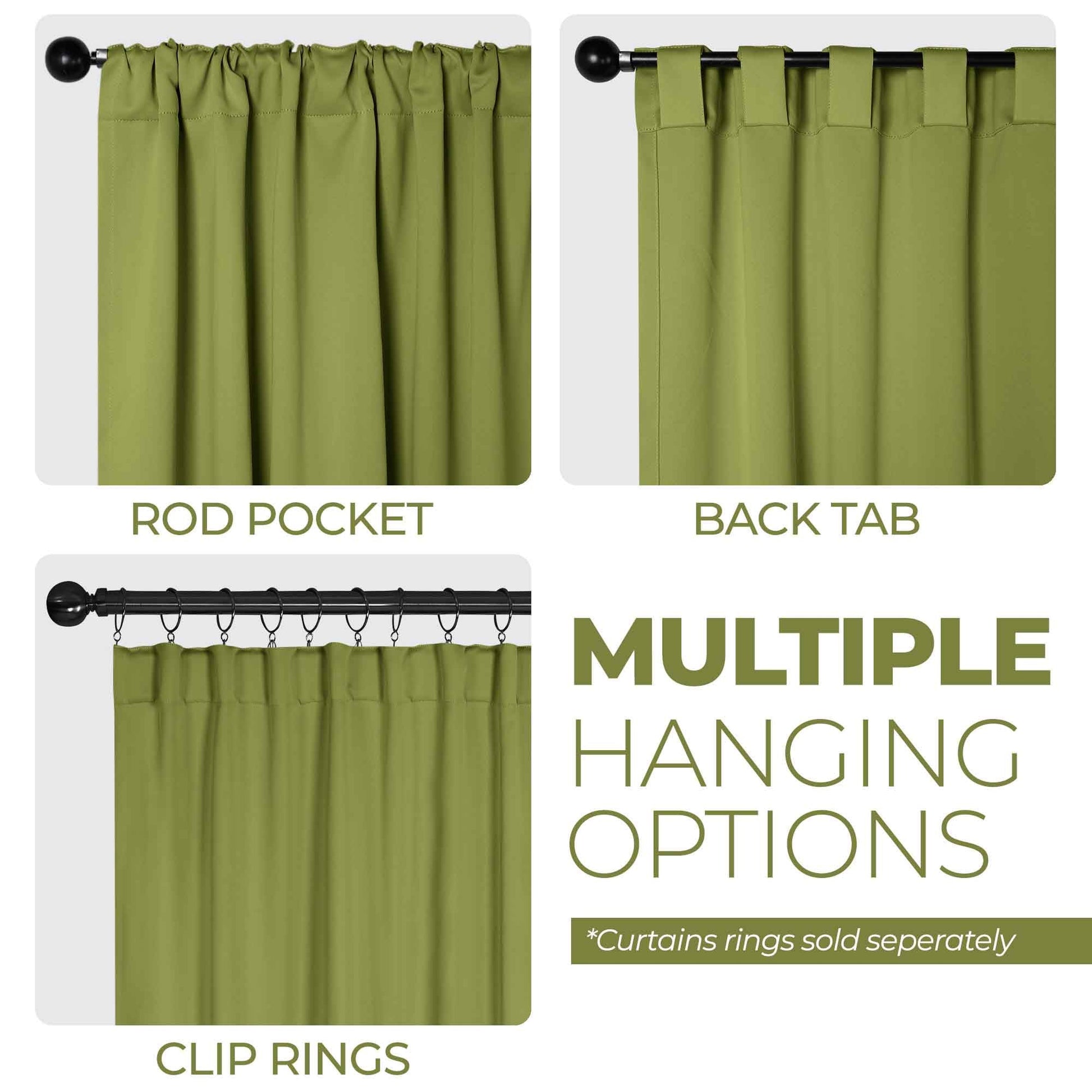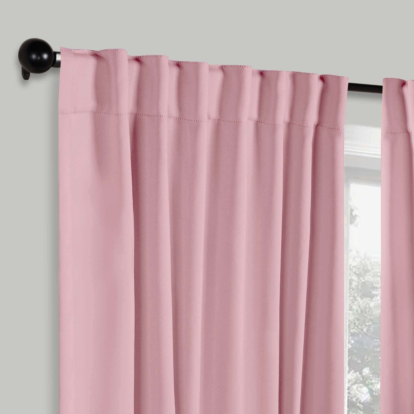 - Additional Features: 4” back tab header offers three stylish installation options: neat and streamlined back tabs, a rod pocket, or the ability to attach clip rings (sold separately). Blocks up to 70-80% sunlight and UV rays, helps reduce noise, and provides optimal privacy. Energy efficient and thermal insulating; Reduces room heat and cold loss through window to maintain cozy room temperature.