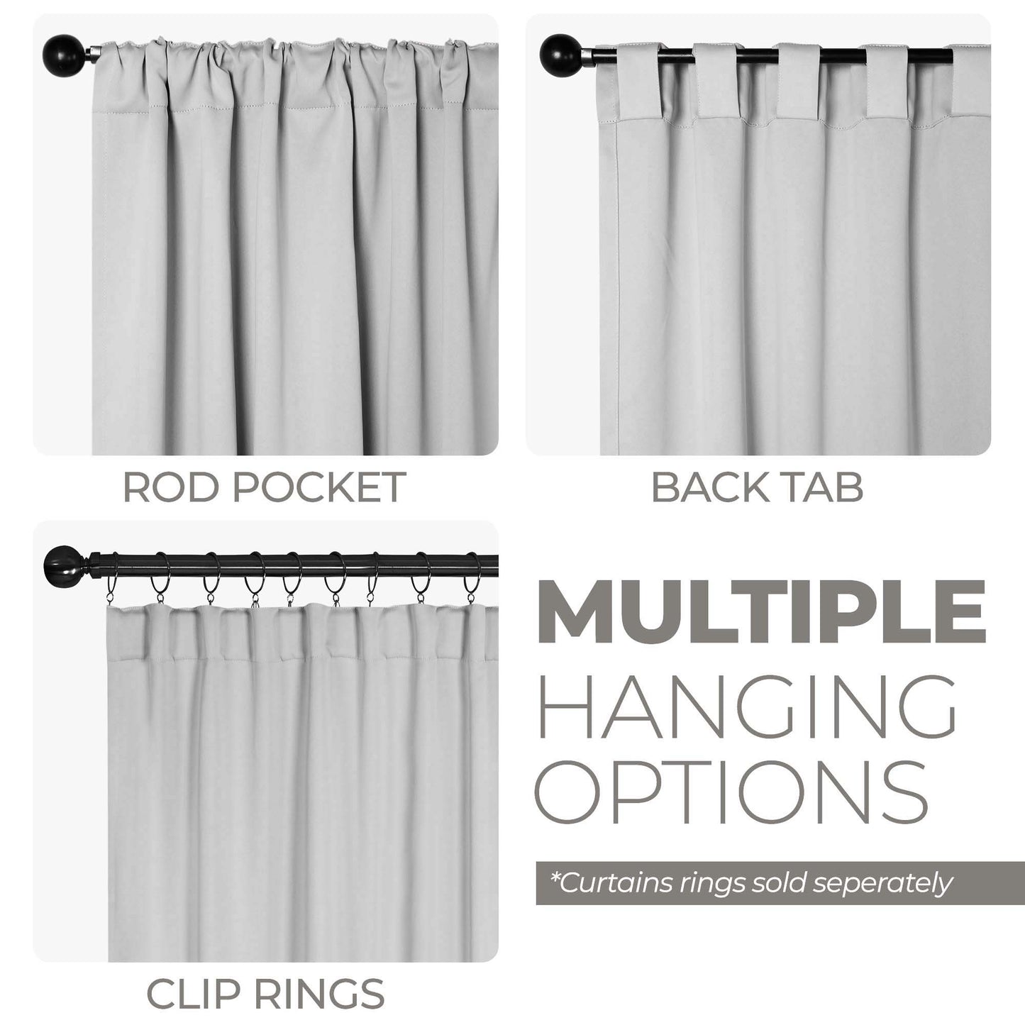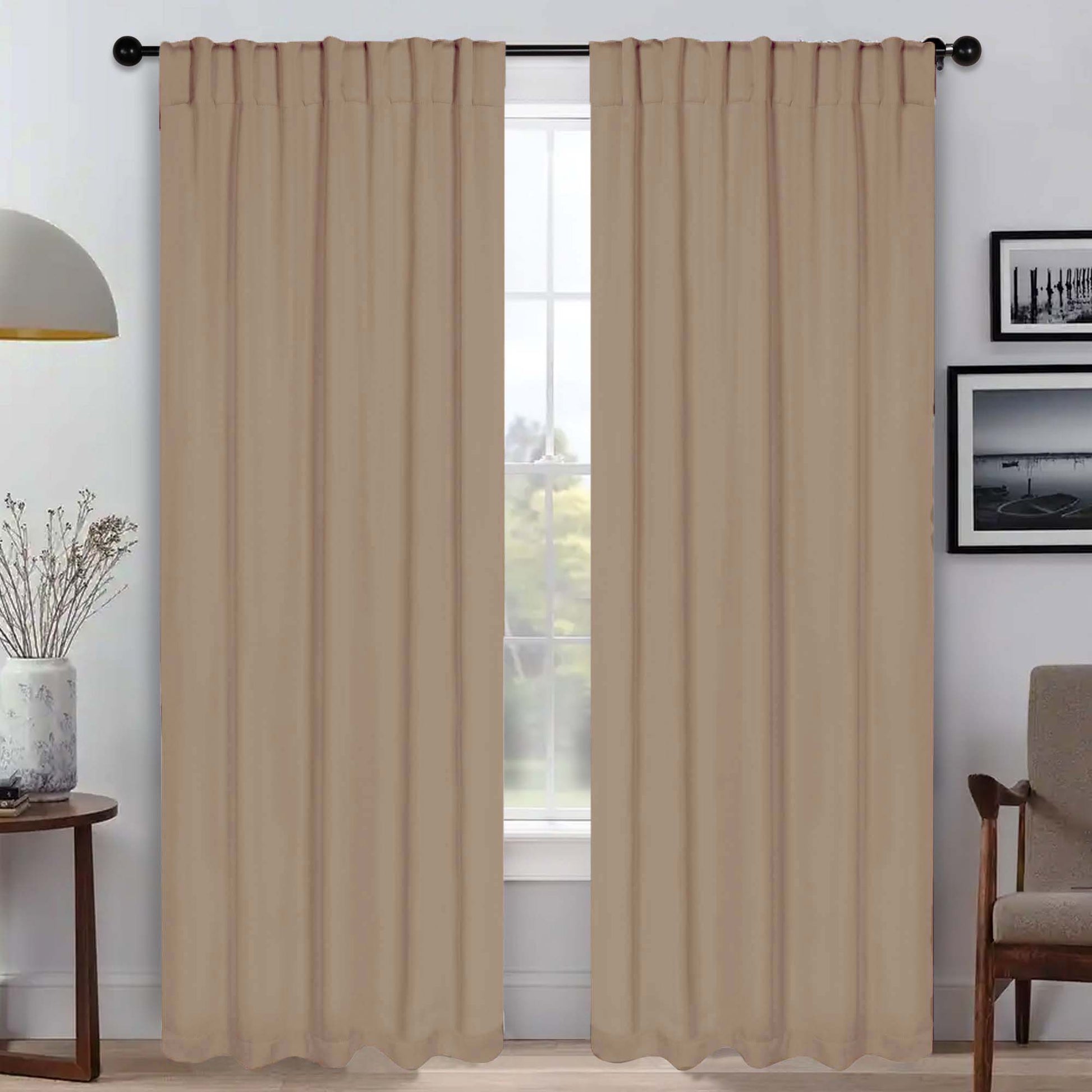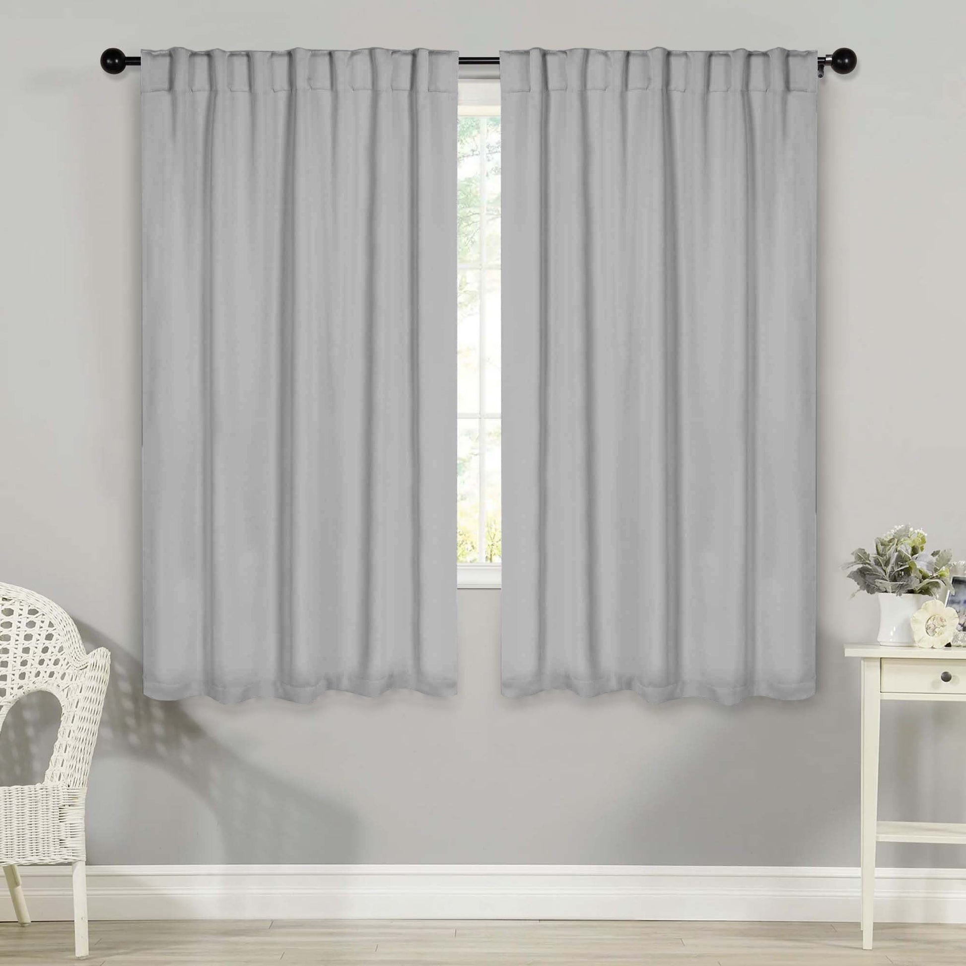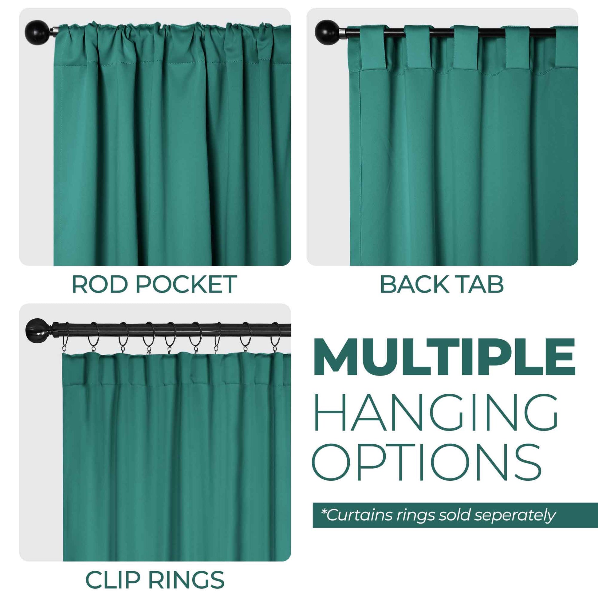 - Additional Features: 4” back tab header offers three stylish installation options: neat and streamlined back tabs, a rod pocket, or the ability to attach clip rings (sold separately). Blocks up to 70-80% sunlight and UV rays, helps reduce noise, and provides optimal privacy. Energy efficient and thermal insulating; Reduces room heat and cold loss through window to maintain cozy room temperature.