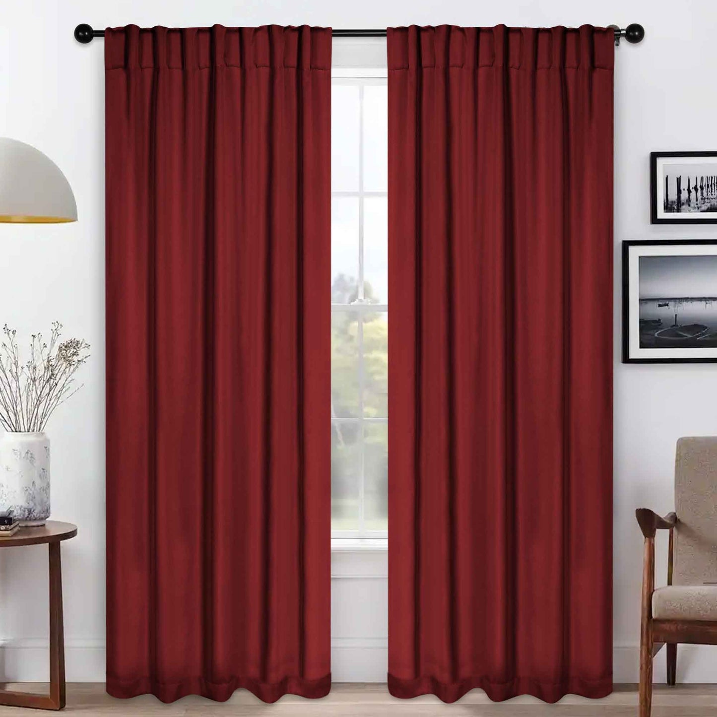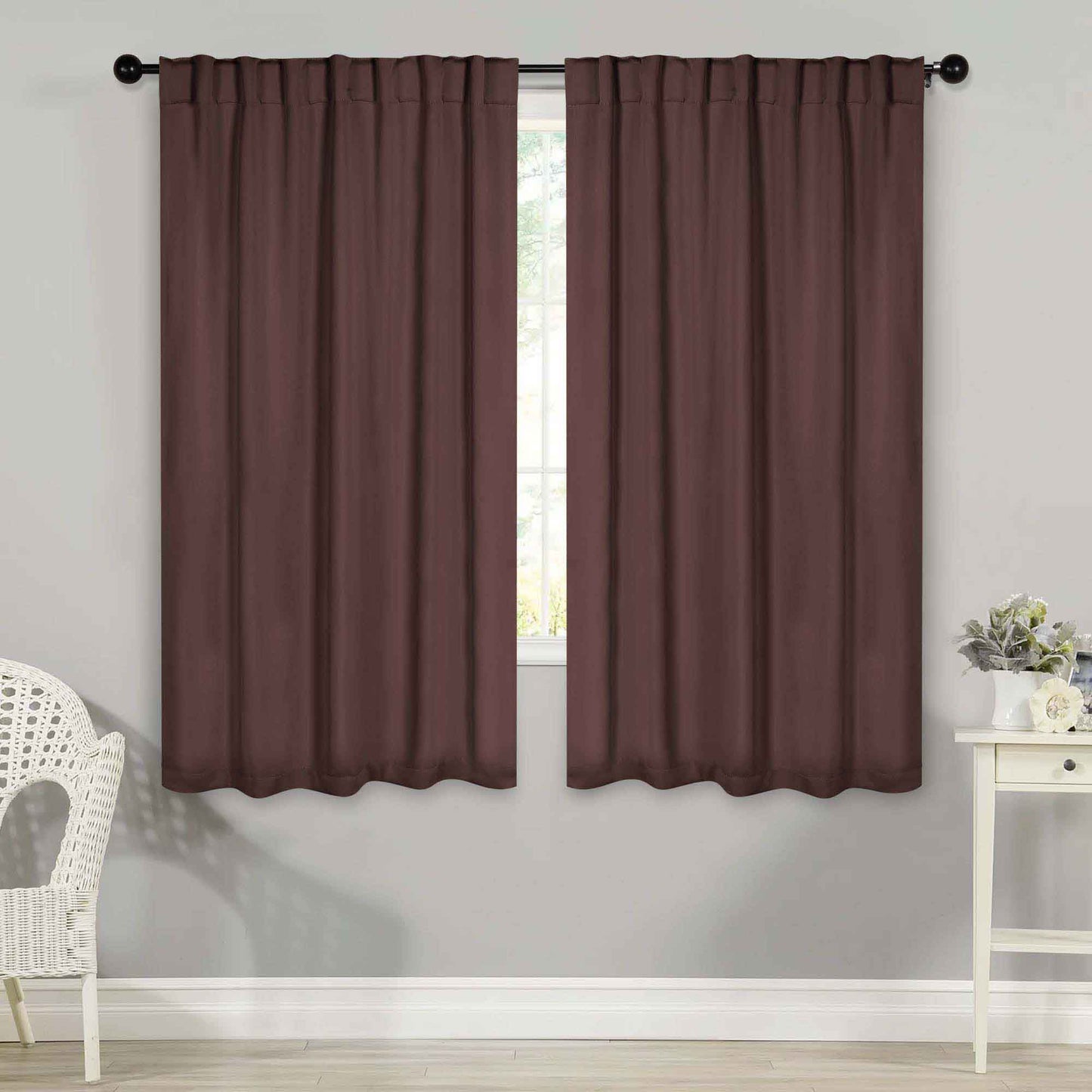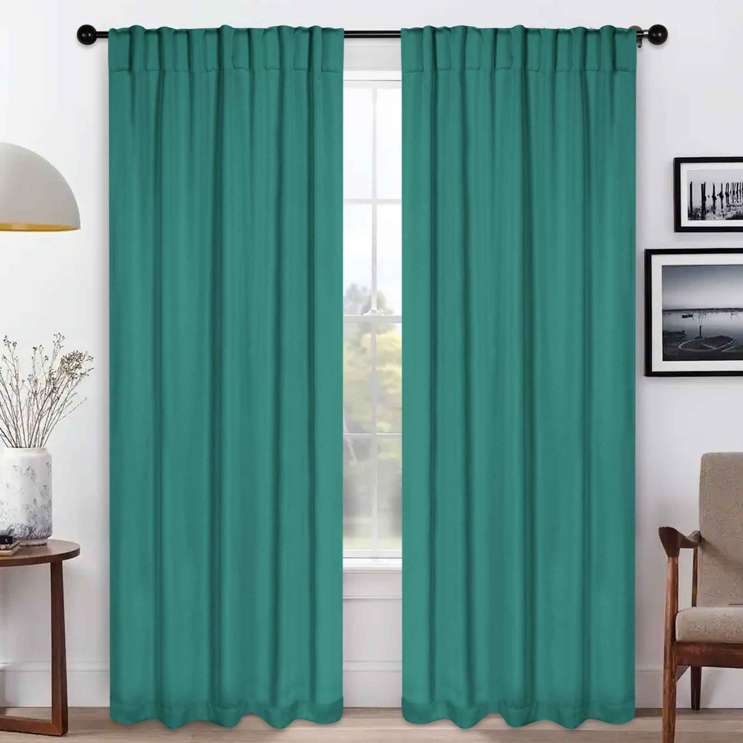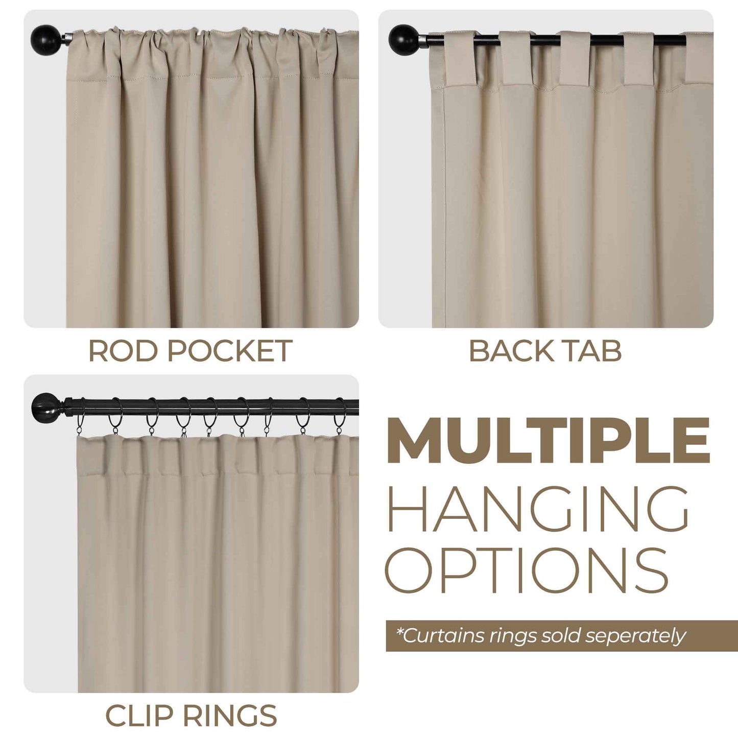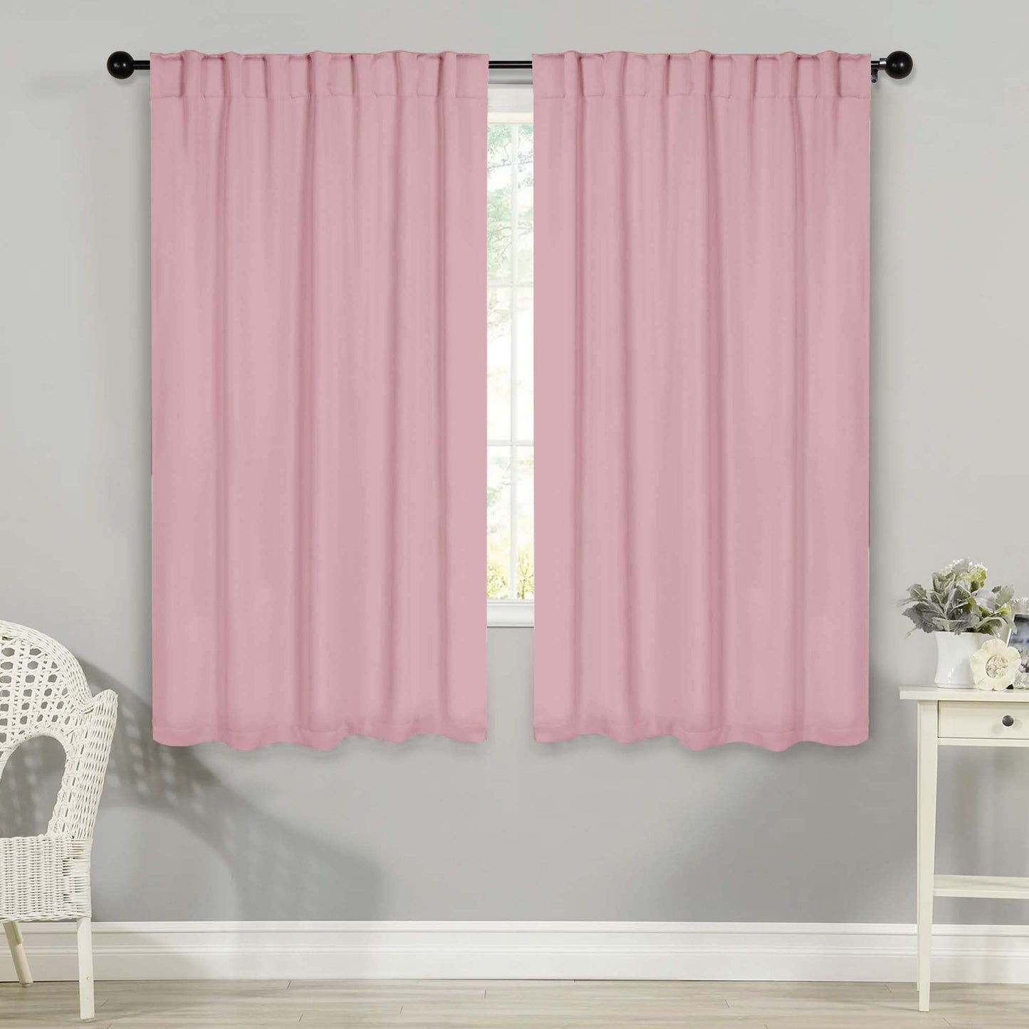 - Additional Features: 4” back tab header offers three stylish installation options: neat and streamlined back tabs, a rod pocket, or the ability to attach clip rings (sold separately). Blocks up to 70-80% sunlight and UV rays, helps reduce noise, and provides optimal privacy. Energy efficient and thermal insulating; Reduces room heat and cold loss through window to maintain cozy room temperature.