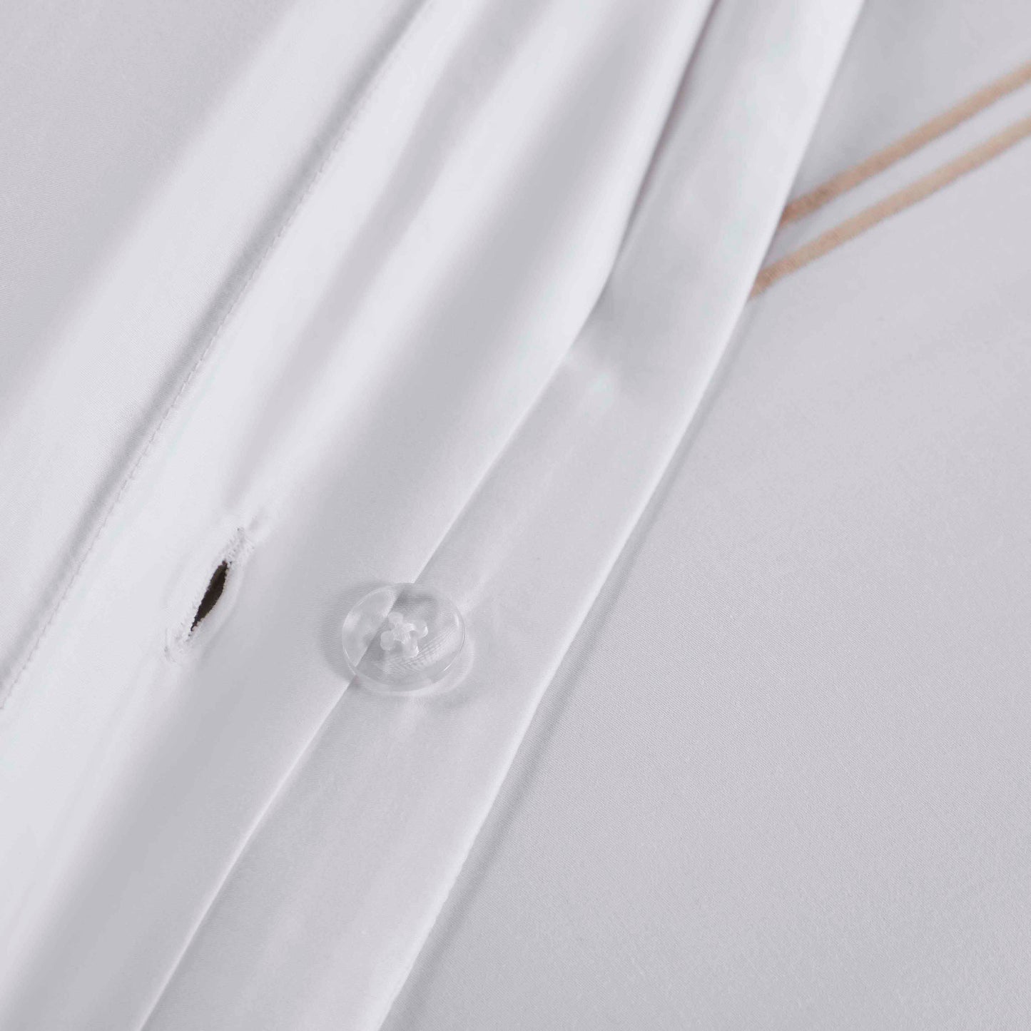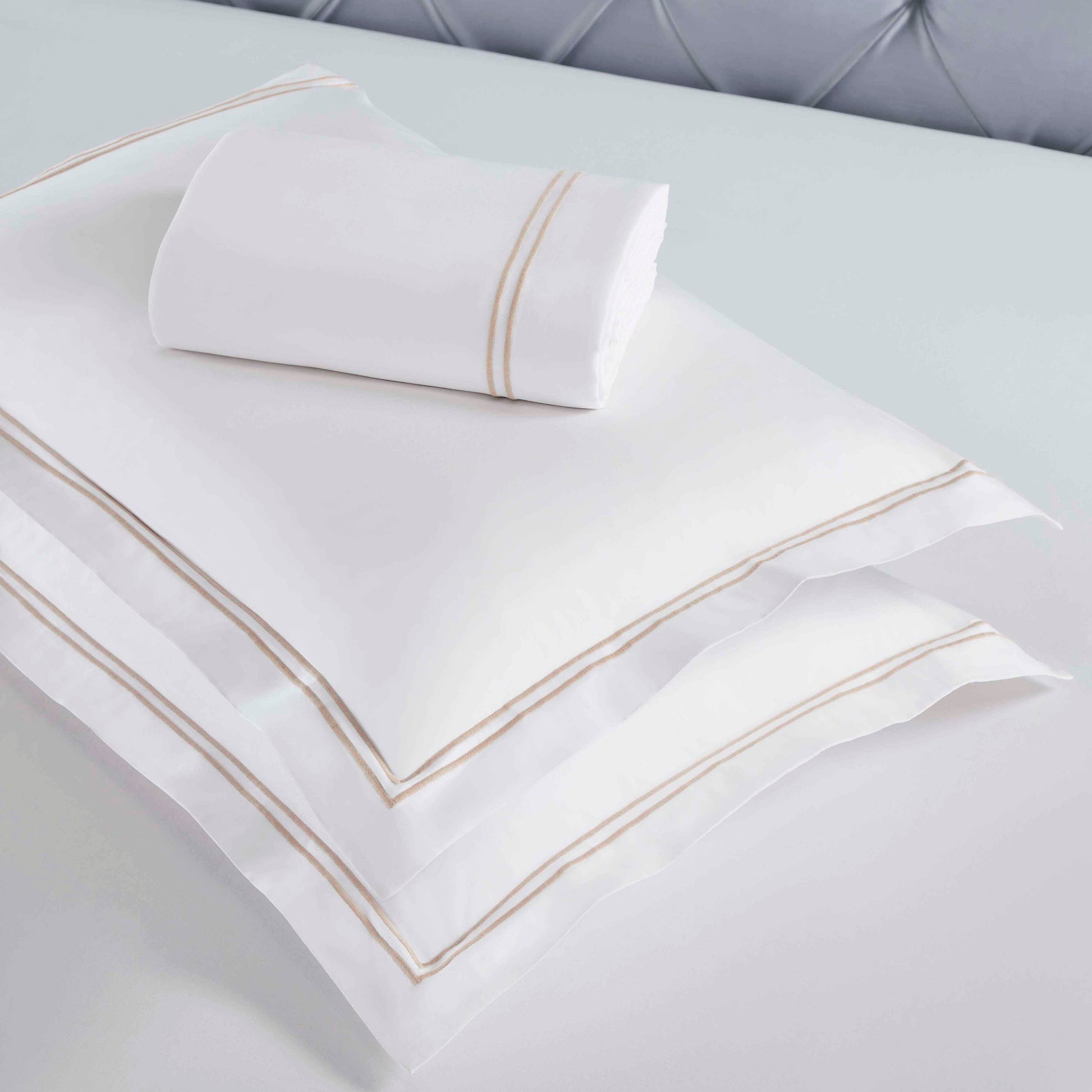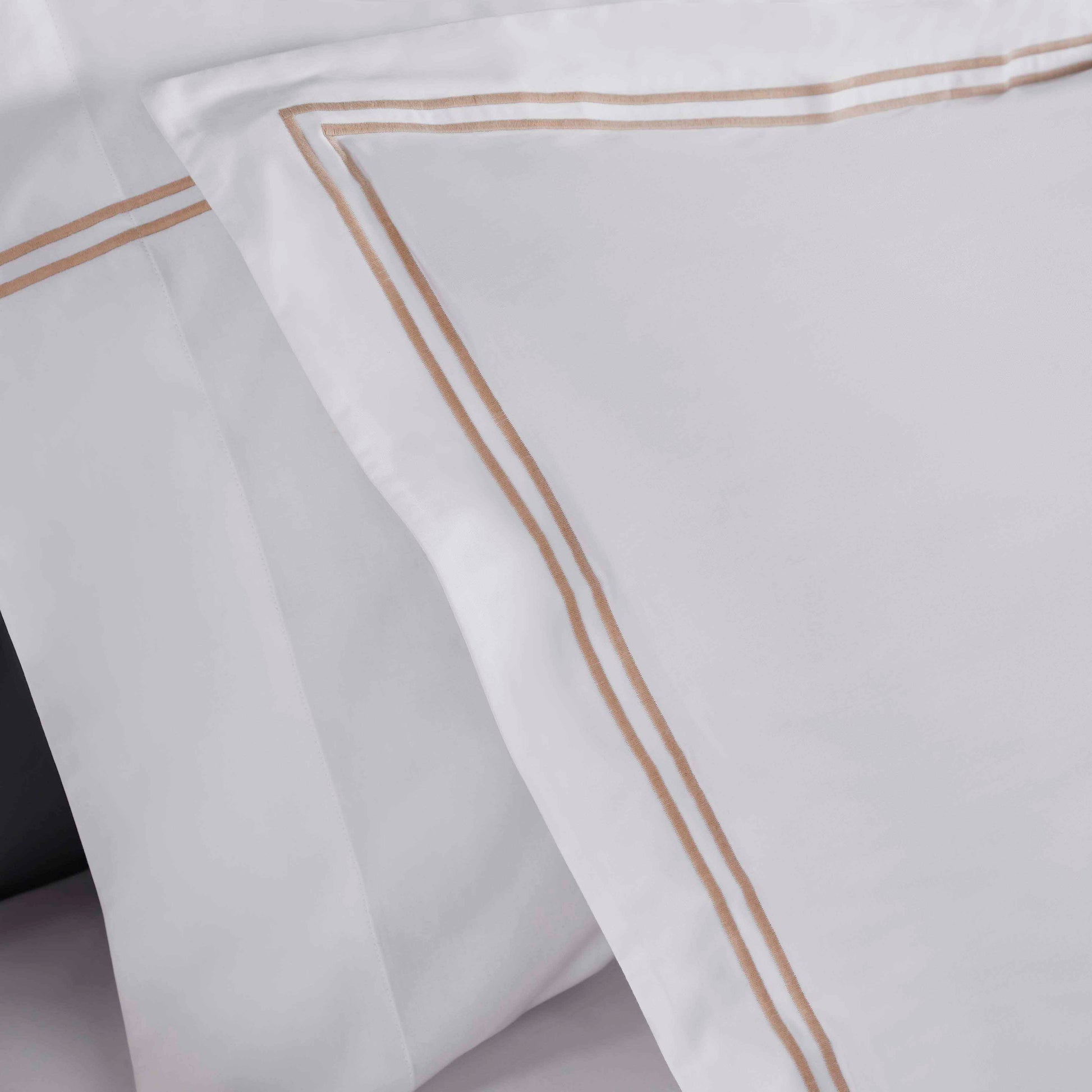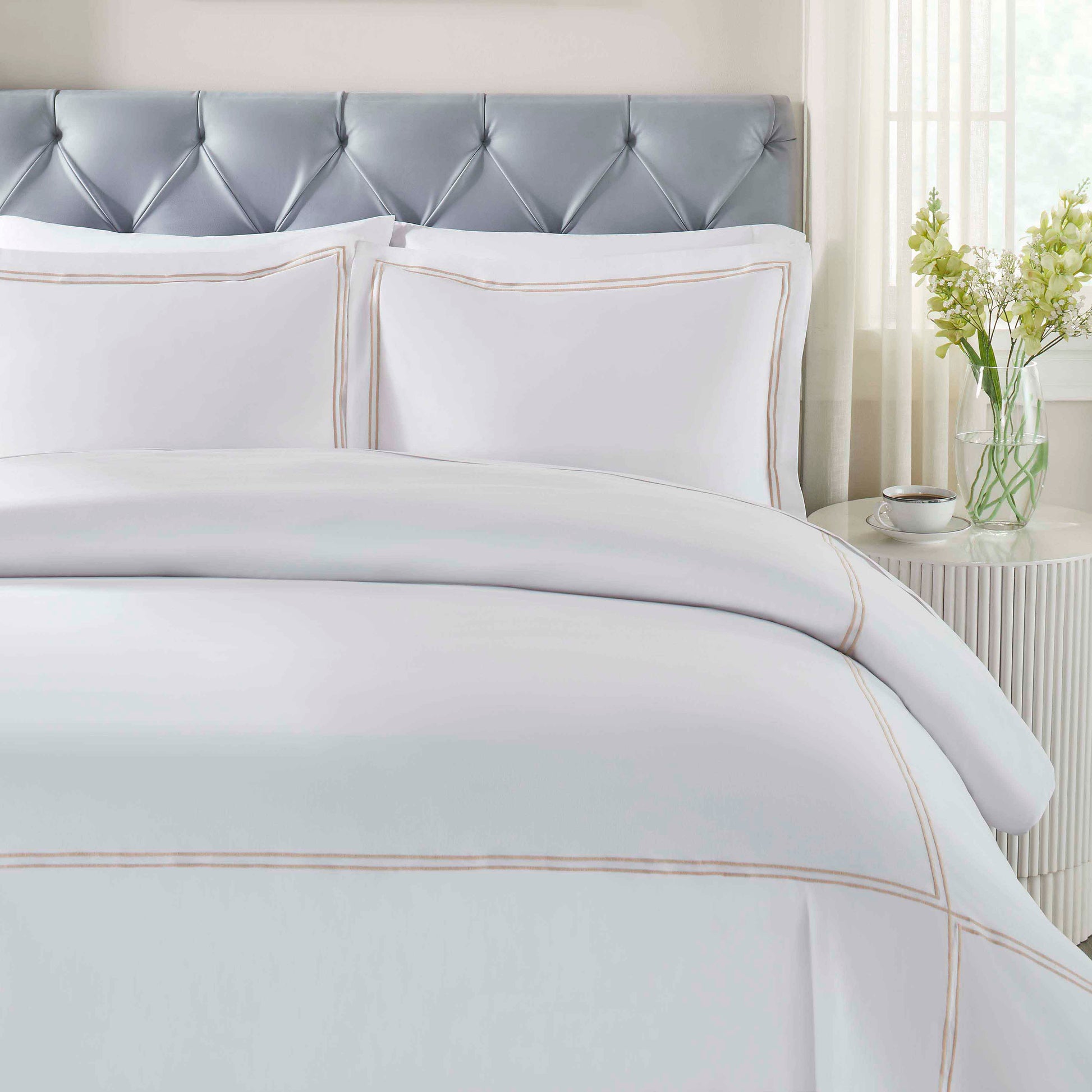 - Colors: Solid white with intricate two-lined taupe embroidery.