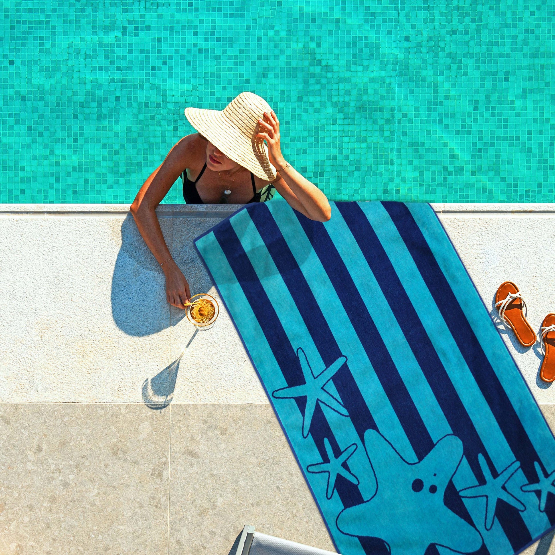 Have some fun in the sun with the Starfish Oversized Cotton Beach Towel. This lovely towel features soft velour on one side that repels water and sand and on the reverse, an absorbent terry keeps you cozy and warm. The large design keeps you cozy after swimming or sunbathing. This towel features premium Cotton construction and boasts several starfish swimming over a backdrop of blue stripes. Perfect for adults and kids alike, these beautiful towels are colorfast and machine washable.