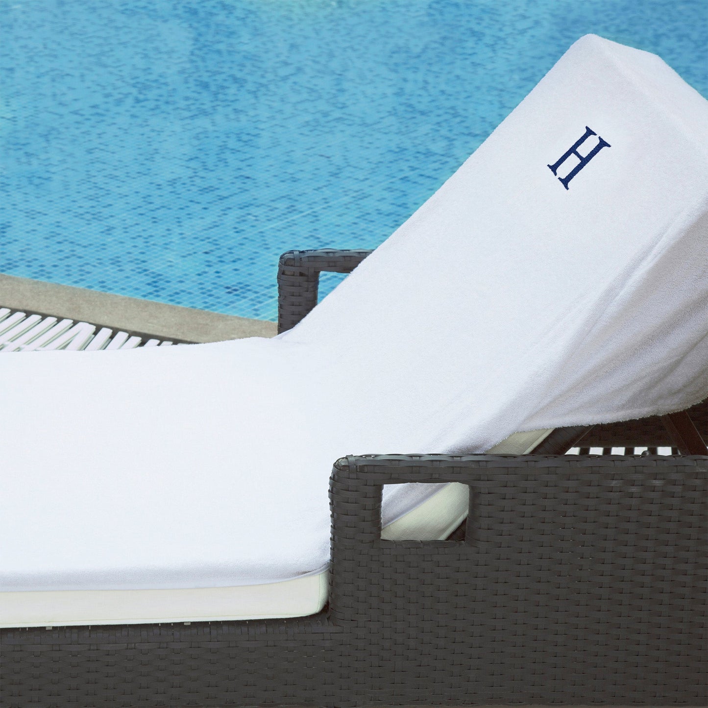 - STYLE: Woven from 100% premium cotton, this sturdy chaise cover is a perfect sunbathing accessory for your pool, spa, or beach; its terry towel surface is plush, absorbent,, and lightweight; classic monogram in blue pops on the pristine white backdrop