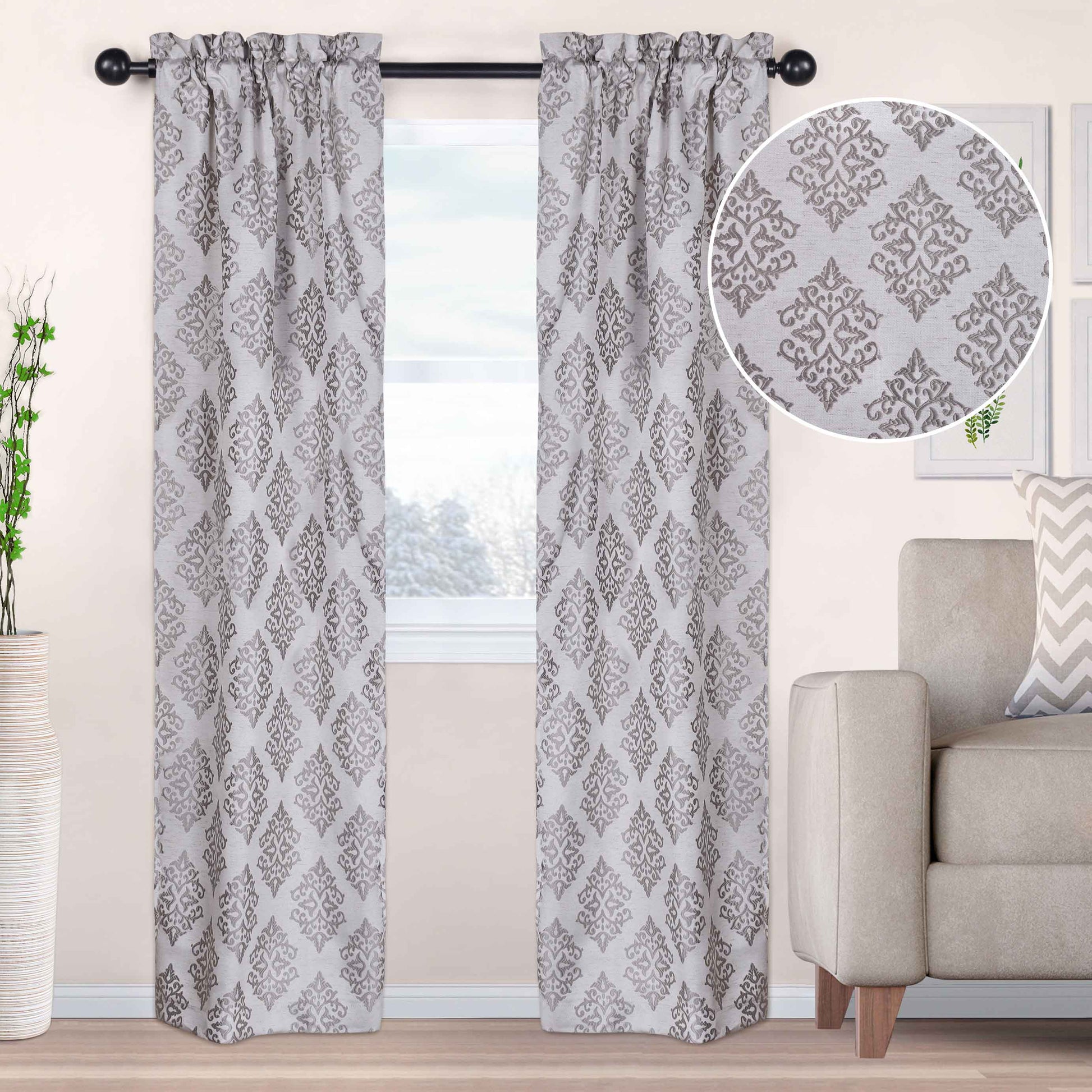 - Additional Features: Energy efficient; Reduces the amount of air exchange between a cold window and the rest of the room; Reduces room heat loss through window to maintain cozy room temperature. Thick embroidered jacquard design helps reduce noise and provides optimal privacy.
